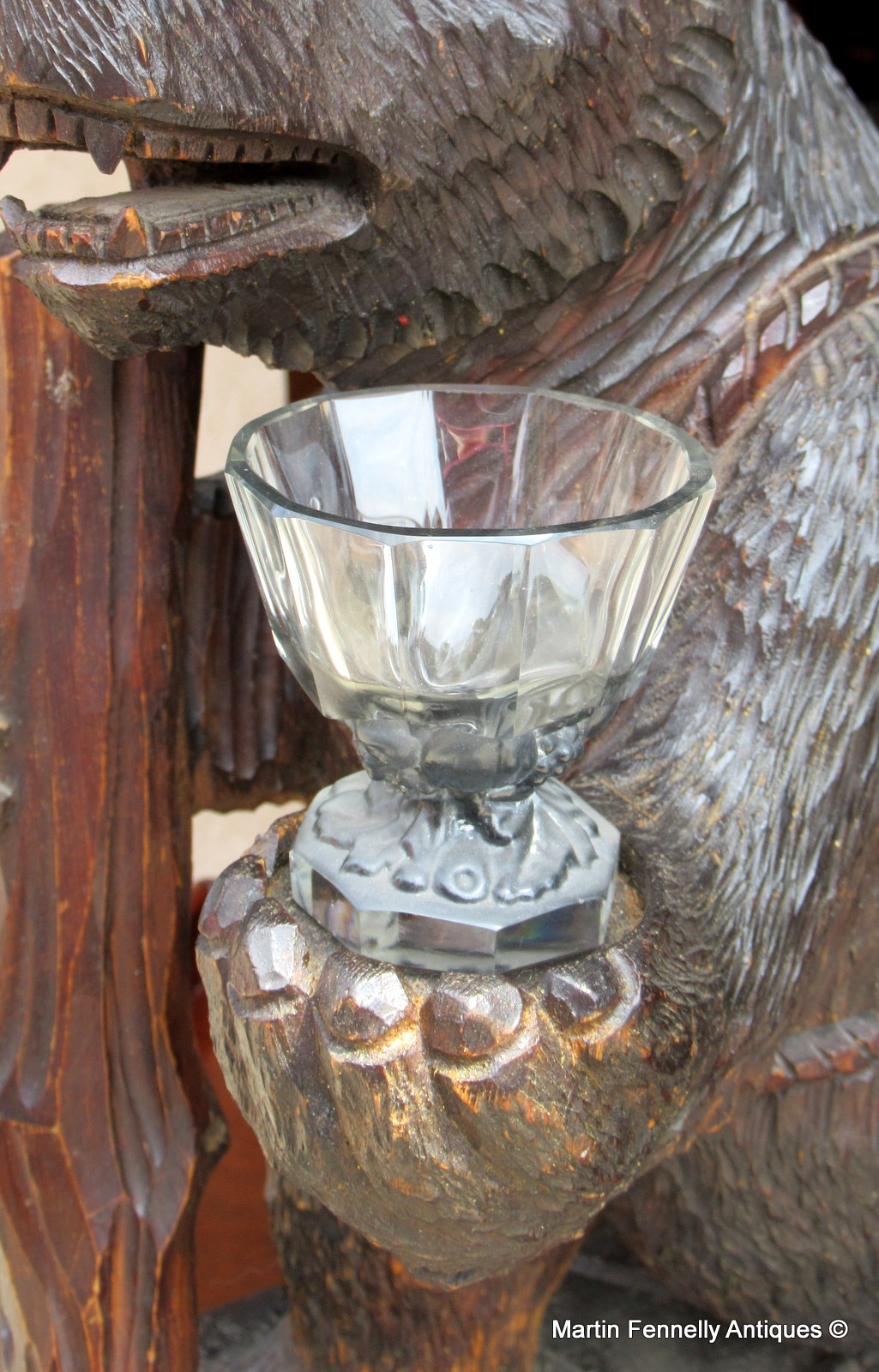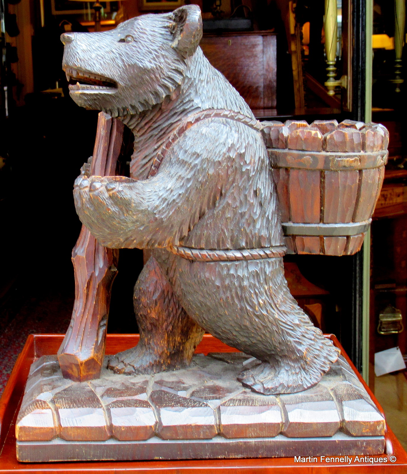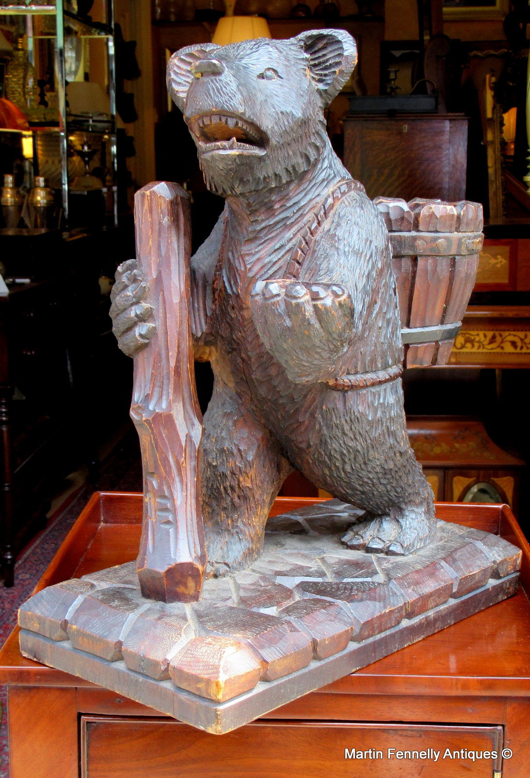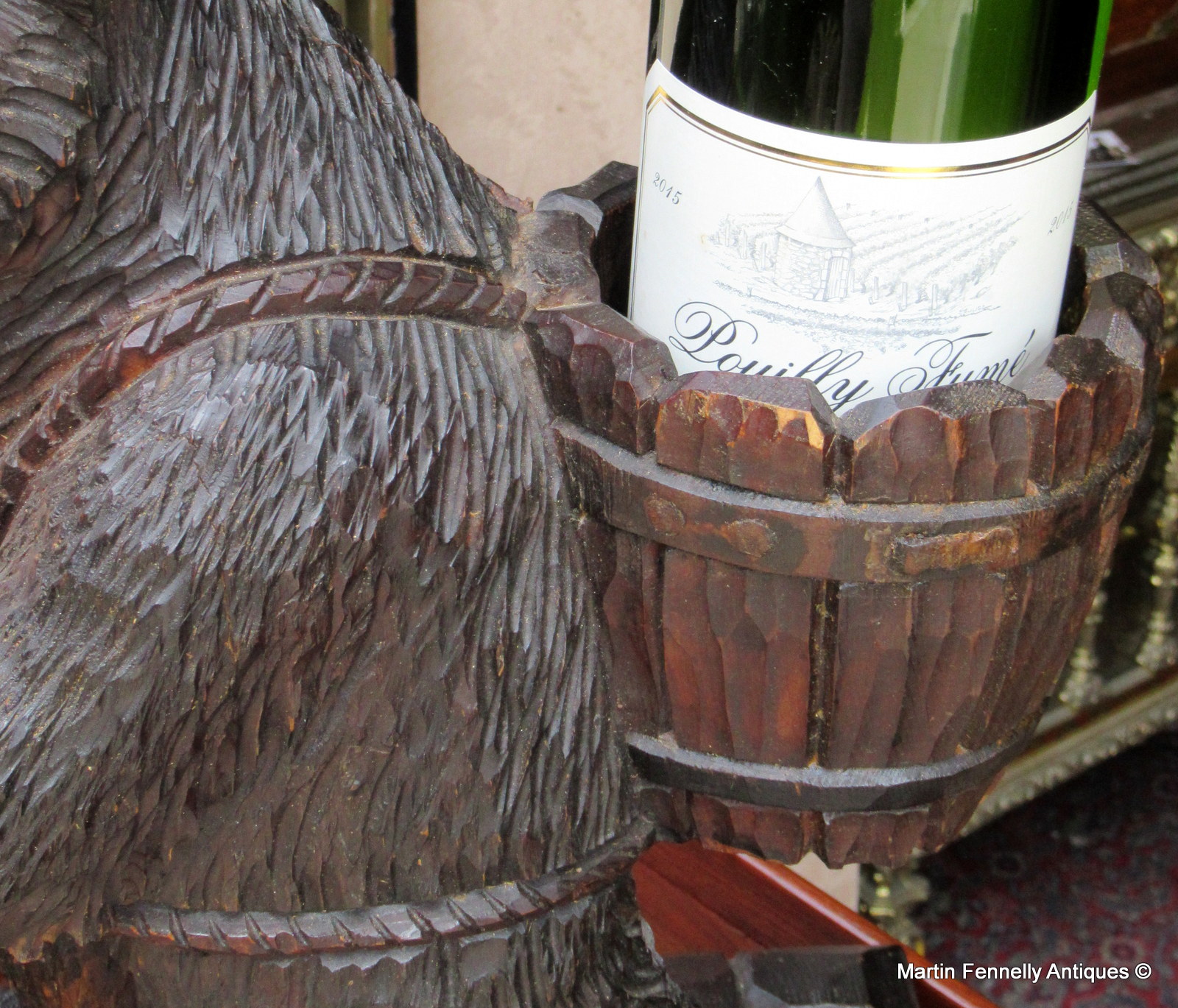 This piece is from Germany and is from the Black Forest area of Southern Germany. It is a Carved Wood Tantalus in the form of a hiking bear with back basket for your bottle of wine and front paw for your glass. It is delightfully carved and in good condition. It dates to Circa 1880 and was purchased in France. The Wine and Glass are not included in price.