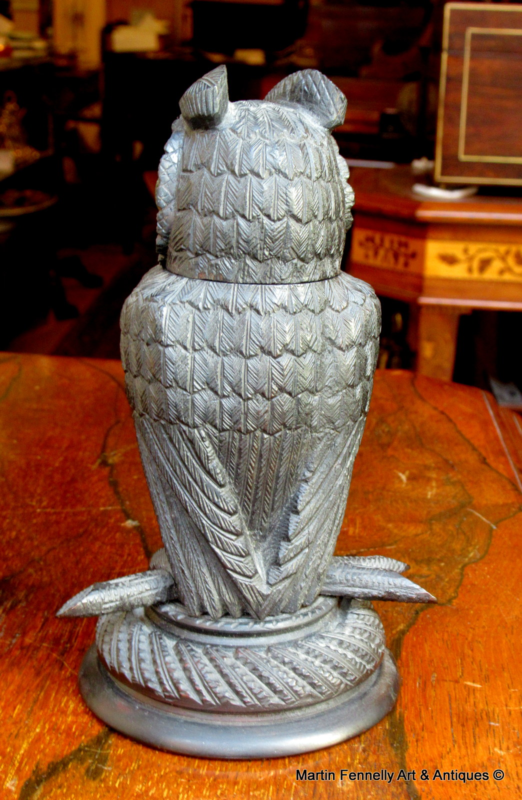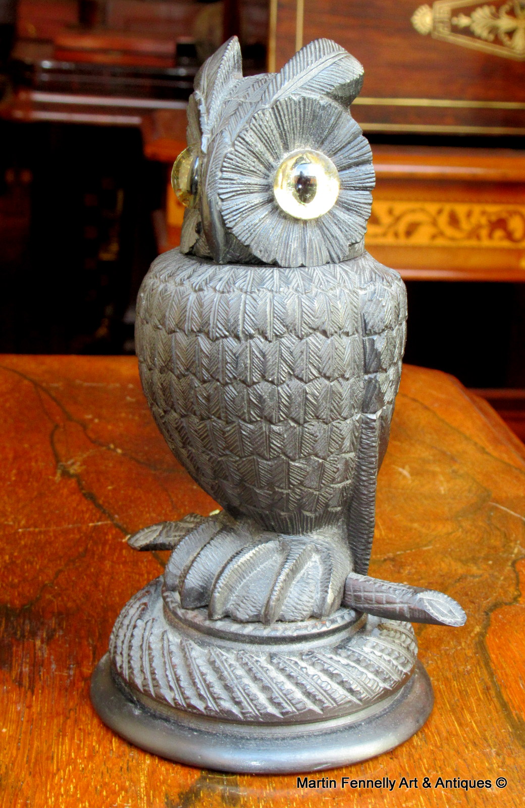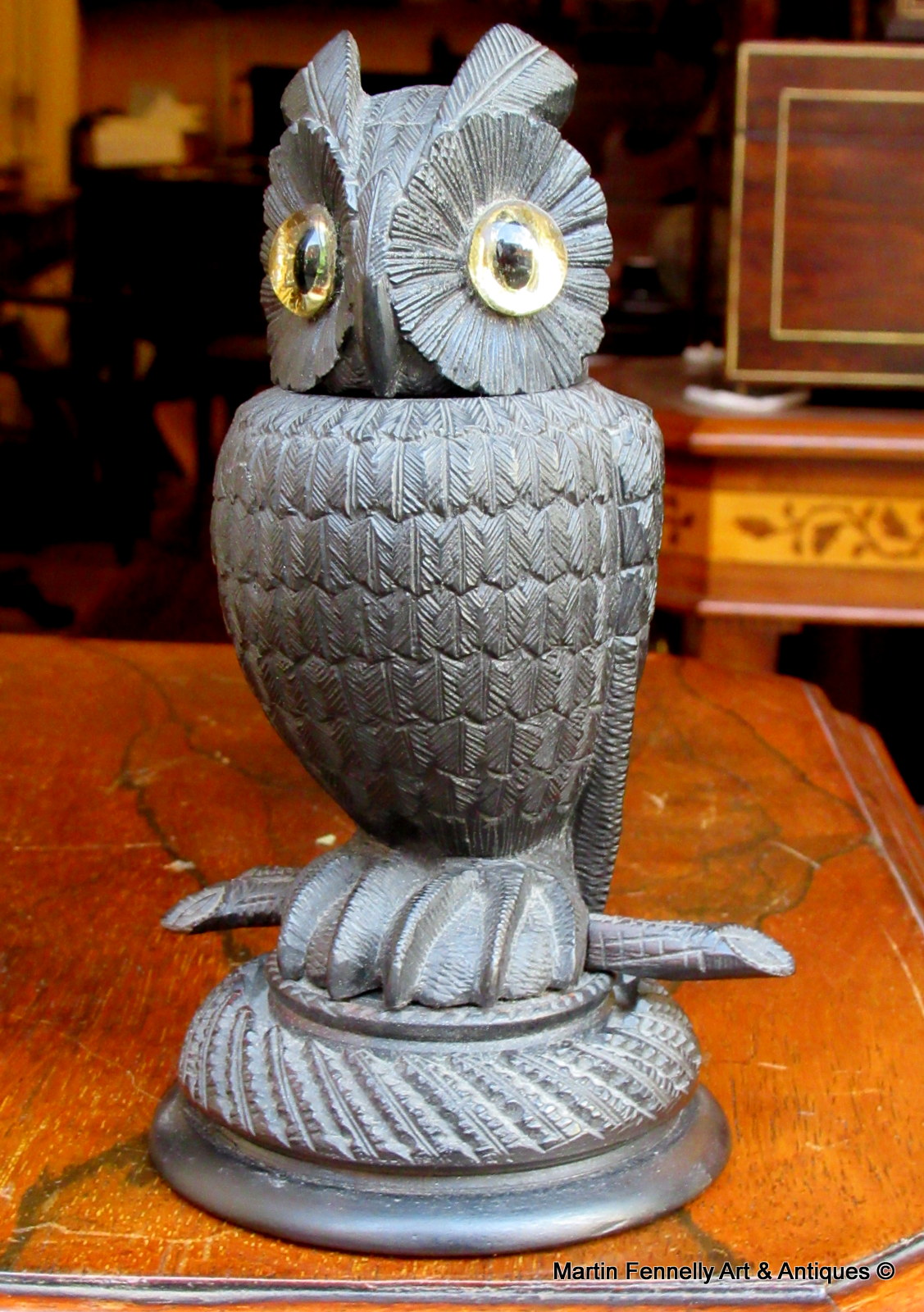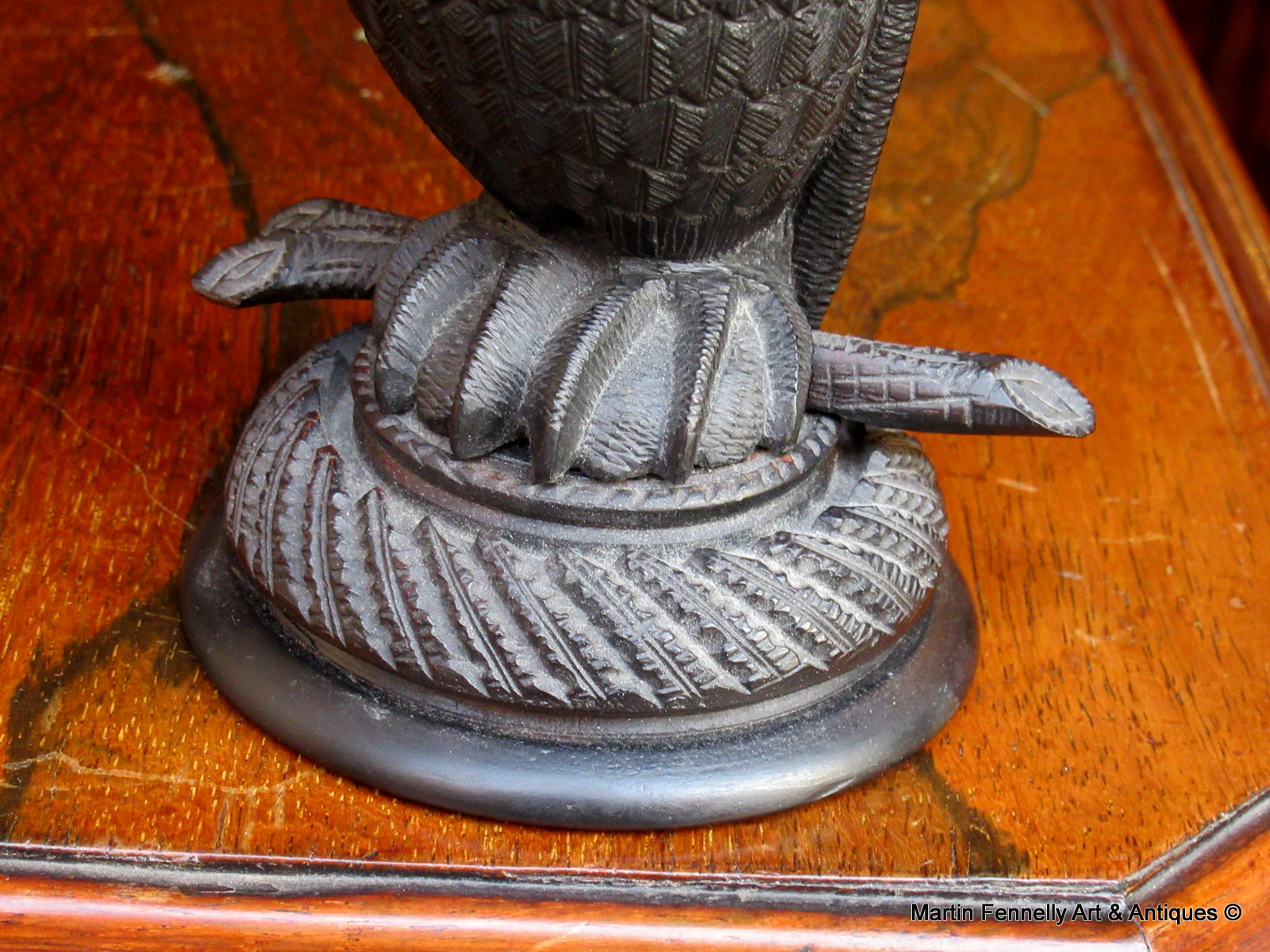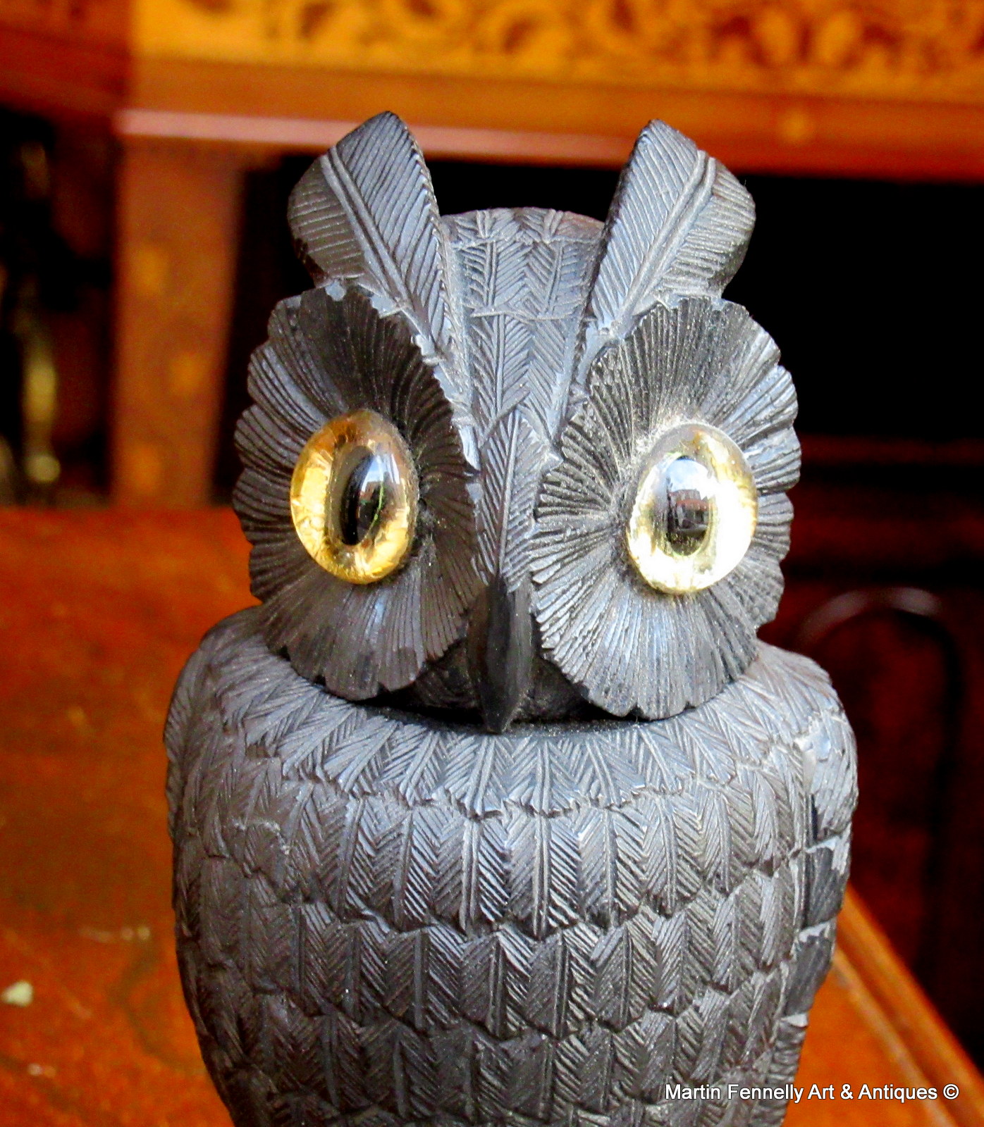Rare Hand Carved Irish Bog Oak Owl of great quality and size, mid Nineteenth Century, possible earlier.The head with original amber glass eyes, raised on a circular base with lavish carved decoration. Condition: Superb condition. Martin Fennelly Antiques – The Home in Ireland for rare Irish Antiques