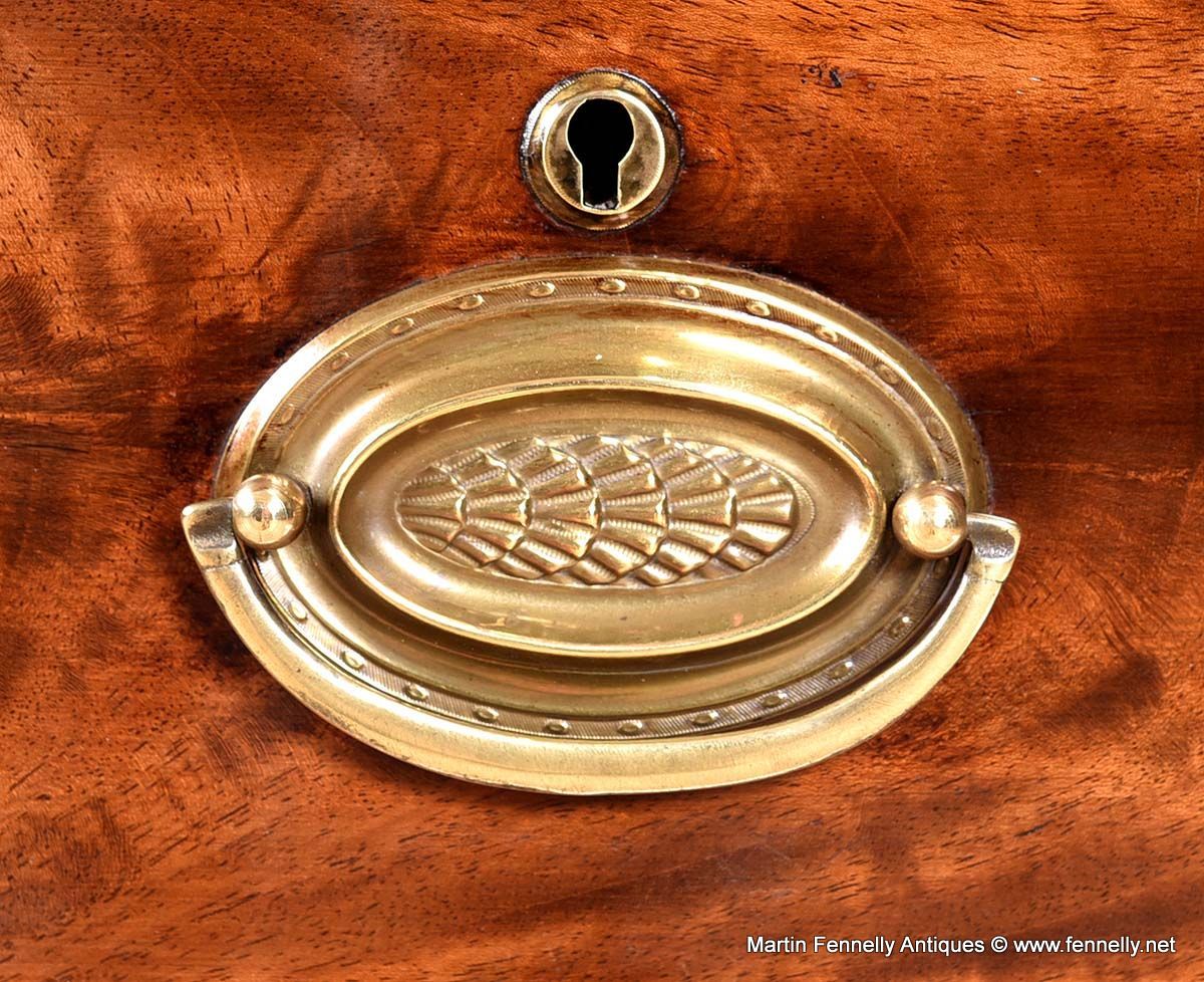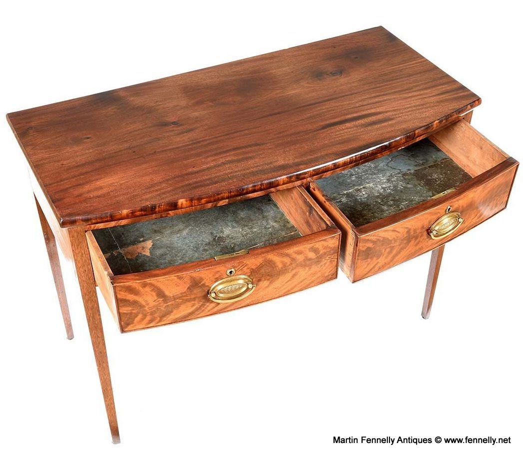 The bow front deep apron enclosing twin drawers complete with their original oval polished brass drop handles, raised on tapering square plain legs.
