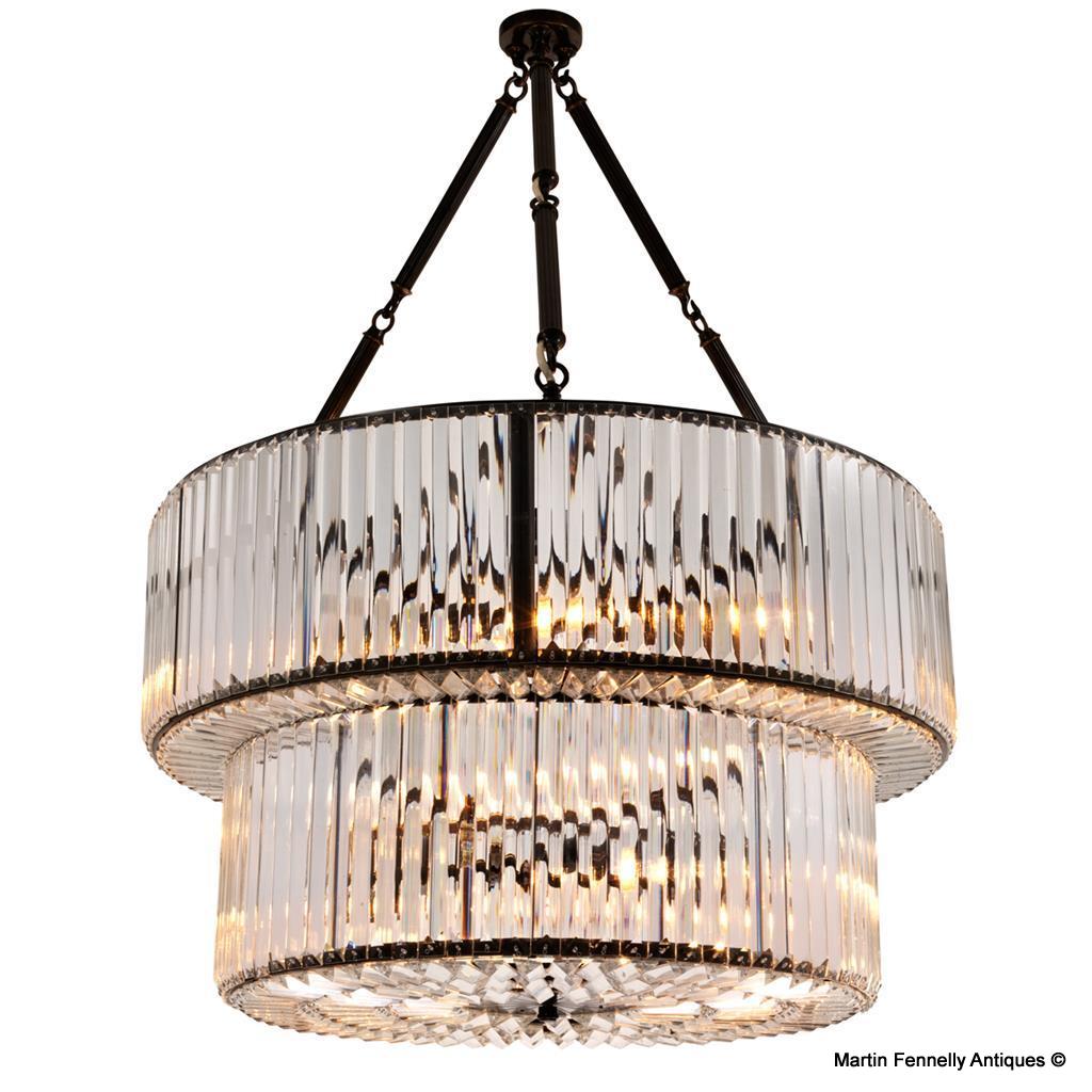 This Luxury Light is a brass tripod Chandelier with gunmetal finish and crystal glass tiered crown. Add a touch of Paisienne glamour to your home. This Infinity Light takes inspiration from the vintage allure of Art Deco chandeliers from the 1920s. Sculpted from brass in a gunmetal finish, it hosts a strong tripod suspension of connecting rods and loops which support two tapered crowns of parallel crystal glass jewels. This Chandelier radiates a glistening illumination which sits well in either a Classical look or Modern design space.