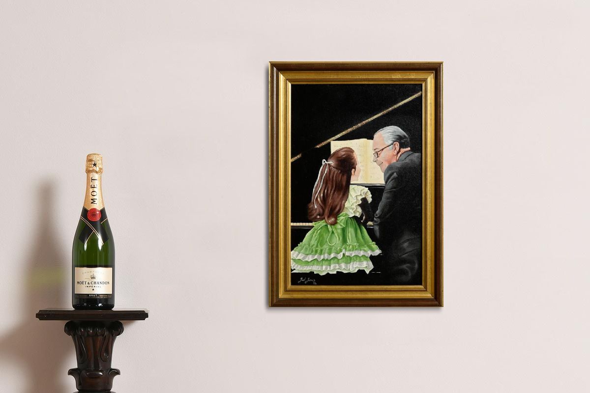 This Painting by Ted Jones (Irish 1952-2017) is a wonderful oil on canvas depicting a beautiful image of ‘The Music Lesson’ where a young pianist is mentored on the Piano. Ted Jones is famous for his depictions of everyday life and this painting is indeed a perfect example of this. This painting is captivating and exhibits Ted Jones work at its best in the 1980’s. The Painting is framed, signed and dated lower left.