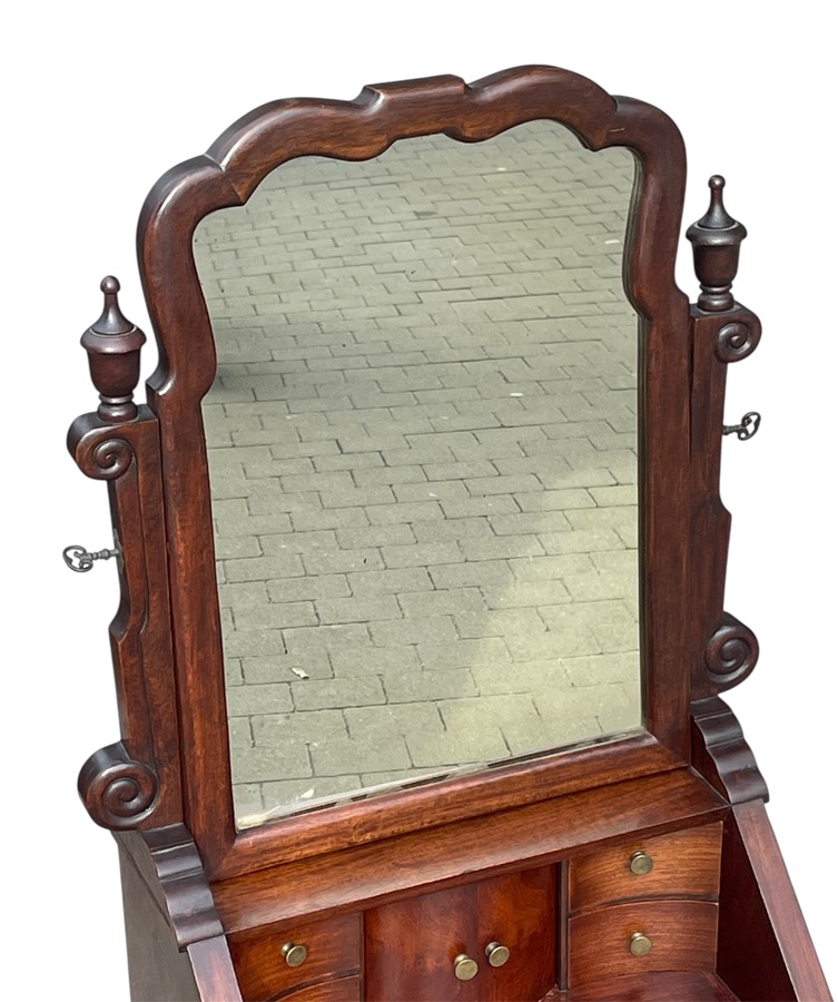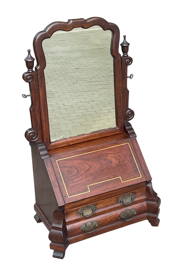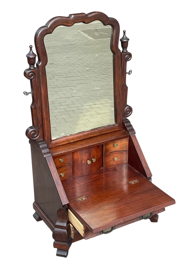 This is a fascinating Vintage miniature Mahogany bureau/dressing table, with a suite of drawers, great colour, fall-front bureau base and lower drawers with brass lock escutcheons. The fall front opens to reveal a sectioned interior. The Mirror plate rotates within shaped uprights, the frame edge gently chamfered. The whole raised upon a pair of shaped front feet, with bracket feet to rear. The piece is in the Georgian Style but dates we believe to Circa 1920.