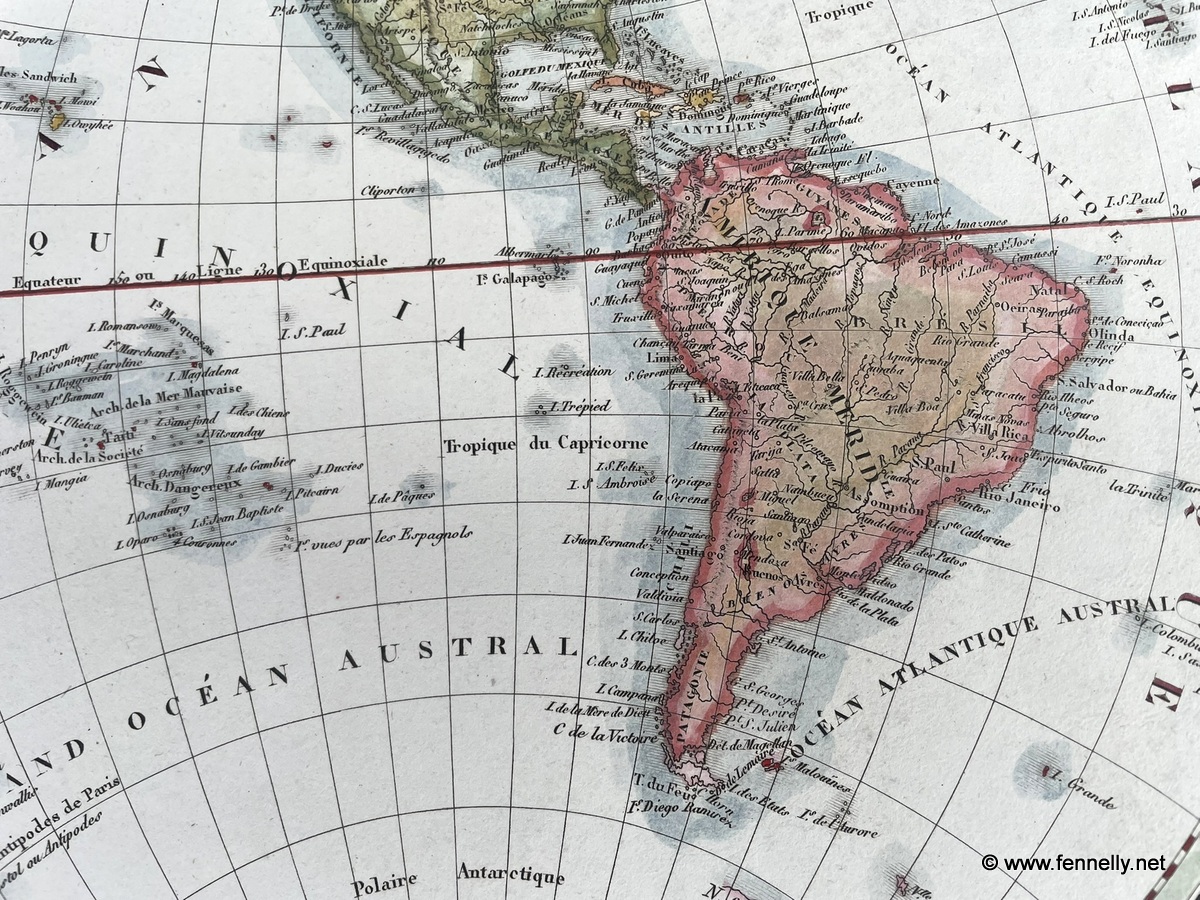 This Antique and Original Mappe Monde (World Map) is a fine depiction in double hemisphere representation of the world, originally included in Ambroise Tardieu‘s “Atlas pour Servir a l’Intelligence de l’Histoire Generale des Voyages de Laharpe.” The atlas, designed to clarify and support Laharpe’s comprehensive historical accounts of global explorations, features detailed geographic depictions. Created in 1821 The double hemisphere format of the map allows for a simultaneous view of the Eastern and Western Hemispheres, providing a clear and balanced perspective of the Earth as understood during the time of its creation. The Map is framed and under Museum Glass and makes for a wonderful and interesting view at my Gallery.