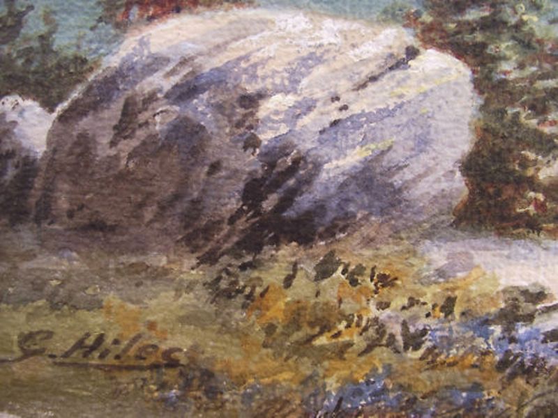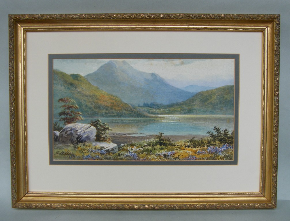 Quality Irish Watercolour on Paper of a View of The Lakes of Killarney with rocks and wild flowers along the shore and mountains and hills in the distance, in County Kerry, Ireland, by English Artist George Hiles who was from Stoke Newington in London, he exhibited at the Royal Academy in 1892. Signed lower left and titled on back "Lakes of Killarney" . Condition: Nice unfaded condition with colours still nice and fresh. Recently framed with a stylish gilt frame and double mount, this item is glazed.