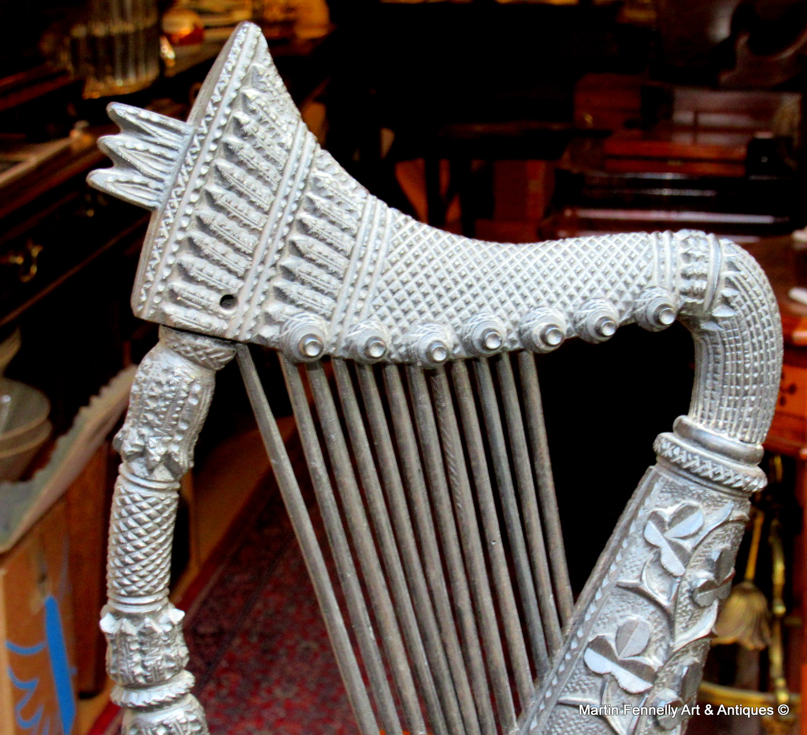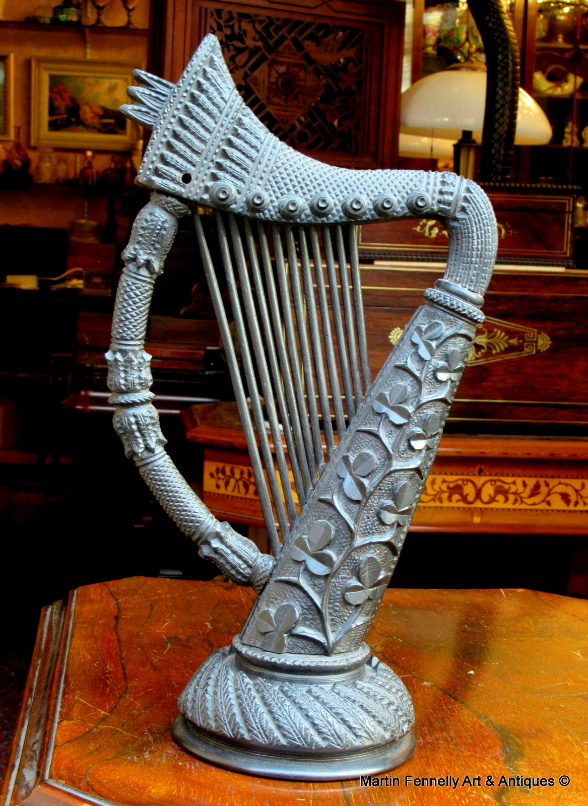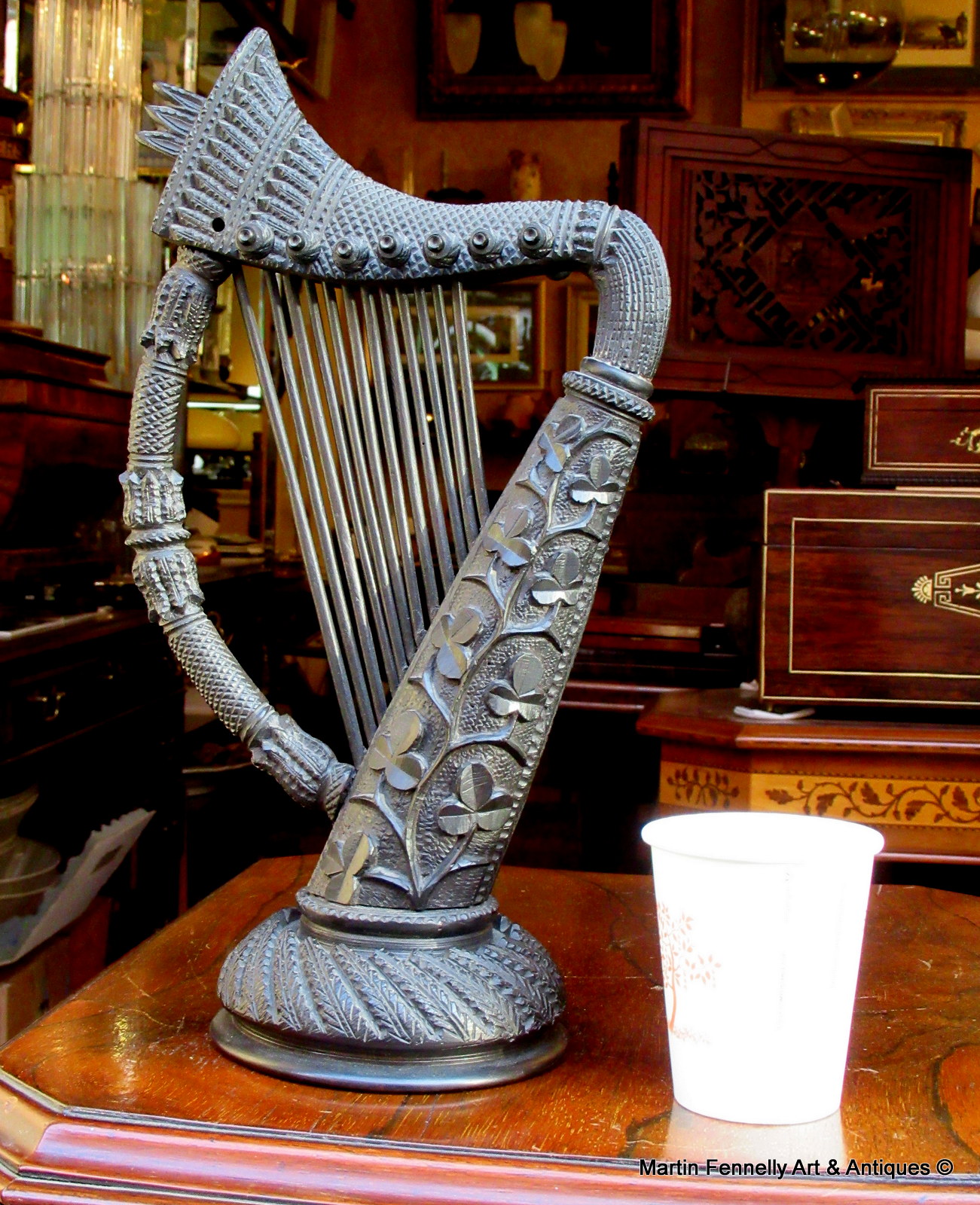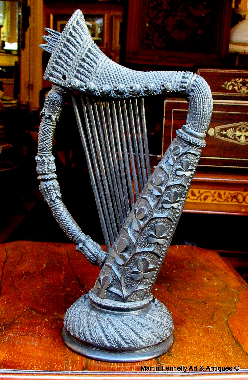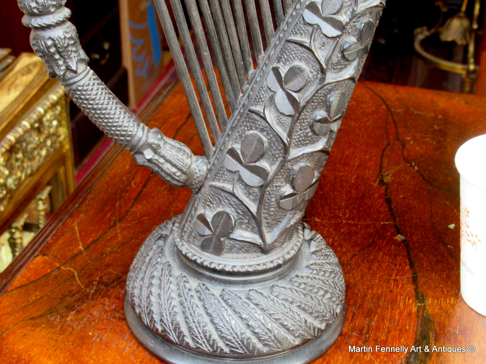 Superb Irish Bog Oak Hand Carved Ornamental Harp of Large proportions, nicely carved with trailing shamrocks ending on a circular carved base, late Nineteenth Century. This is a Rare piece of Irish History and recent Auction sales of this Size and quality are above 2500 Euro. The Patina is rich and the Harp is Heavy.