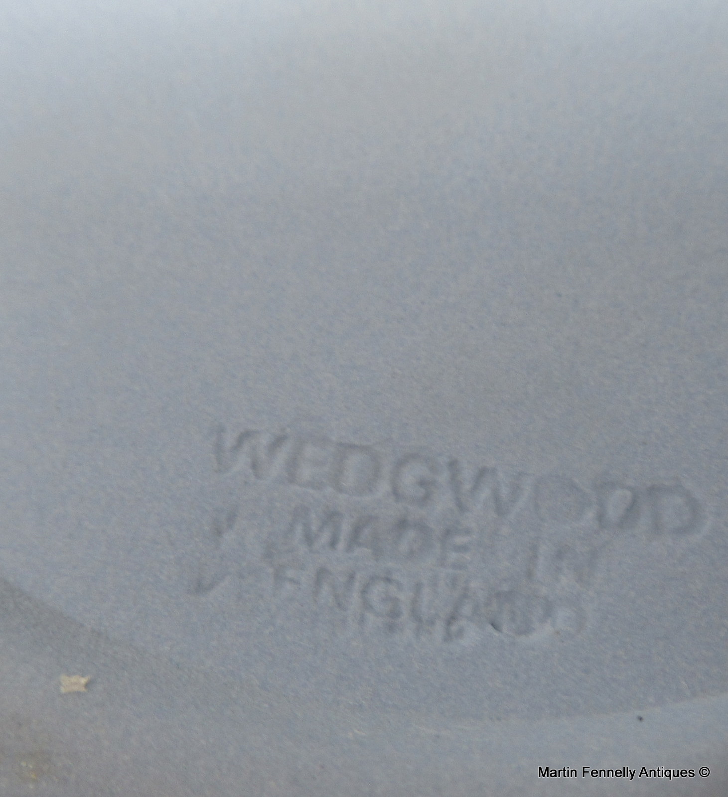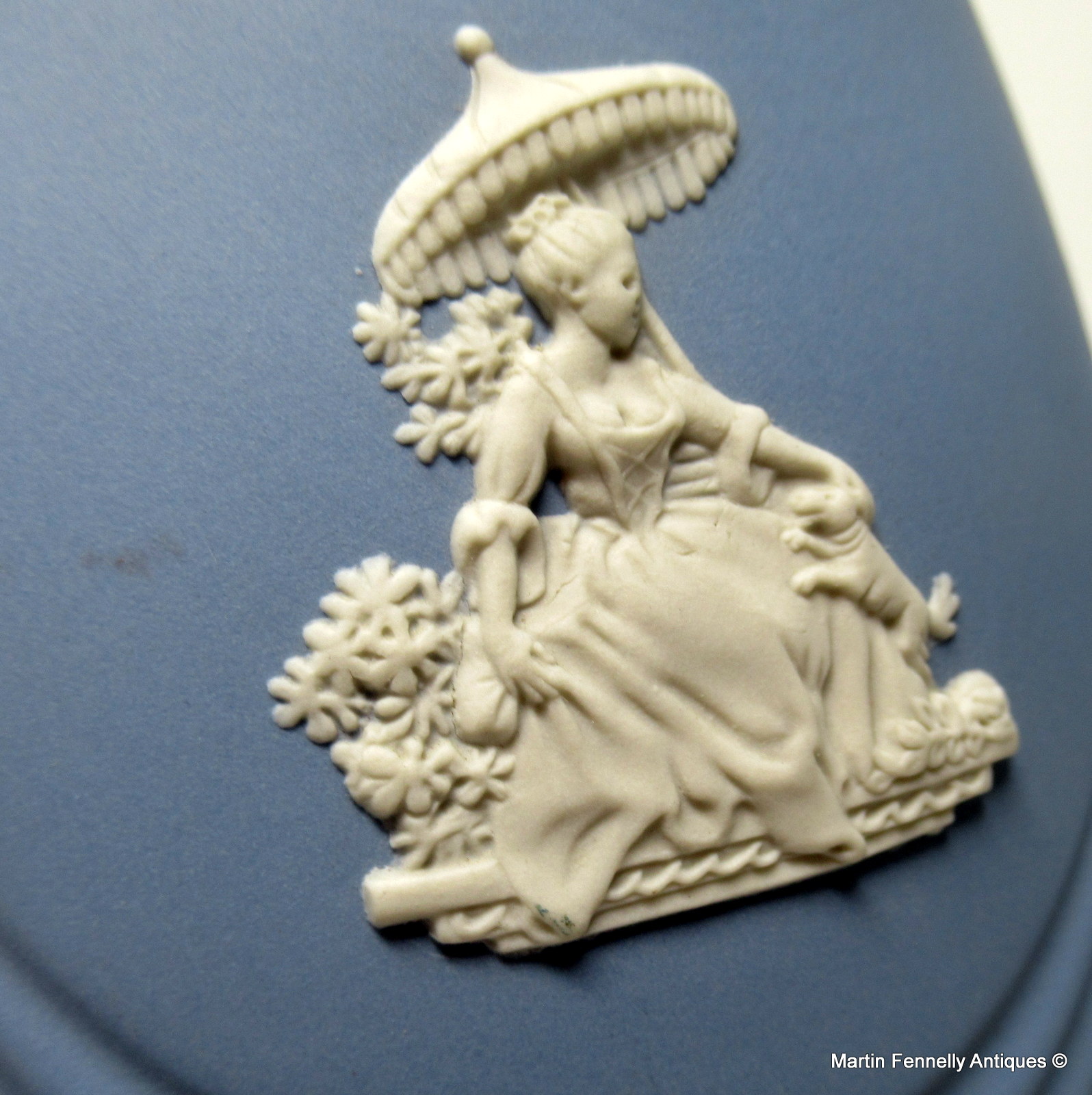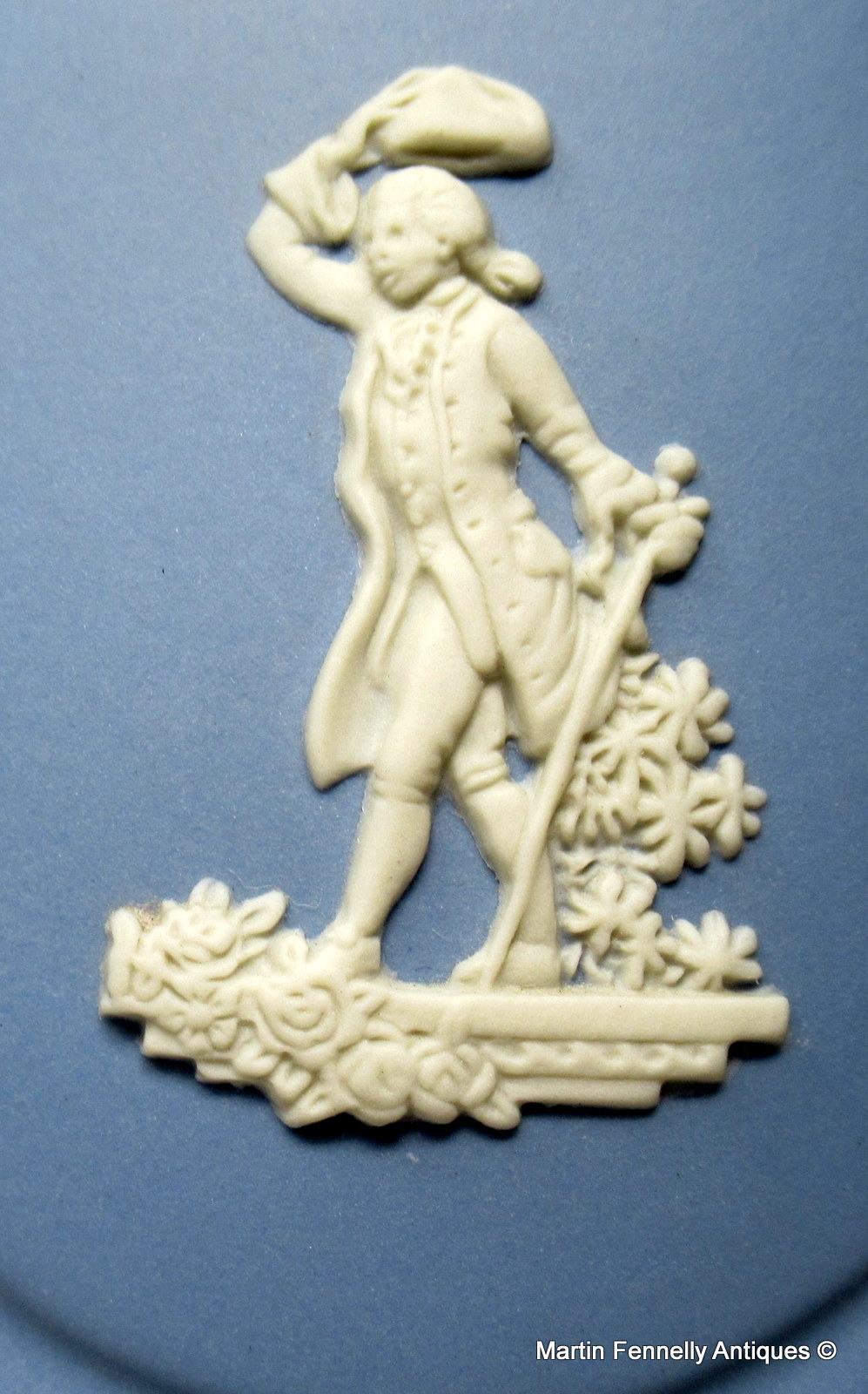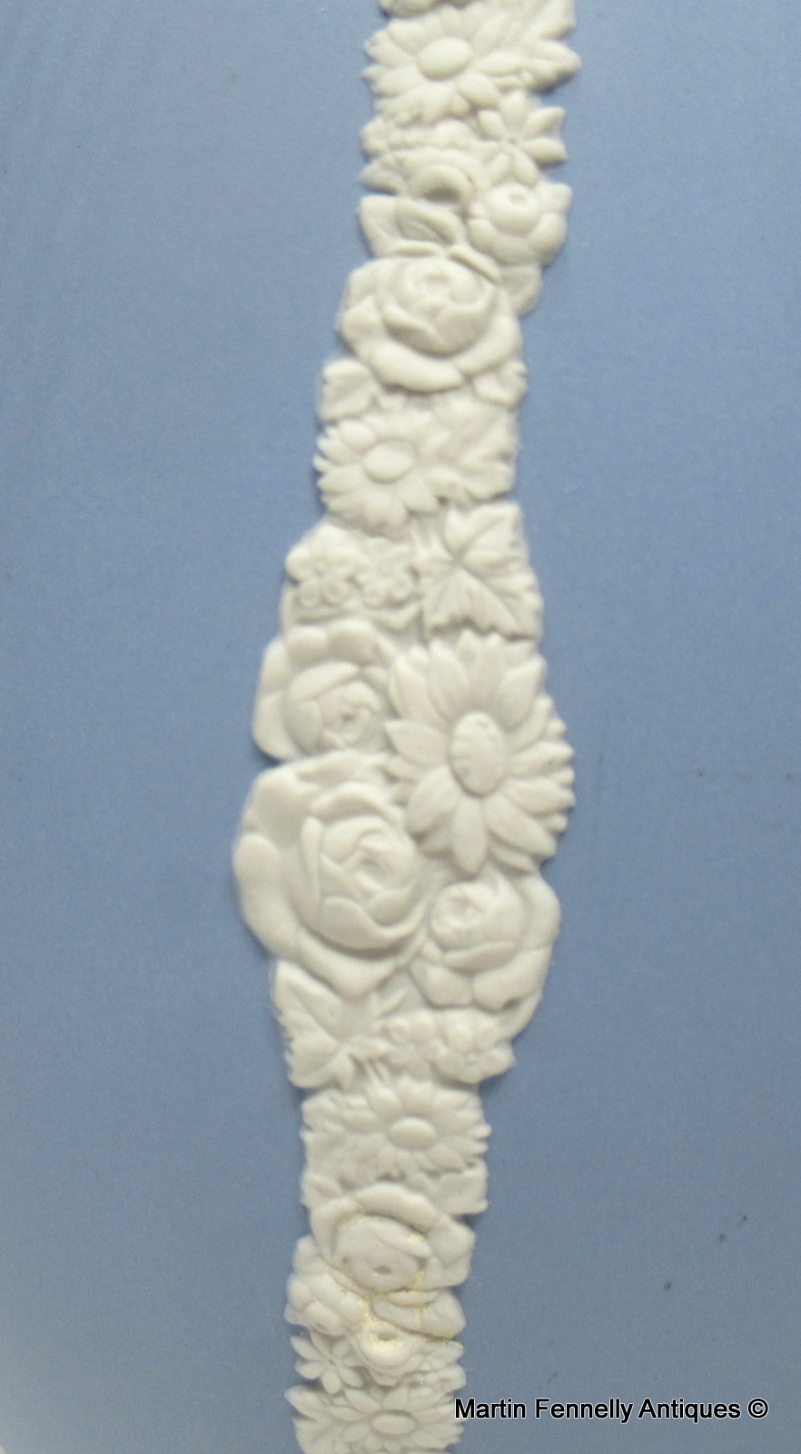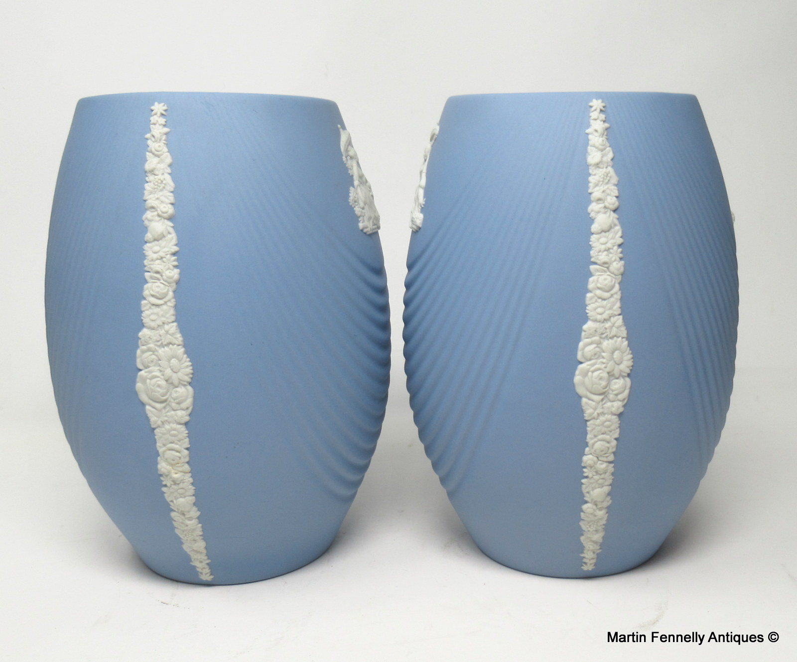 Pair of Wedgwood Light Blue Jasperware Vases, the vases with applied white decoration of a Classical Lady and Gentleman with white acanthus leaf decoration on the side, impressed factory marks to base.