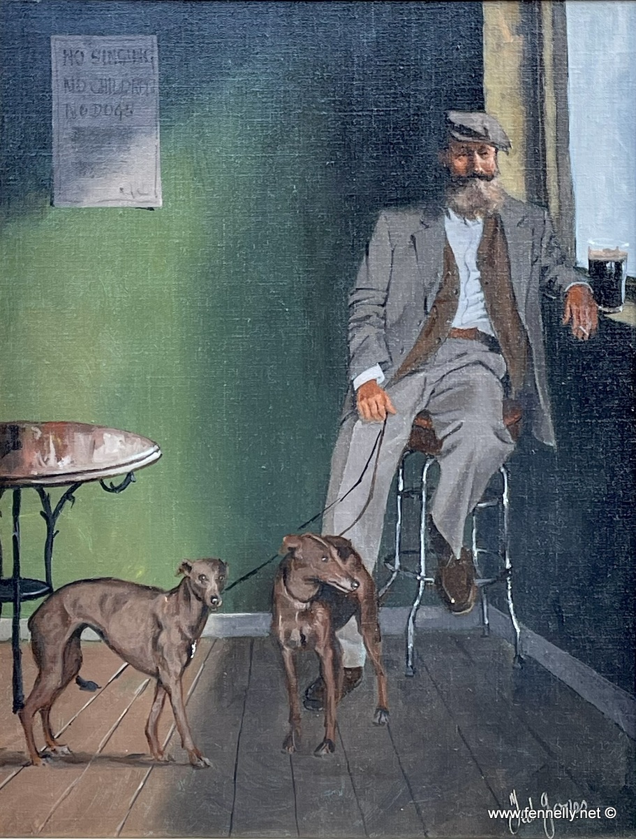 This Painting ‘No Dogs Allowed’ by Ted Jones (Irish 1952-2017) is a wonderful oil on Canvas. Ted Jones is famous for his depictions of everyday life and he really captures a moment in time here. This painting is captivating and exhibits Ted Jones work at its best in the 1990’s. The Painting is framed, signed lower right. This Painting has an excellent provenance and was purchased directly from the Artist in the early 1990’s which many believe was when Ted Jones produced his very best paintings.