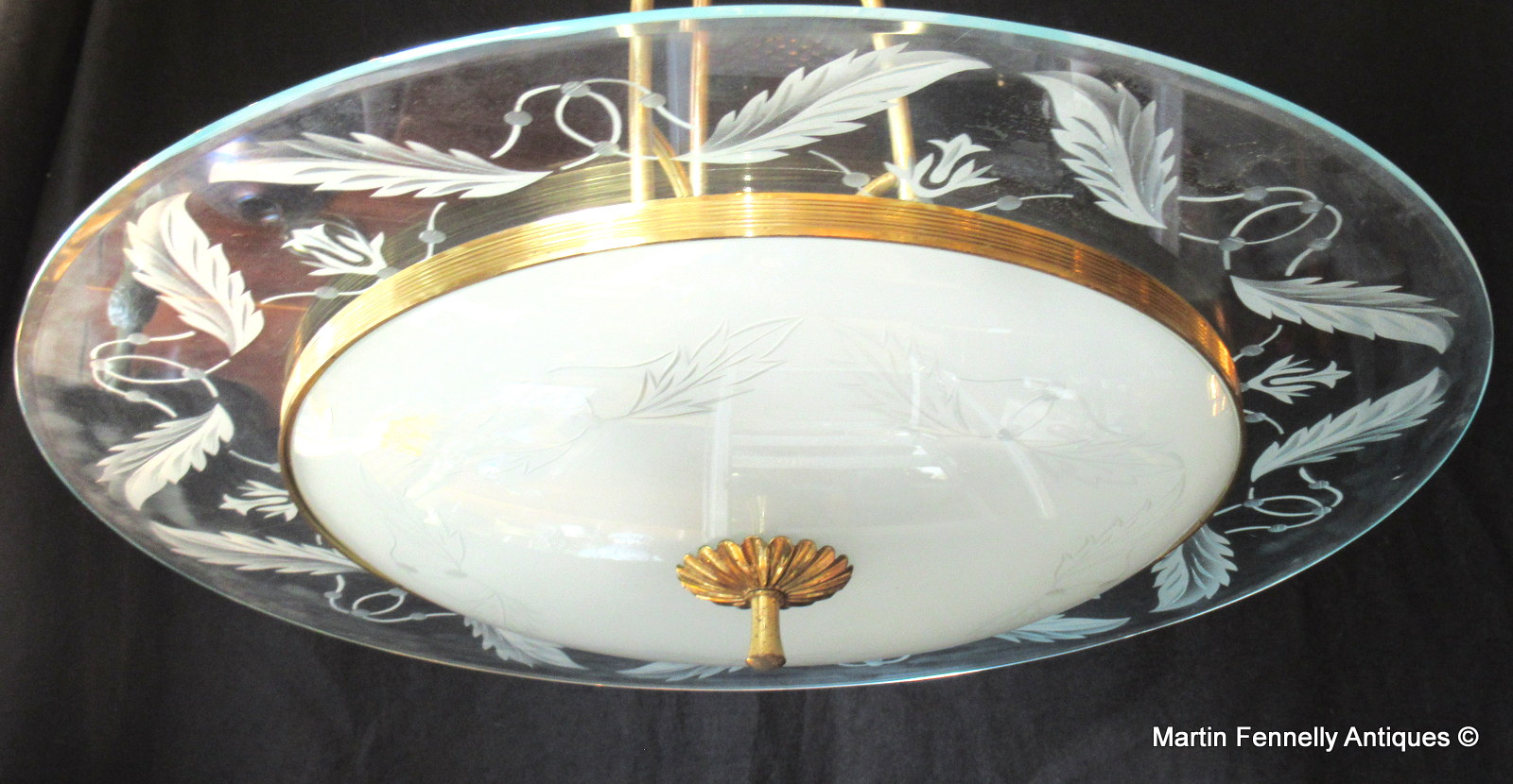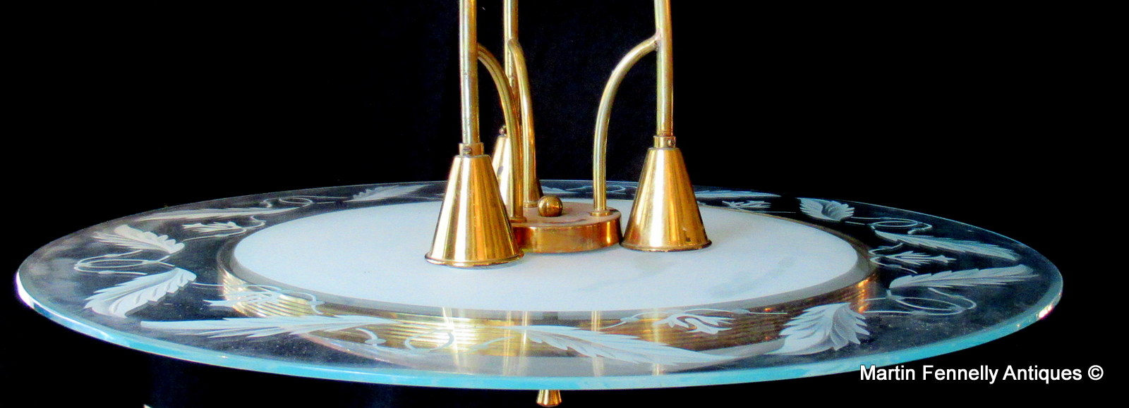 This is an elegant Circular Ceiling Light from France and dating to Circa 1940. The Central Ceiling Rod with original ceiling cup supports three arms all above a spectacular circular etched glass disc with frosted central base enclosing three lights. Superb Light this.