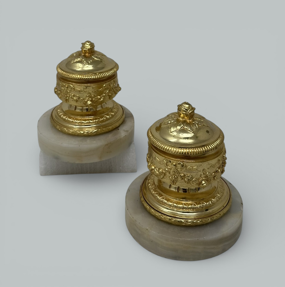 Stunning Pair of Grand Tour French Heavy Gauge Ormolu Lidded Urns complete with Alabaster circular supports of compact proportions and outstanding quality. The main central support with a swag and bow detailed surround, the hinged cover with a rose finial. Nicely veined Alabaster bases.