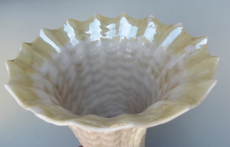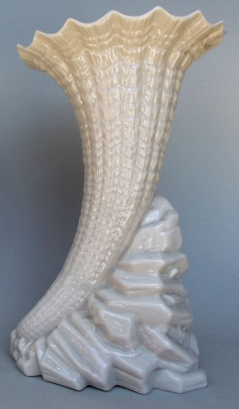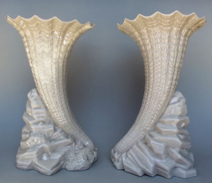 Wonderful Pair Early Irish Belleek Rock Spill Cornucopia Trumpet Vases of large proportions with textured body and flared scalloped rim ending on a Naturalistic rocky base.