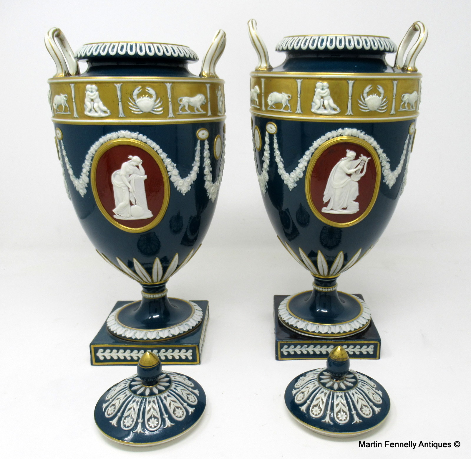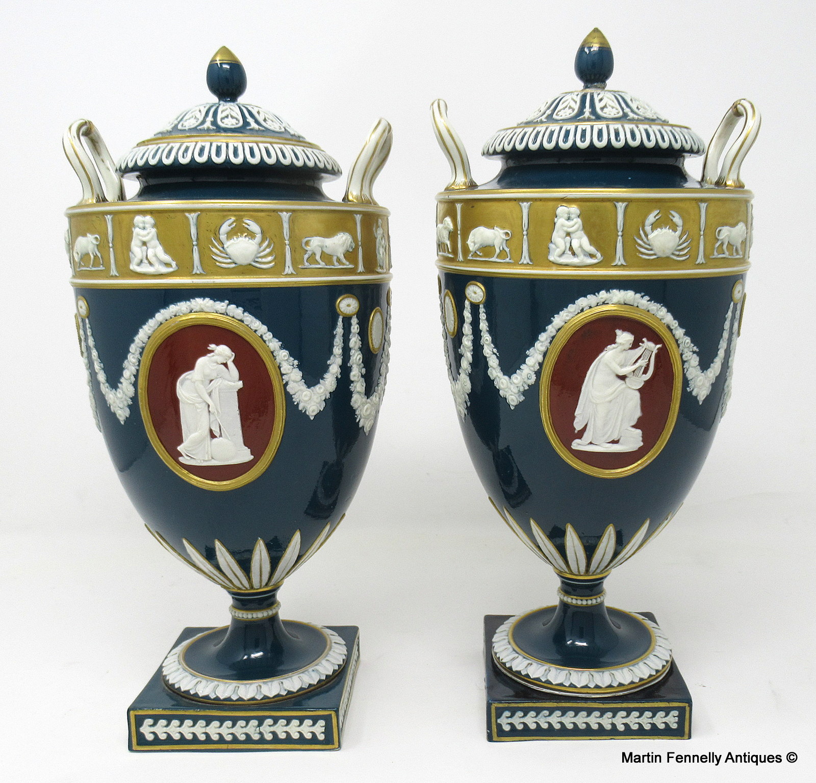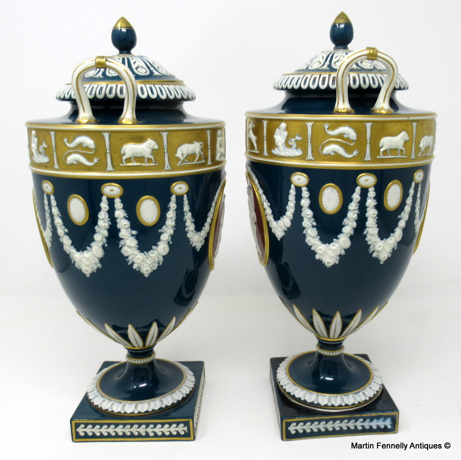 These are a spectacular Pair of Wedgwood Lidded Urns dating to Circa 1875,designed by Charles Toft and a very rare pair these are. ‘Victoria Ware’ from Wedgwood at its very best and in great Condition. They date to Circa 1875 and have a superb presence. They have the impressed factory name “WEDGWOOD” and are baluster in shape, decorated with ribbons of Garlands, floral festoons, full circle of Star Sign decoration and cameo styled medallions on each side featuring portraits of Venus and Neo Classical figures. These are a tour de force of Victoria Ware and bear all the hallmarks of the famed Charles Toft. Charles Toft (1832-1909) created these out of unglazed hard paste porcelain named by their rivals Minton Parian ware for the Greek island Paros that produces a white marble of the same name, they are laid on a spectacular Duke Blue/Charleston Green coloured ground. Shipping is expensive on these due to their fragility.