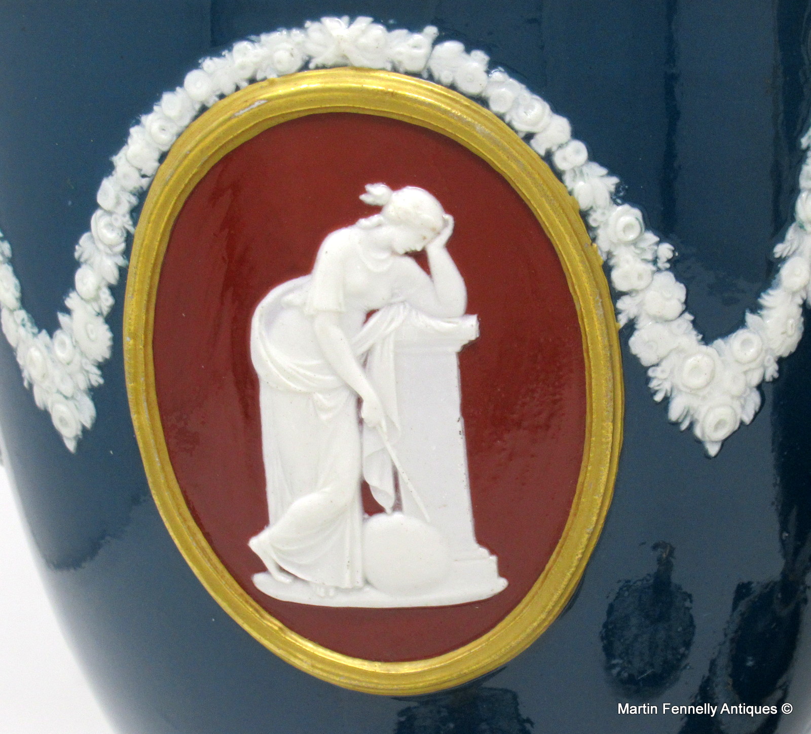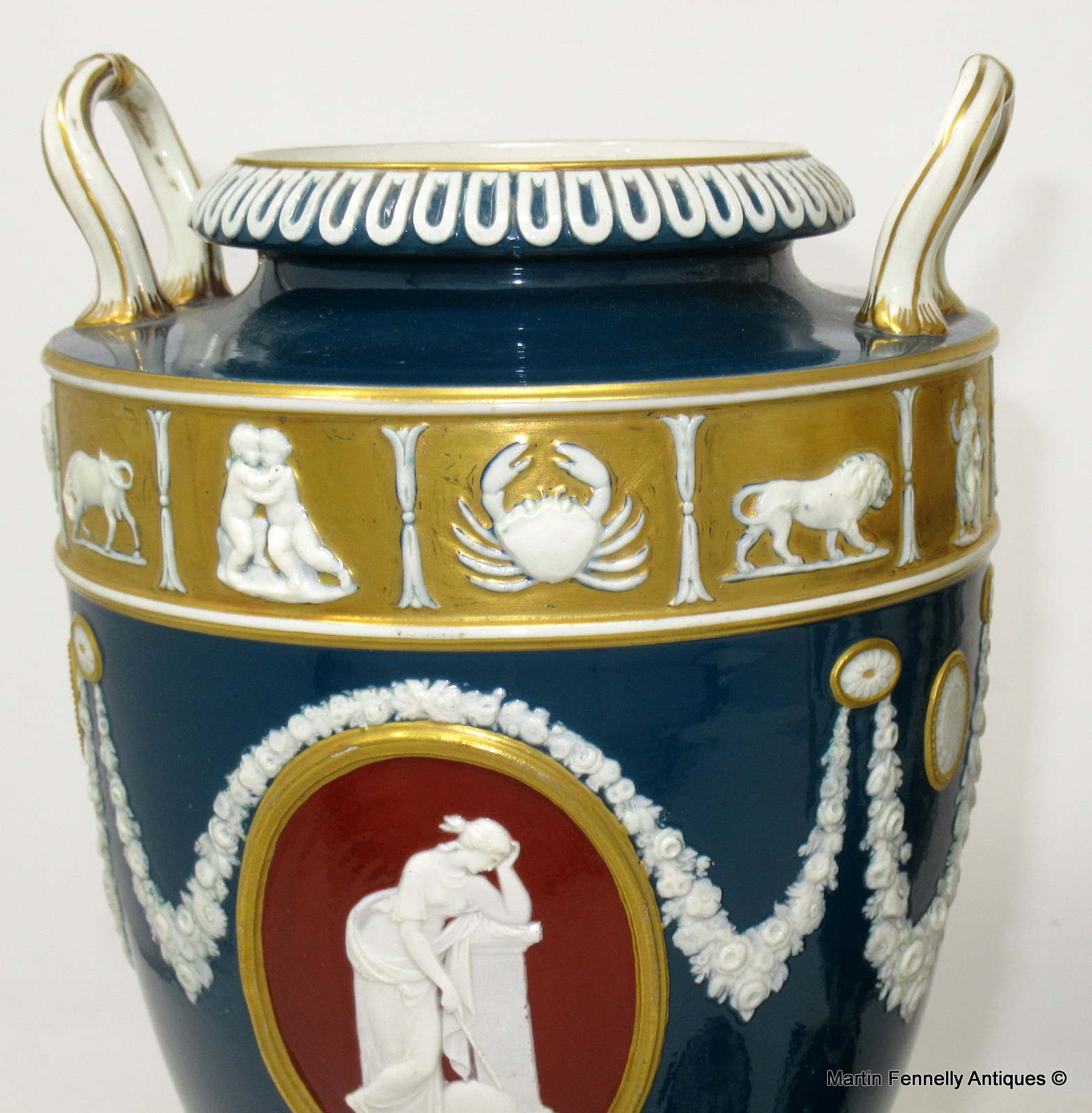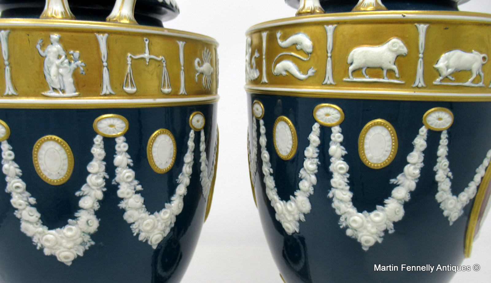These are a spectacular Pair of Wedgwood Lidded Urns dating to Circa 1875,designed by Charles Toft and a very rare pair these are. ‘Victoria Ware’ from Wedgwood at its very best and in great Condition. They date to Circa 1875 and have a superb presence. They have the impressed factory name “WEDGWOOD” and are baluster in shape, decorated with ribbons of Garlands, floral festoons, full circle of Star Sign decoration and cameo styled medallions on each side featuring portraits of Venus and Neo Classical figures. These are a tour de force of Victoria Ware and bear all the hallmarks of the famed Charles Toft. Charles Toft (1832-1909) created these out of unglazed hard paste porcelain named by their rivals Minton Parian ware for the Greek island Paros that produces a white marble of the same name, they are laid on a spectacular Duke Blue/Charleston Green coloured ground. Shipping is expensive on these due to their fragility.