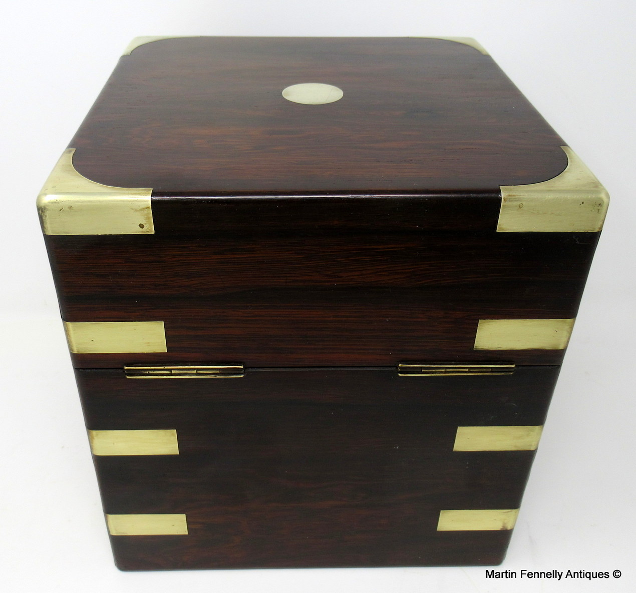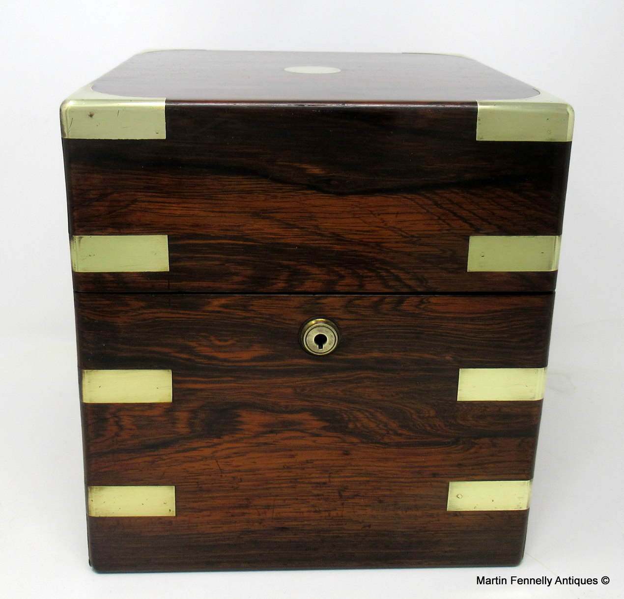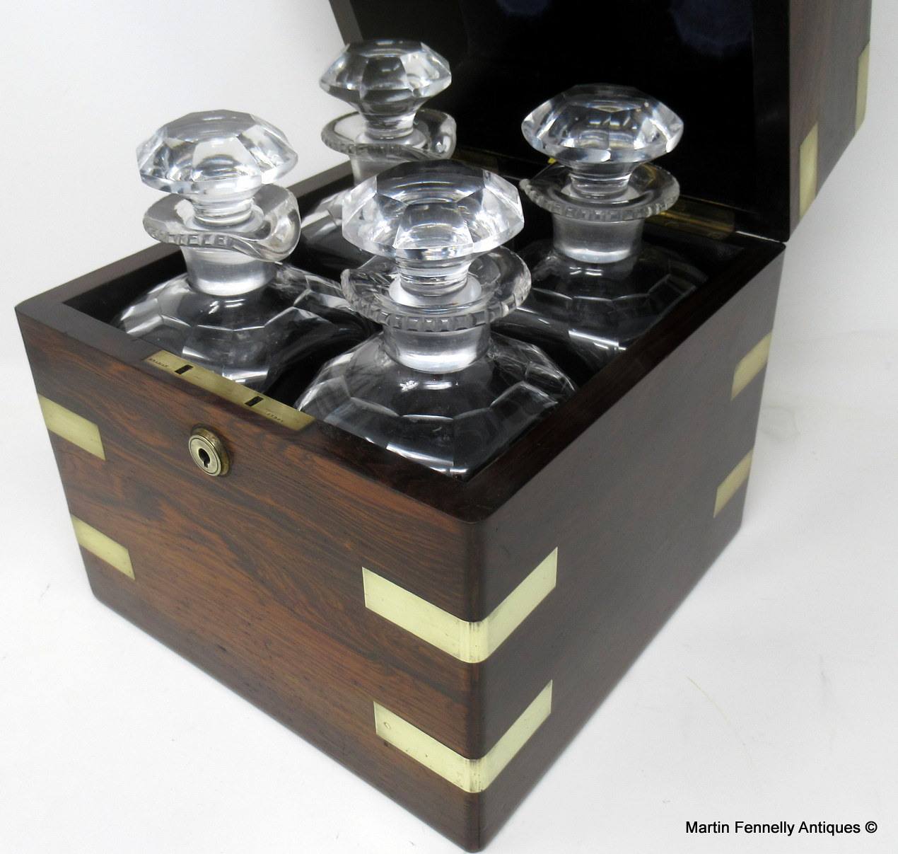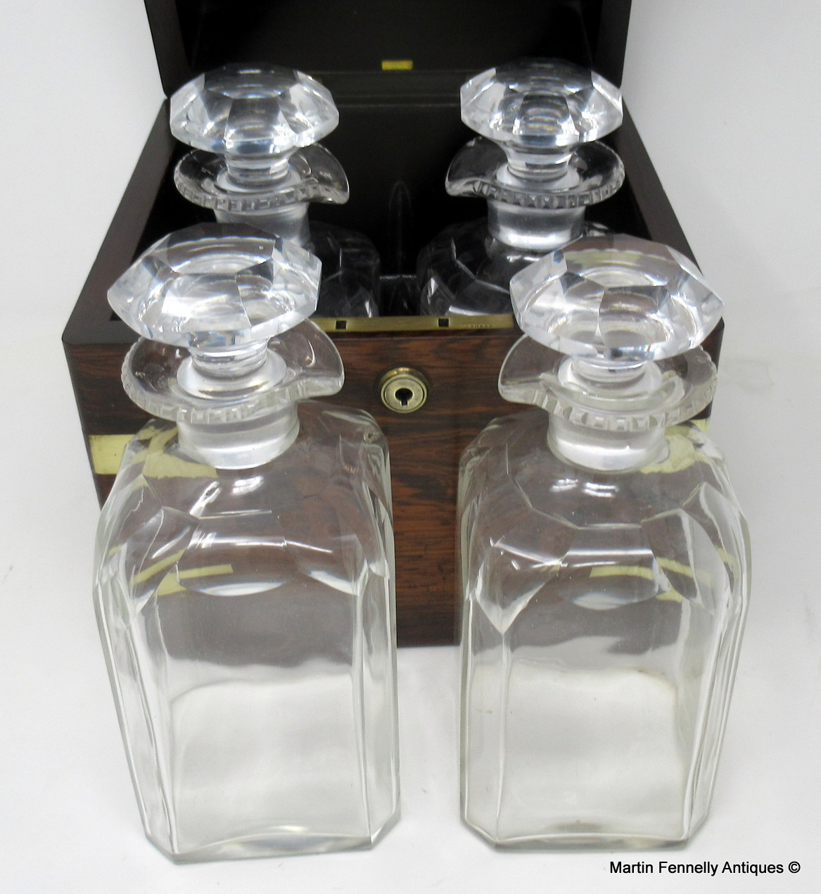 The double hinged lid opens to reveal a lined fitted interior to accomodate 4 Crystal Decanters which are all in place and in Good Condition bar one small chip to one decanter. Amazingly the original makers label has survived and the exterior of the box has a vivid Rosewood Patina and all brass is still intact.