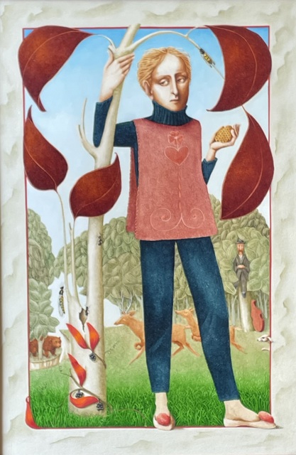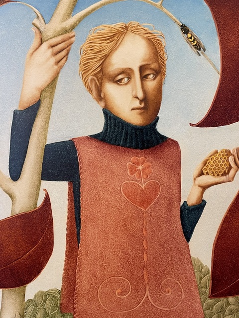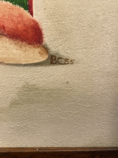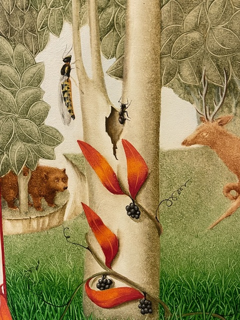 This is a lovely Painting titled ‘Searching for Honey’ by the famed Irish Artist, Barry Castle (1935–2006). Barry was an Irish Artist and illustrator renowned for her vivid and fantastical paintings. Trained at the National College of Art, Dublin, she developed a luminous, layered painting technique under her husband, artist Philip Castle. Born in Dublin, she was the daughter of novelist and playwright Maura Laverty. She studied at the National College of Art (NCAD) under Seán Keating and others. She illustrated her mother Maura Laverty’s books and exhibited at the Portal Gallery, London.