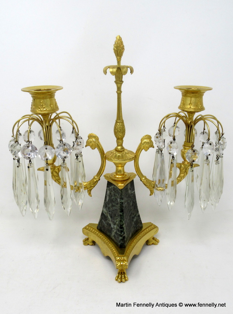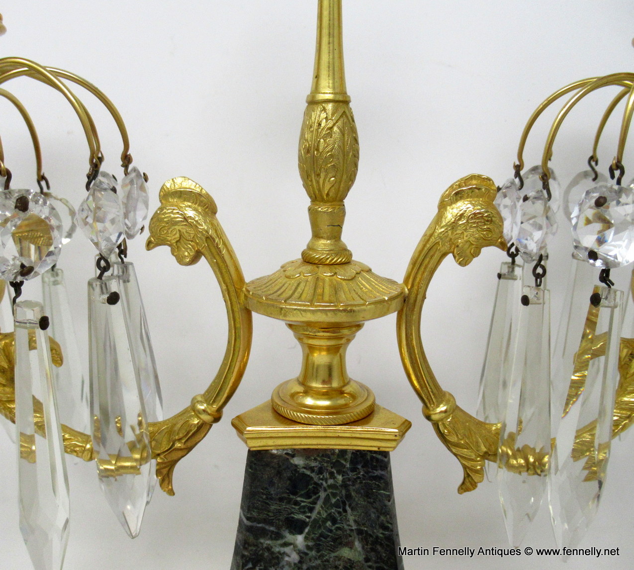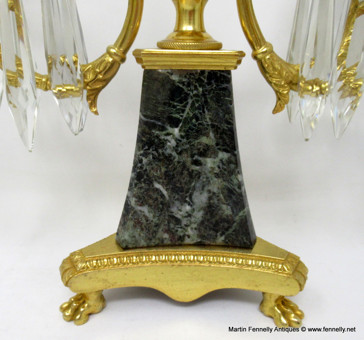 Each with a centered spire topped with a leaf canopy and an Acorn finial, issuing two decorative scrolled candelabras mounted with a Cockrel Head and a canopy of twelve hand cut crystal spear shaped prisms. The main support of nicely veined green marble, of inverted triangular outline, ending on an ormolu base with egg and dart cast decoration and supported on its original three paw feet.