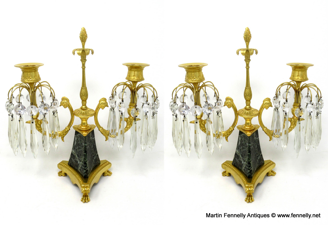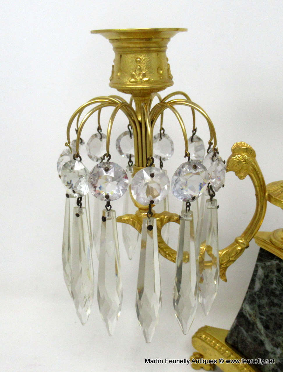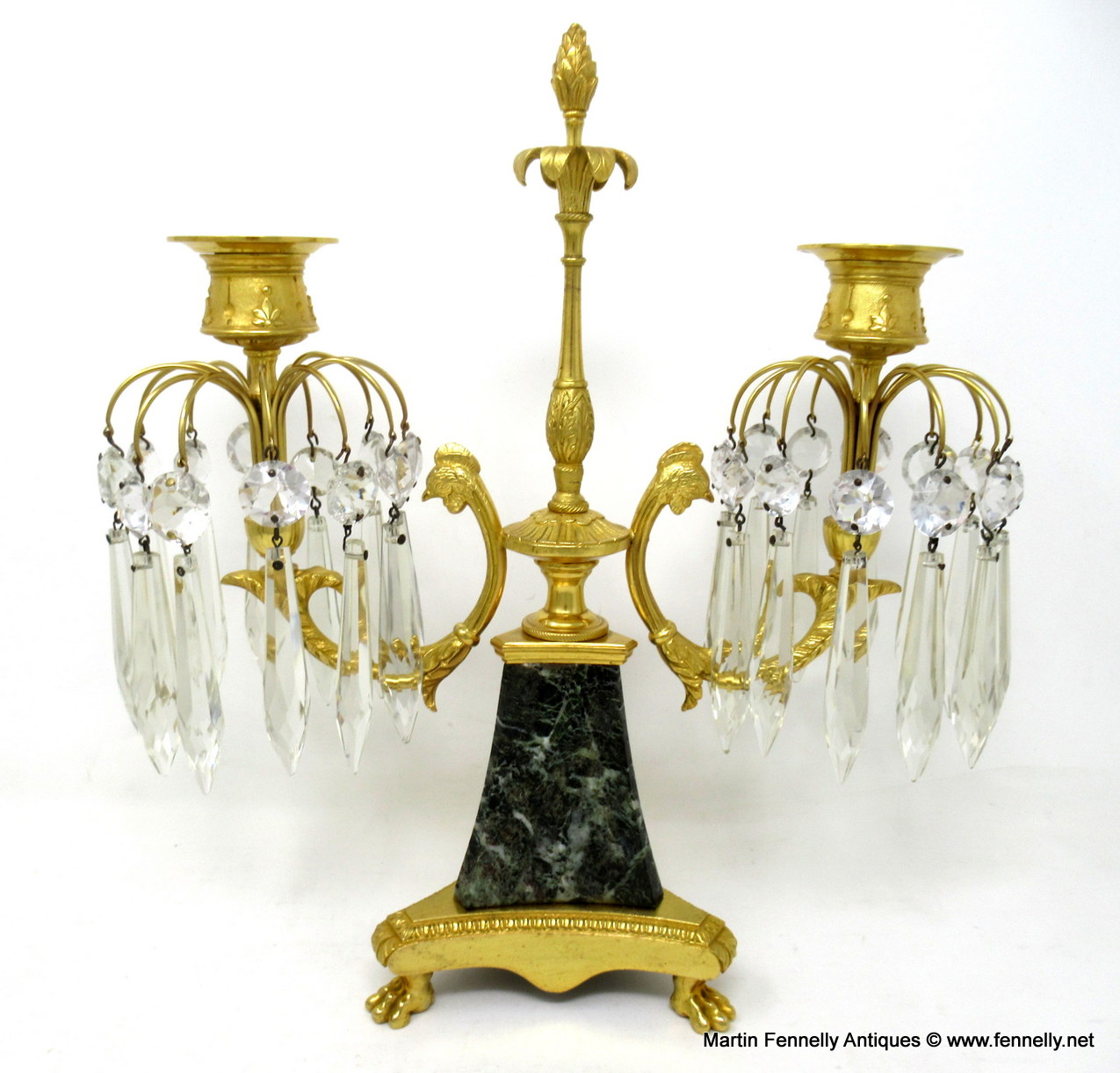 Each with a centered spire topped with a leaf canopy and an Acorn finial, issuing two decorative scrolled candelabras mounted with a Cockrel Head and a canopy of twelve hand cut crystal spear shaped prisms. The main support of nicely veined green marble, of inverted triangular outline, ending on an ormolu base with egg and dart cast decoration and supported on its original three paw feet.