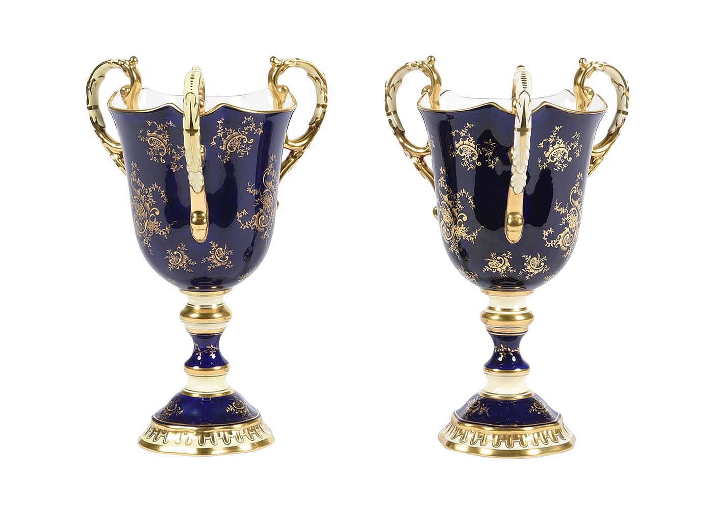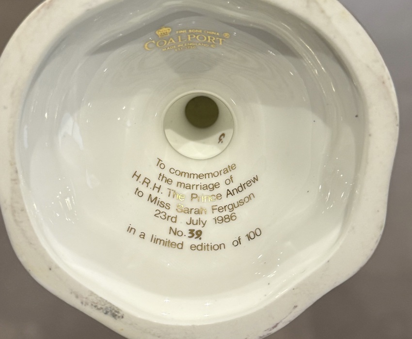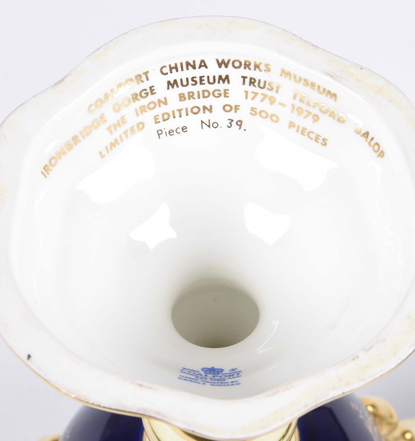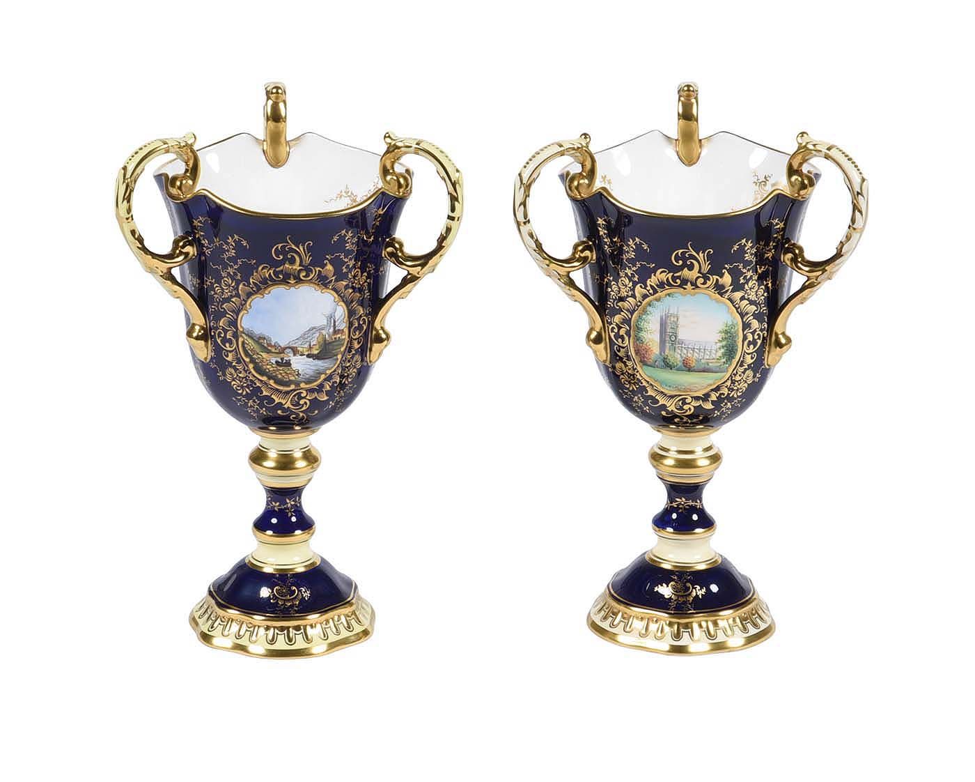 This Pair of Coalport Three Handled Vases are rather rare. One Vase depicting the Works at Ironbridge Gorge in Shropshire Numbered 39 out of 500 pieces, the urn with gold, blue, cream and gilt colouring, with three delicate handles, and a scene on one side of Ironbridge Gorge, Shropshire, with boats on the river, and smoke rising from the factory chimneys, with elaborate gilt patterns to the rest of the urn. and The second Vase numbered 39 out of 100 (1986) depicting Westminister Abbey (limited to 100 only) commemorating the marriage of Andrew Mountbatten Windsor to Sarah Ferguson with identical decoration.