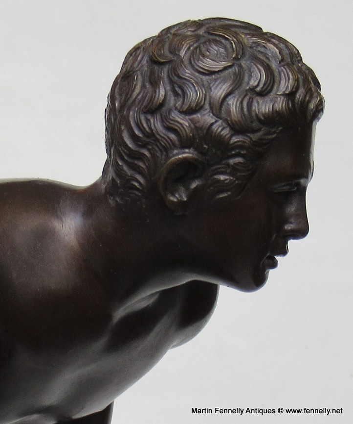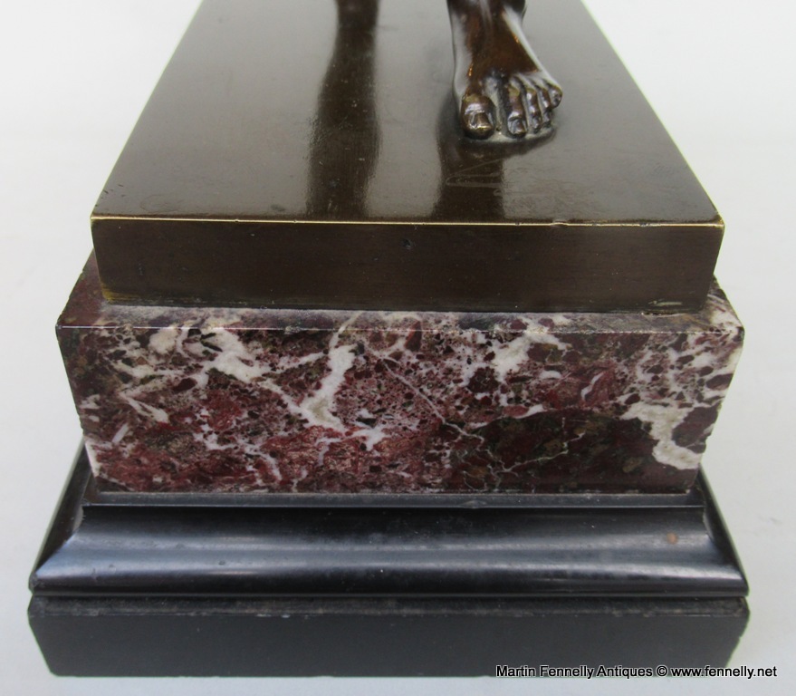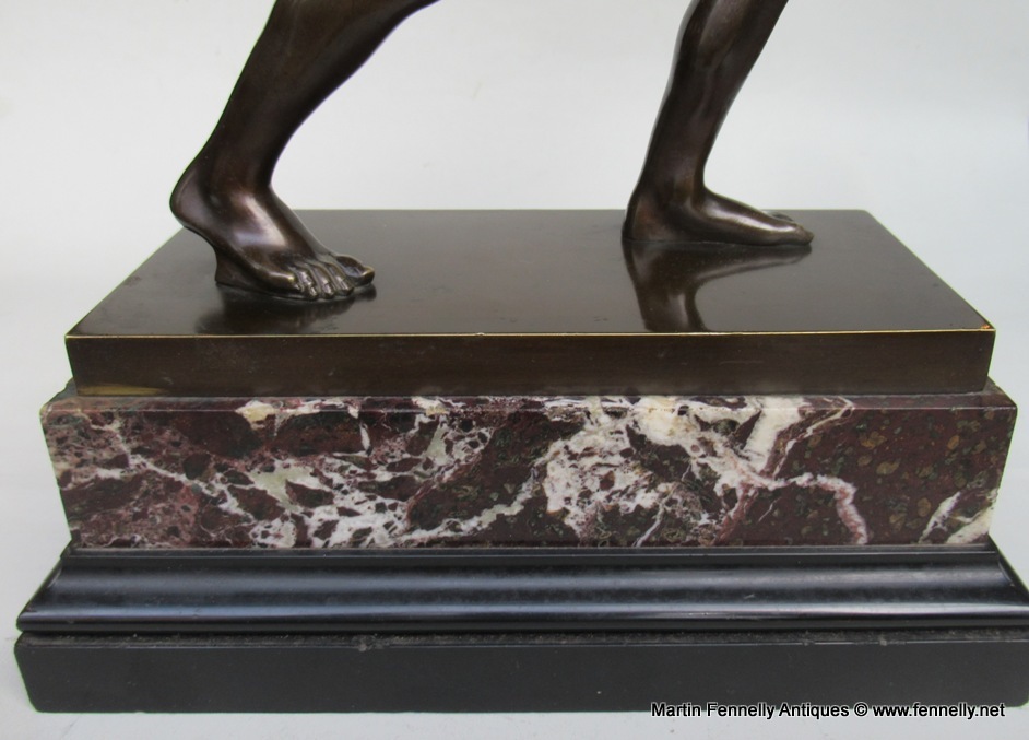 Superb example of The Borghese Gladiator with well defined muscles and tendons, first half of the 19th Century. Complete with its original cream and pink veined brown marble base, ending on a black marble stepped base.