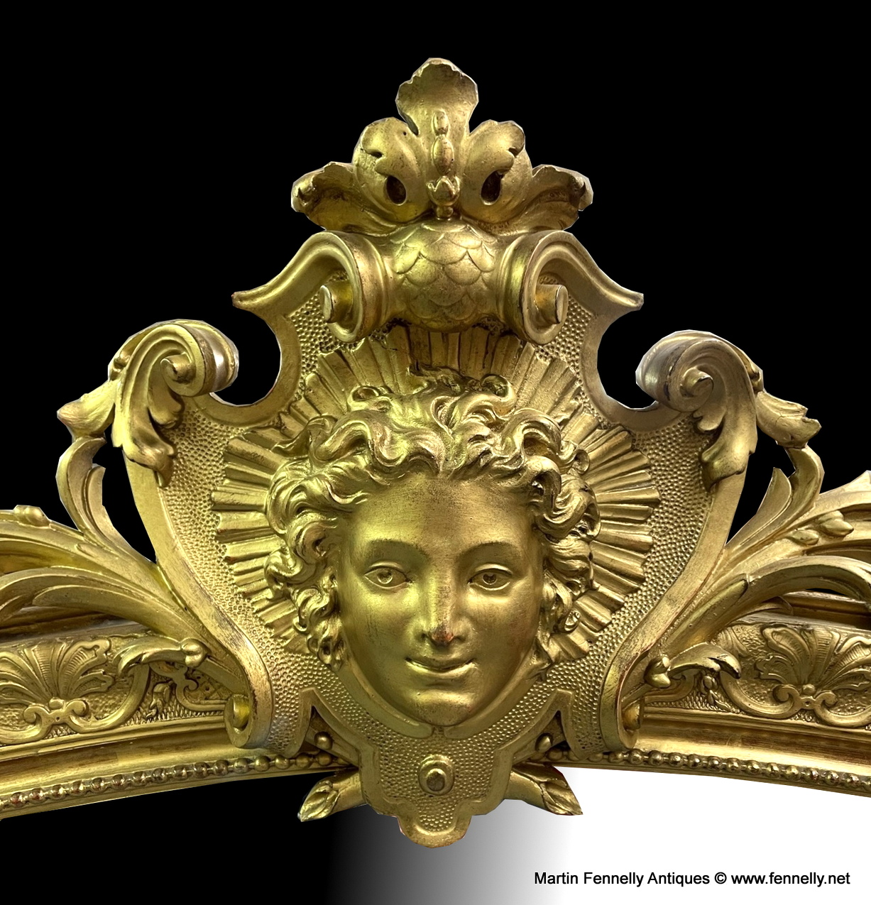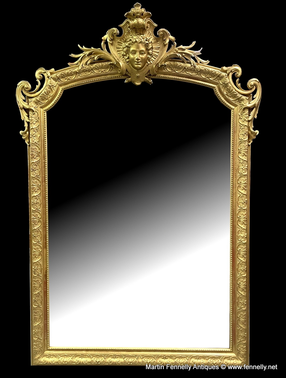 This is a Superb, Large and beautifully detailed Quality French Mirror which Dates from 1880. The stunning detail with The Sun King’s Face watching all that pass makes for a very Regal Mirror. All the ornate detail and features are intact and this mirror would need a Regal Room for it to shineat its best. It has its original Glass and Back and the Gilt frame is in an untouched state and its deep rich aged tone is wonderful. Please note the large dimensions on this mirror.