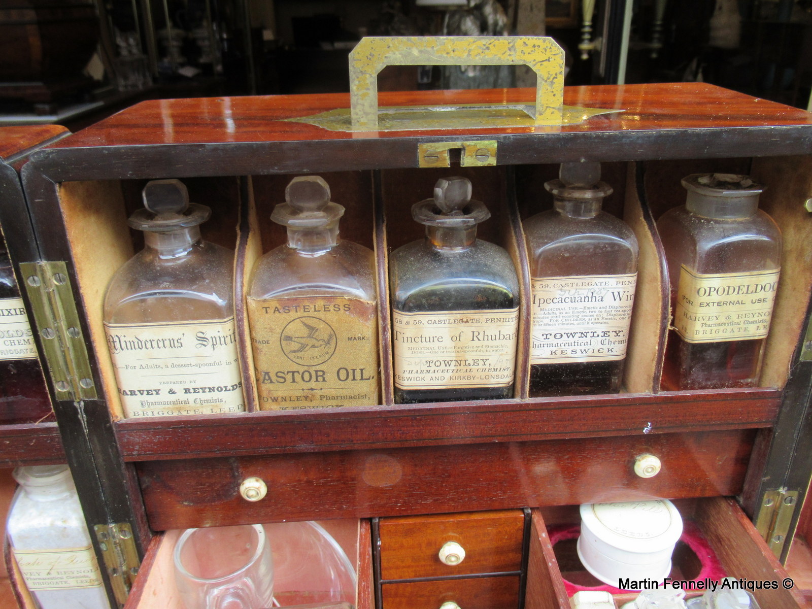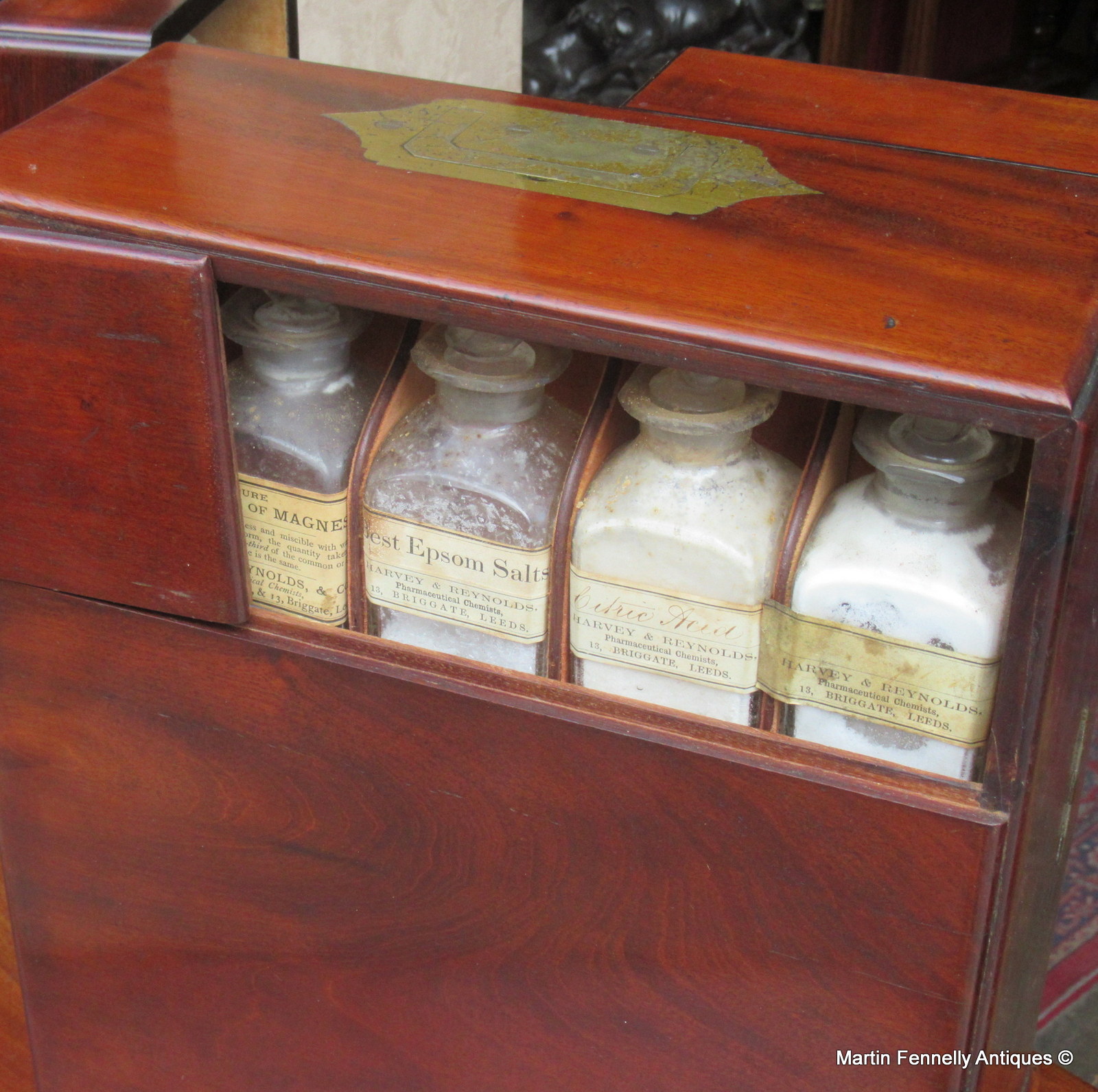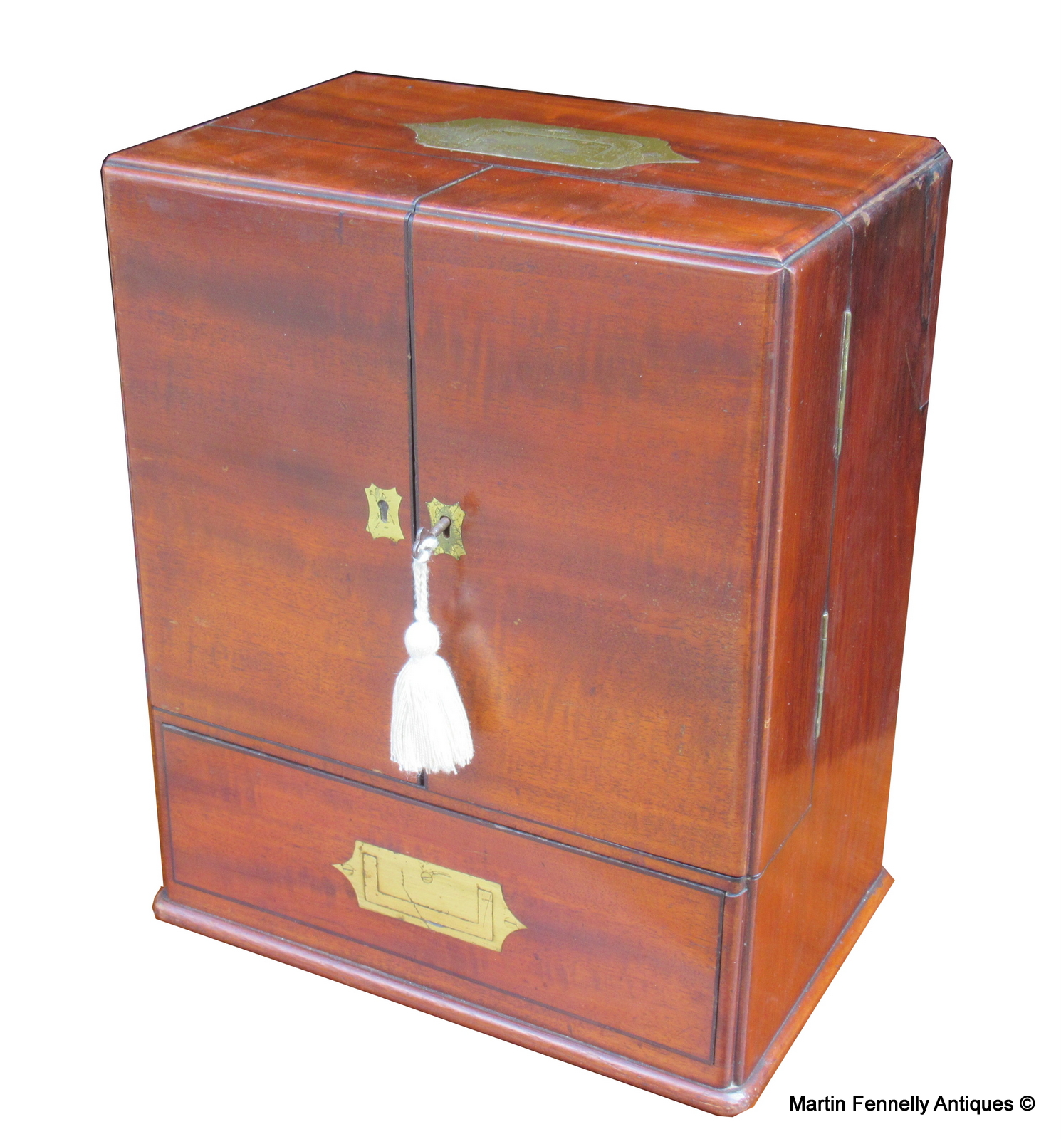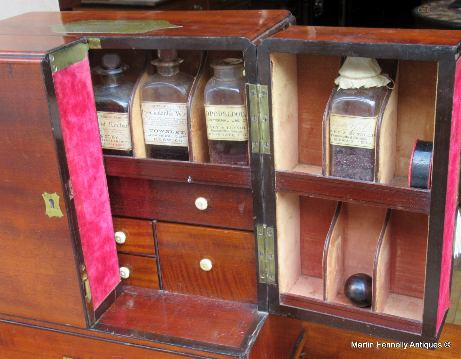 This Museum Quality Apothecary Chest which was used by a travelling Doctor or Apothecary is a very rare item, in superb condition with original working key and contents. The double doors open to reveal a sectioned interior complete with original contents. There are also several drawers complete with original contents and a secret area at the rear which is opened from a brass latch in the upper right hand side behind the door. The Patina is stunning, the Mahogany is the finest quality and the chest is complete with military brass (flat) handle and dates to Circa 1820. Apothecary Chests are always sought after and travel ones are very rare and very very rare in this condition.