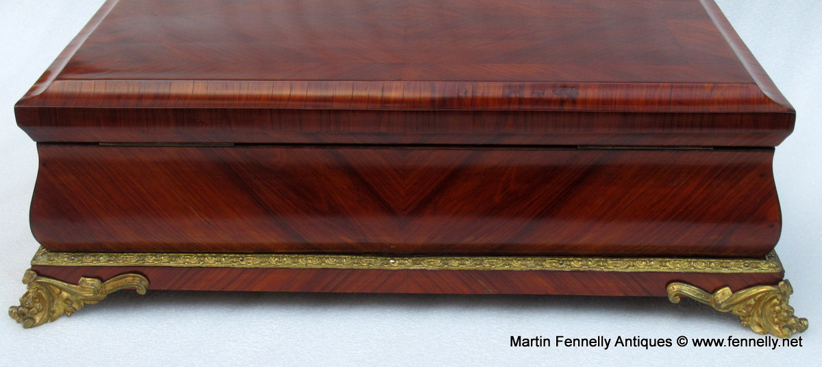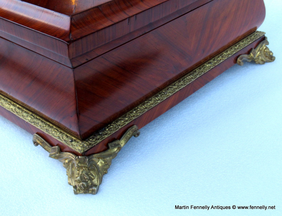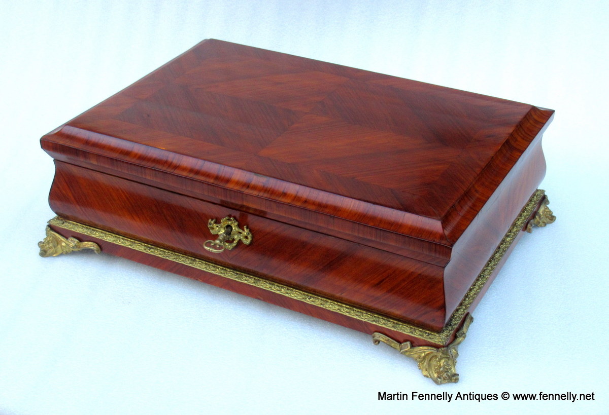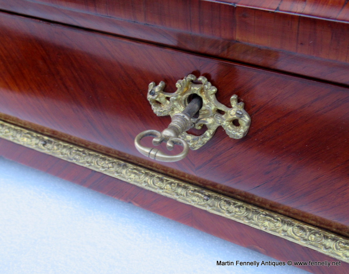 The Term Museum Quality is often over used by some of my colleagues in the Antique World but This Large French Kingwood Casket made Circa 1870 is quite simply a Masterclass in Construction, design and yes … Museum Quality. The Box although not stamped has the hallmarks of one of the top makers in Paris – Tahan. The Kingwood is of the best quality and the chequered veneering and design of the veneer is breath taking. The Box is mounted with Oromlu mounts wich are crisply crafted and the interior is in stained Birds Eye Maple all raised on 4 Ormolu feet. The original key and working lock are present.