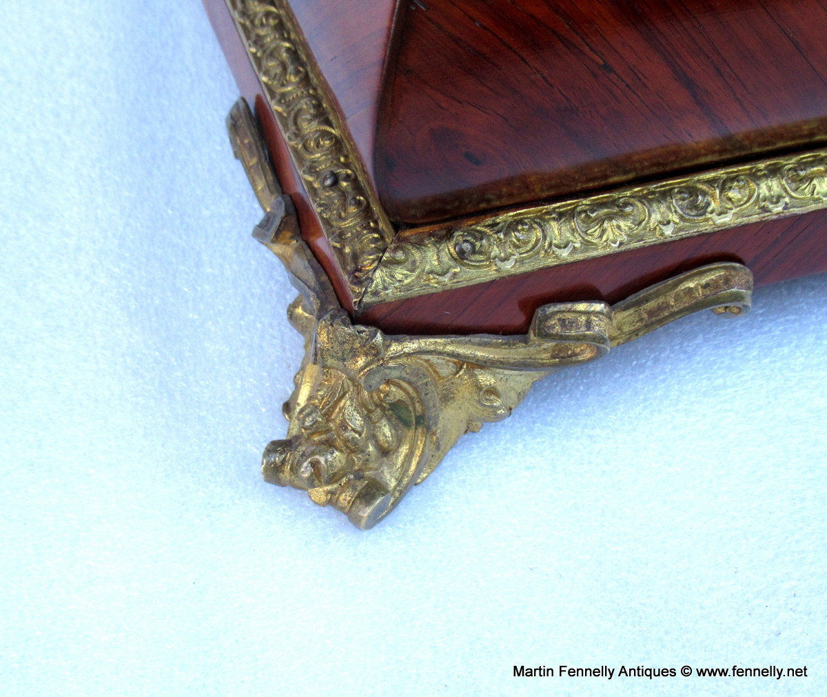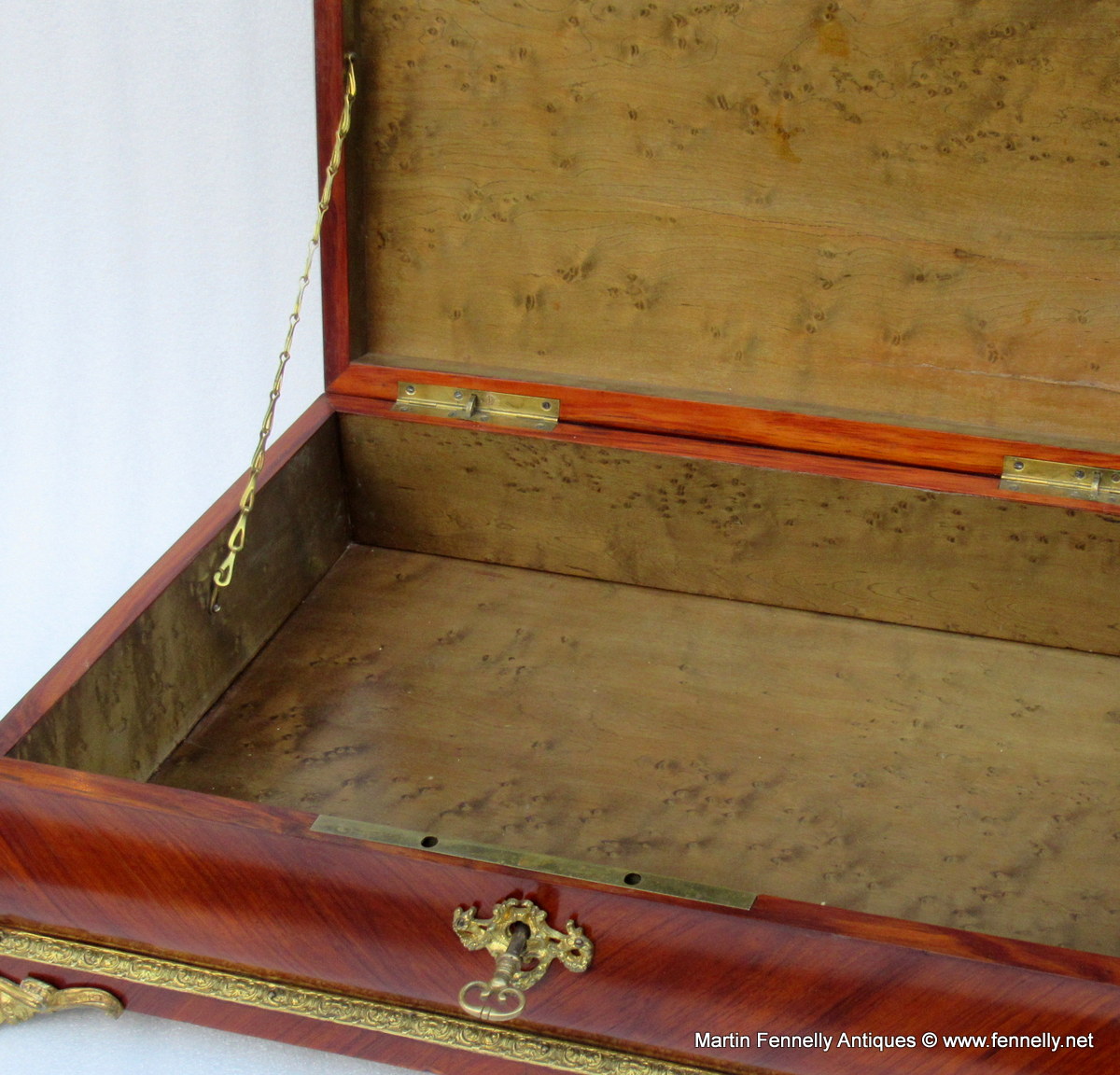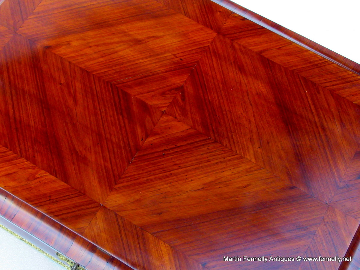 The Term Museum Quality is often over used by some of my colleagues in the Antique World but This Large French Kingwood Casket made Circa 1870 is quite simply a Masterclass in Construction, design and yes … Museum Quality. The Box although not stamped has the hallmarks of one of the top makers in Paris – Tahan. The Kingwood is of the best quality and the chequered veneering and design of the veneer is breath taking. The Box is mounted with Oromlu mounts wich are crisply crafted and the interior is in stained Birds Eye Maple all raised on 4 Ormolu feet. The original key and working lock are present.