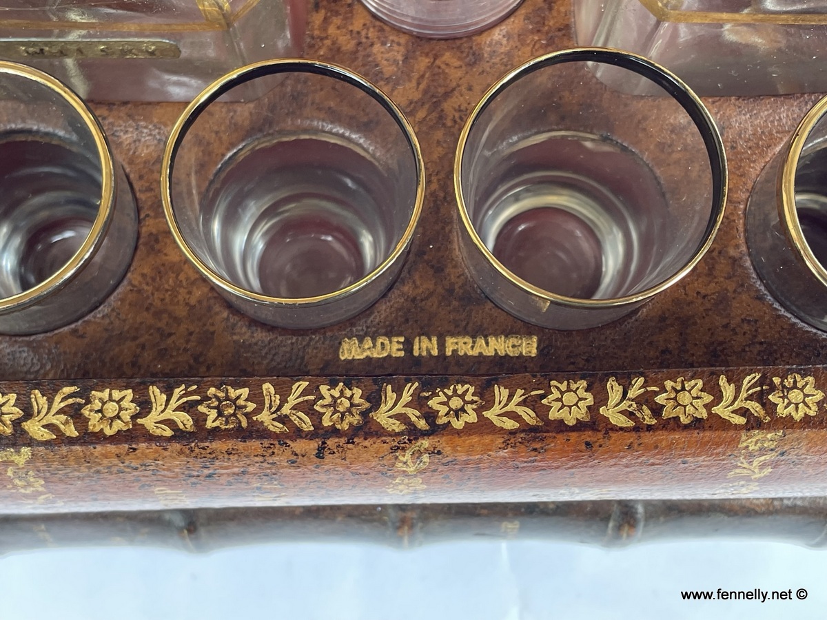 This is a charming French trompe l’oeil Liquor Tantalus box in the form of a stack of old leather bound books. With the look and appeal of a collection of antique volumes, but with the surprise and convenience of a liquor caddy hidden within. Opening to reveal a hidden storage within with fitted compartments. Housing a pair of stoppered liquor decanters and five shot glasses or cordial cups, all with decorative gilt edging. The glass liquor service is in overall good condition, no chips or cracks. The caddy box showing some wear commensurate with age and use. The ideal gift or just perfect for the desk in a private library or office setting.