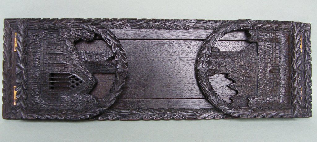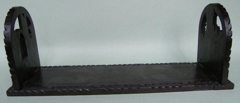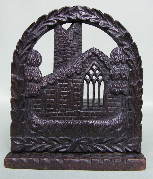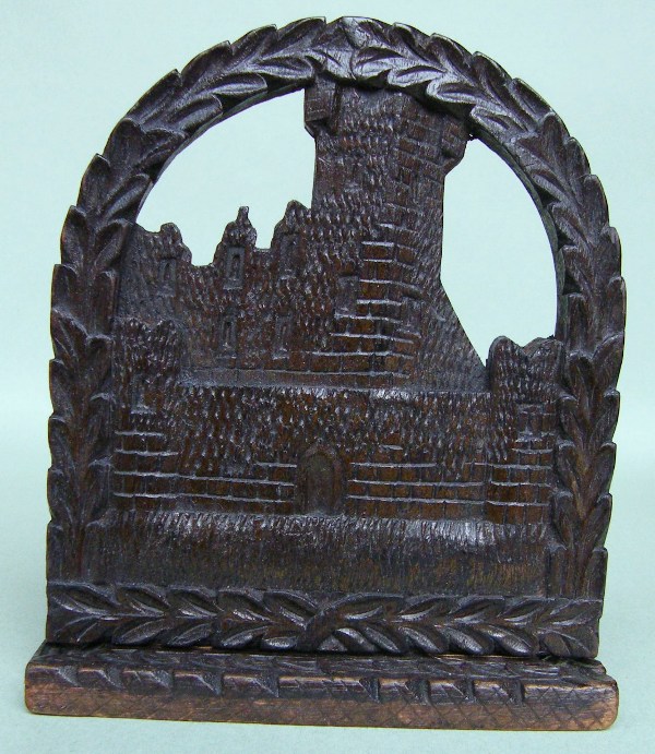 Rare Irish Hand Carved Bog Oak Book Slide of medium proportions, mid Nineteenth Century.The sliding base with a double row leaf frieze decoration around the border with a plain inner reserve. One hinged folding bog oak bookend is carved depicting a view of Muckross within a leaf frieze border. The other folding bookend is carved depicting a view of Ross Castle in Killarney Co. Kerry and has a similar border. Condition: Good untouched condition with no losses to carvings, nice surface patination.Height: 6.25" (16cm). Width: (closed) 17.25" (44cm). Depth: 5.5" (14cm).