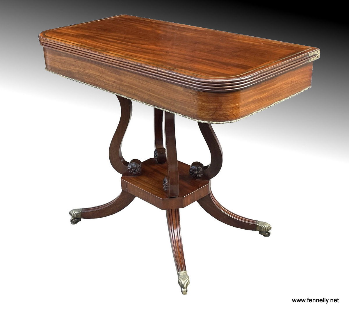 This is a Mahogany Regency Tea Table dating to Circa 1820. The D shaped fold over top is finished with a three bead edge and a plain frieze. The top is supported on a four scroll support and raised on four Cabriole feet with original Cast Castors. This is a very fine piece of furniture and in very good condition.