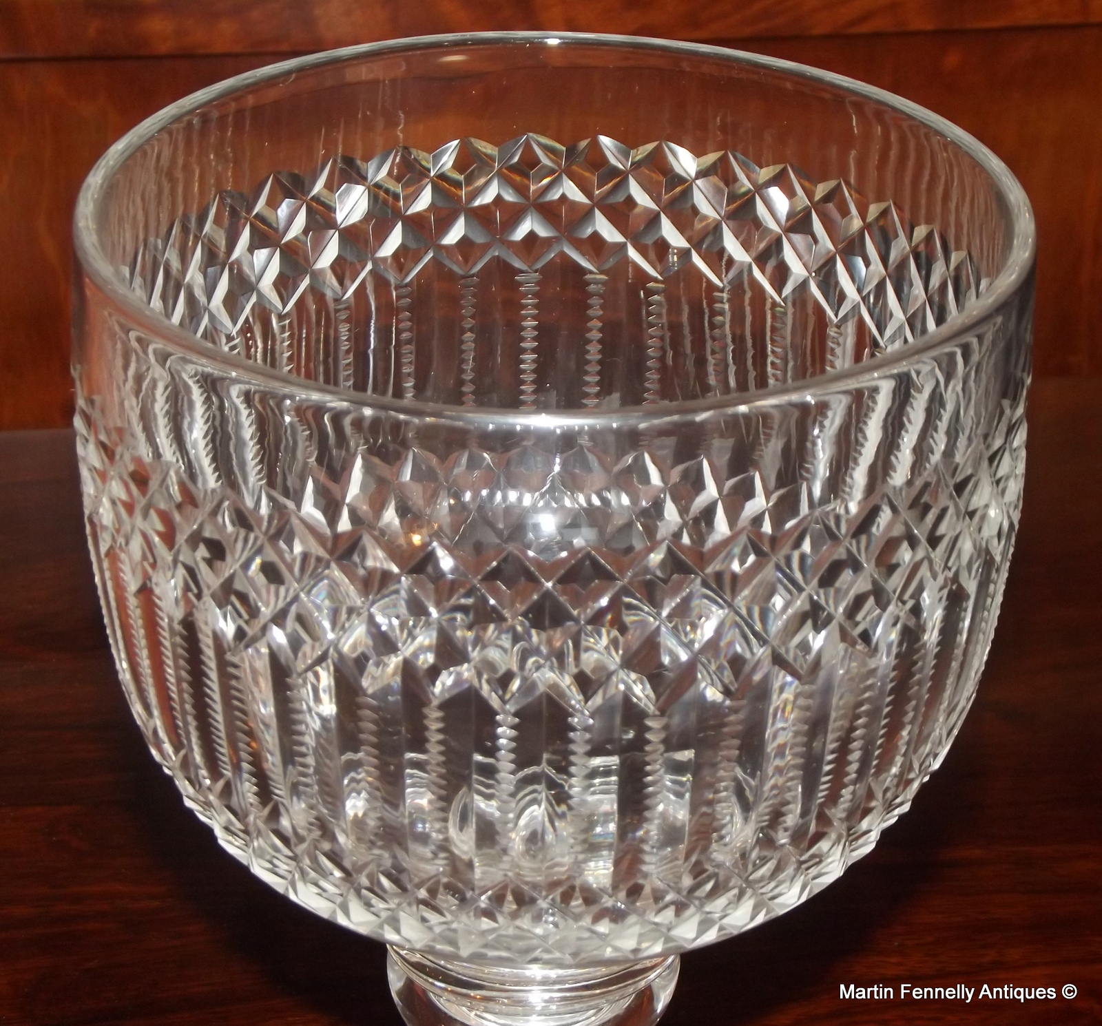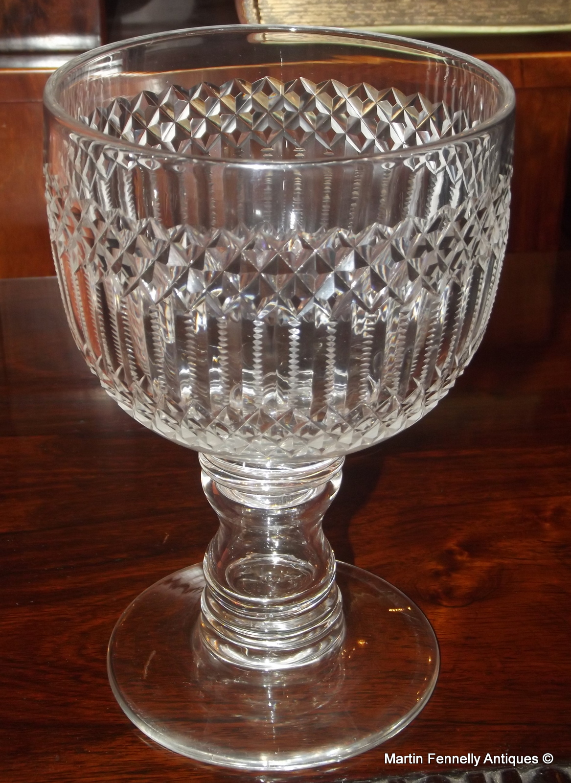 This is a very large Crystal Chalice dating to Circa 1900 and in great condition. The Circular top of the Chalice has Hob Nail and Saw Tooth Cut design. The thick column Stem has turned detail. The Spreading circular is also large. This is a beautiful Chalice and would make a stunning Centrepiece on any Table.
