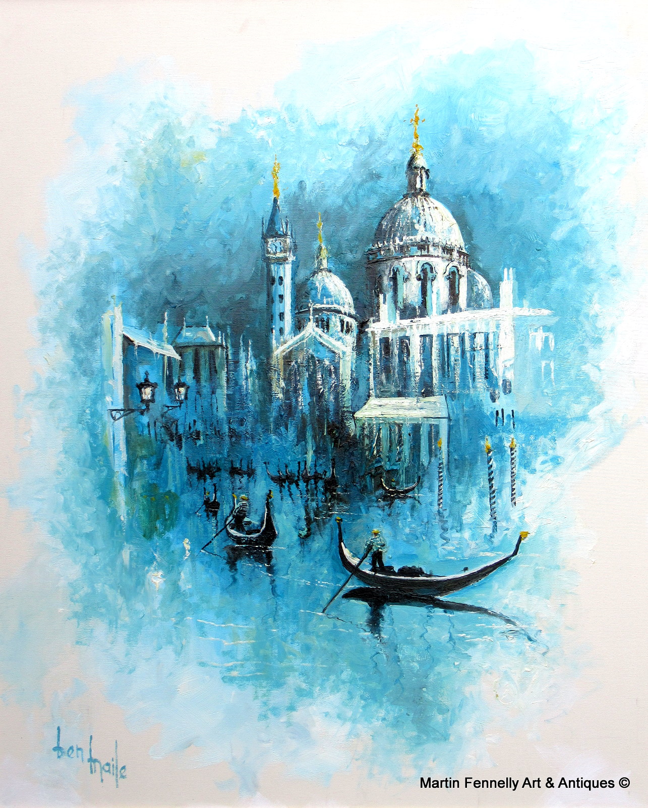 Rare Oil on Canvas Framed by Ben Maile (1922-2017) ‘Gondolas Venice’. Ben Maile was an internationally known artist whose work features in many significant collections, including those of the British Royal family and major international corporations. Ben Maile exhibited worldwide from Alaska to Australia. In America he was the only British artist ever to win the prestigious annual commission from the West Point Military Academy. His very first West Point print ’The Long Gray Line’ has become the most sought after of all time among the collectors of American militaria. Ben Maile in later life resided in Cork Ireland until his death recently RIP. Frame Width 32.5" (82.5cm) Height 39" (99cm) €2450