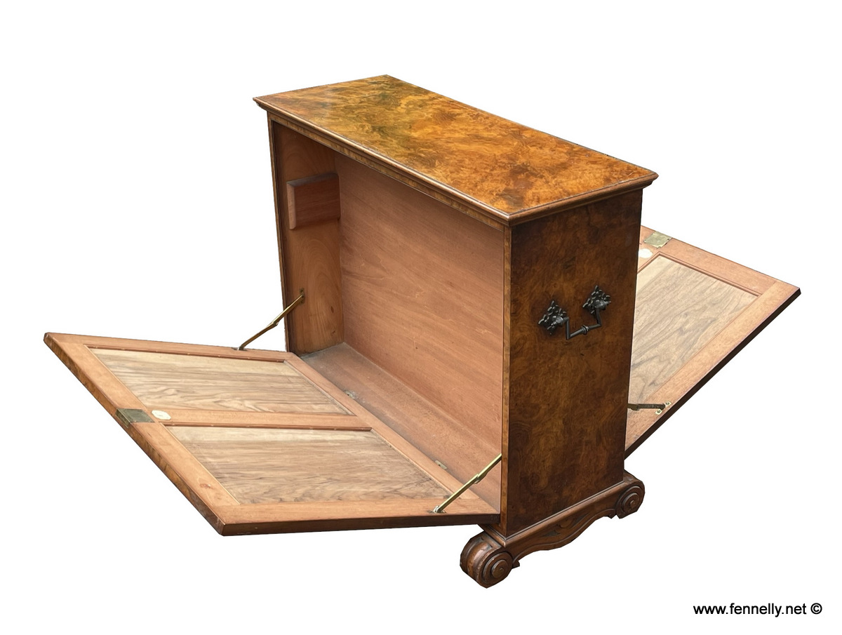 This is a rare Piece of Furniture. Library Chart/Map Cabinet in stunning Burl Walnut, dating to Circa 1870, complete with original carrying handles and in great condition. The Cabinet is constructed to look like a normal side cabinet but each side door opens on the horizontal to enable easy storage of large charts or maps. There is nice provenance on this one and it resided in an impressive library. The piece is heavy and very solid raised on scrolled bun feet.