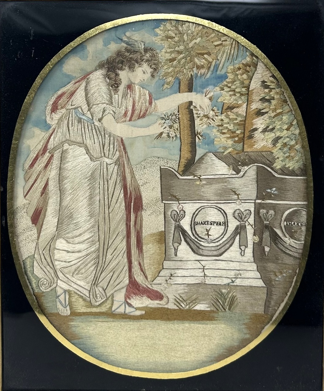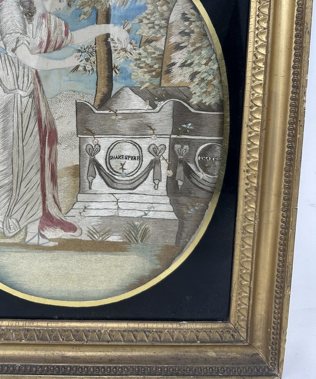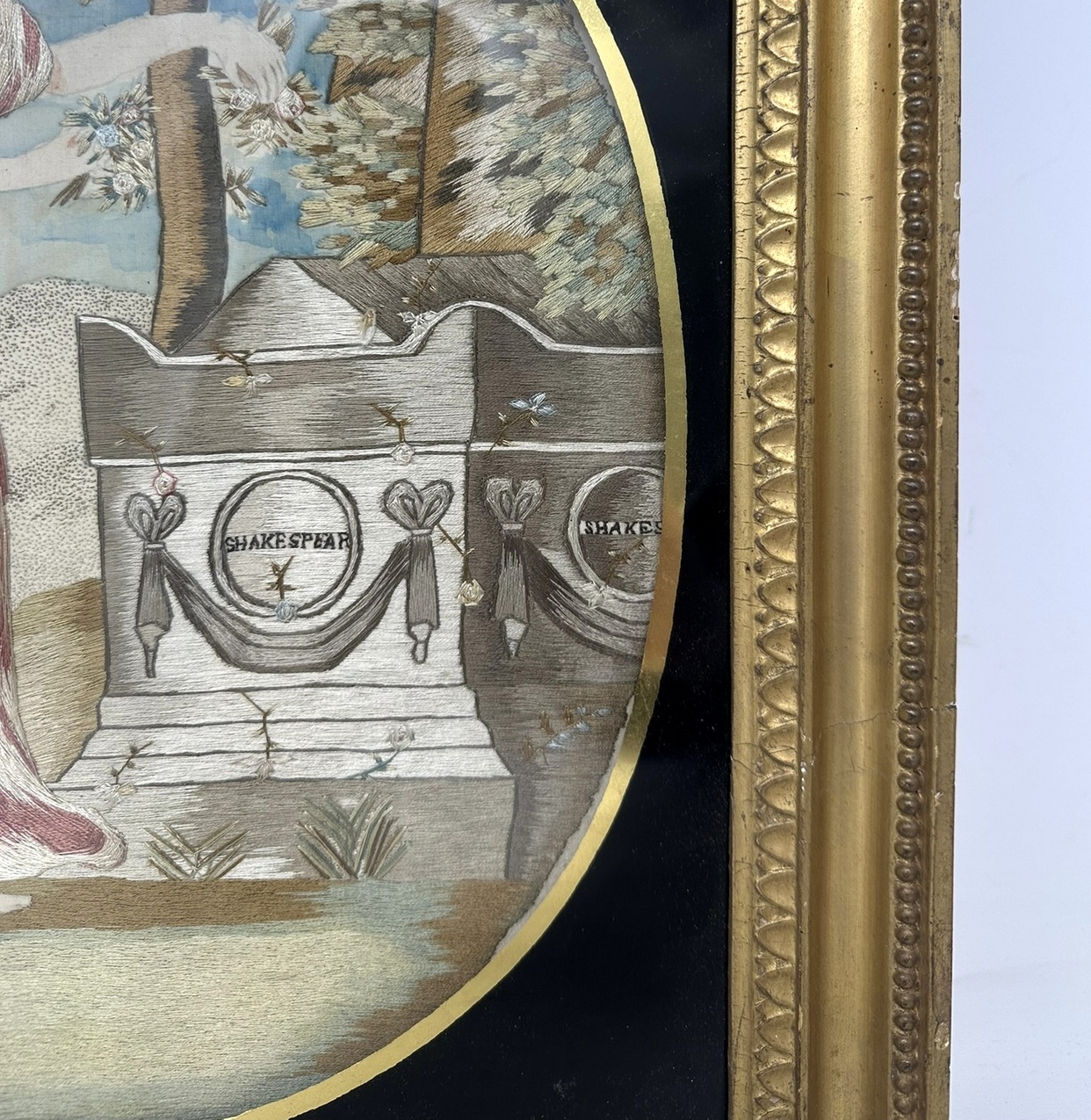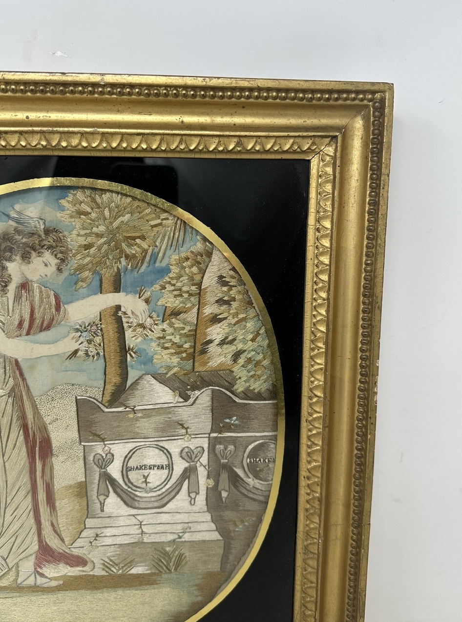 Depicts an oval form view of an affluent Lady placing a wreath on Shakespear tomb, within an eglomise frame with 22carat gold glass surround on a superb giltwood frame. This is commonly titled “Fame at the Tomb of Shakespeare”