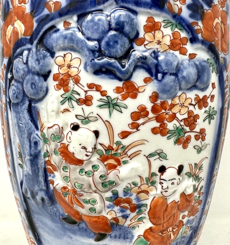 The main outer porcelain ovoid body form with ribbed glazed surface detail and all over typical decorative Imari palette in colours of iron red and cobalt blue tones with gilt highlights on an off-white ground.