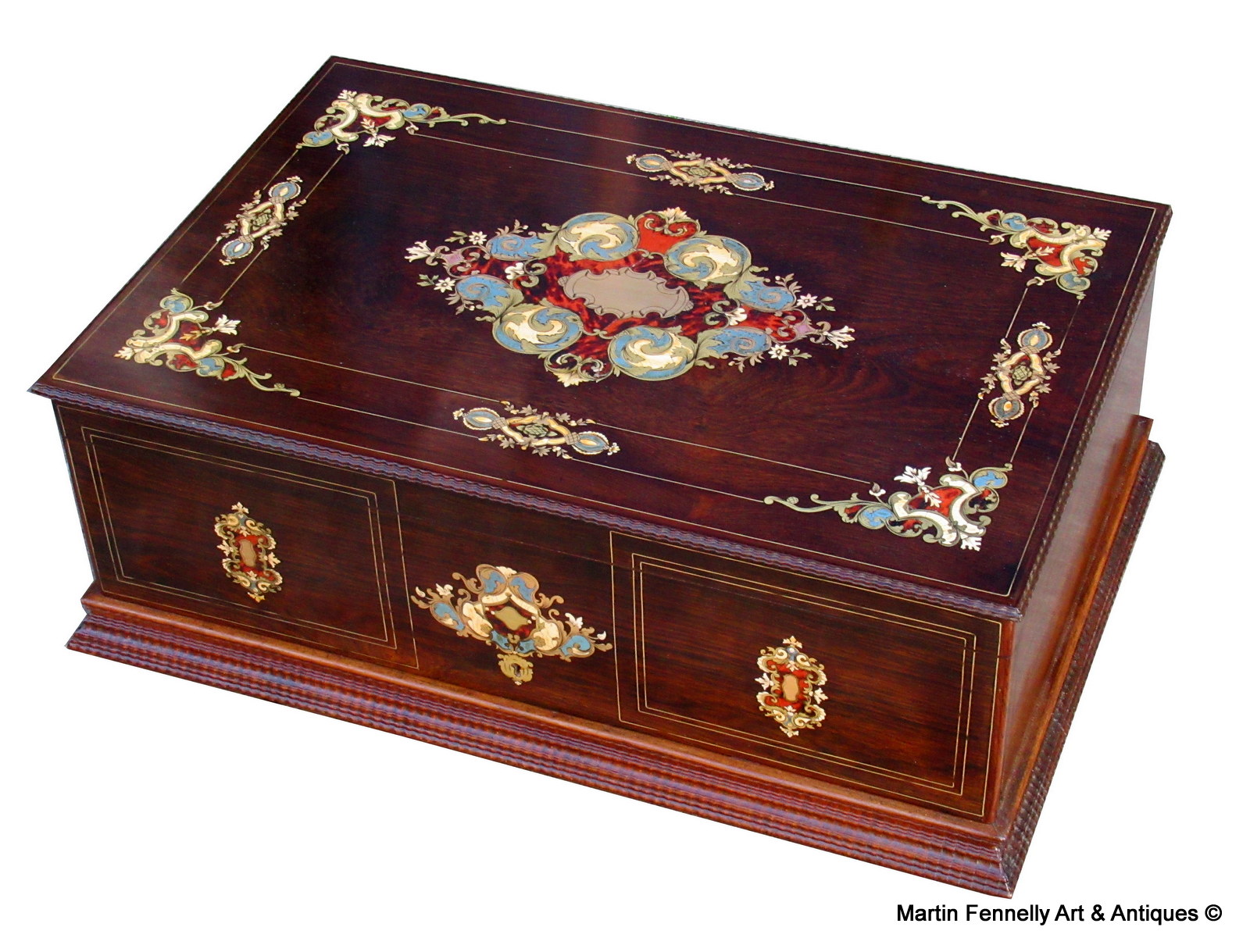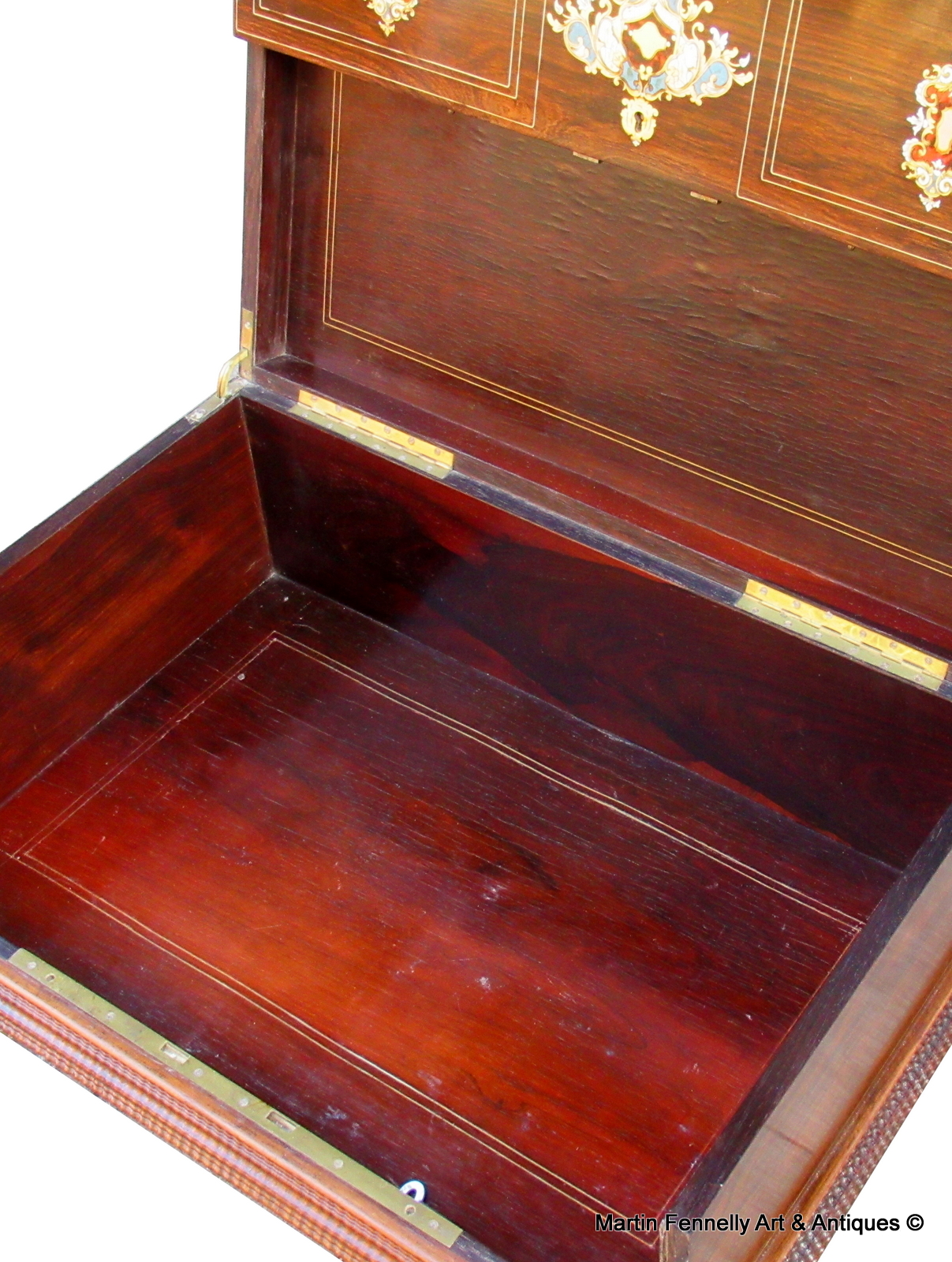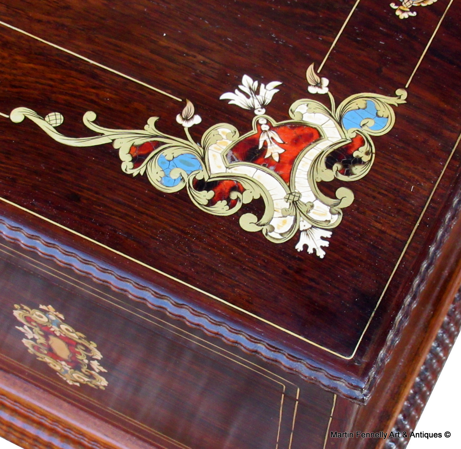 The Term Museum Quality is often over used by some of my colleagues in the Antique World but This Large French Casket made Circa 1890 is quite simply a Masterclass in Construction, design and yes … Museum Quality. The Box although not stamped has the hallmarks of one of the top makers in Paris – Possibly Tahan. Lets Start with the Woods used in the Superb French Creation – Rosewood is the dominant wood with Brass. Tortoiseshell and Lapis Lazuli inlay. The Box is mounted with Brass, inlayed with Brass, Abalone Shell and raised on 4 Brass feet. The Top opens to reveal a fitted interior with large storage area. It is very easy to run out of Superlatives with this Box which would make a superb Gift for someone with very special items to store. The original key and working lock are present.