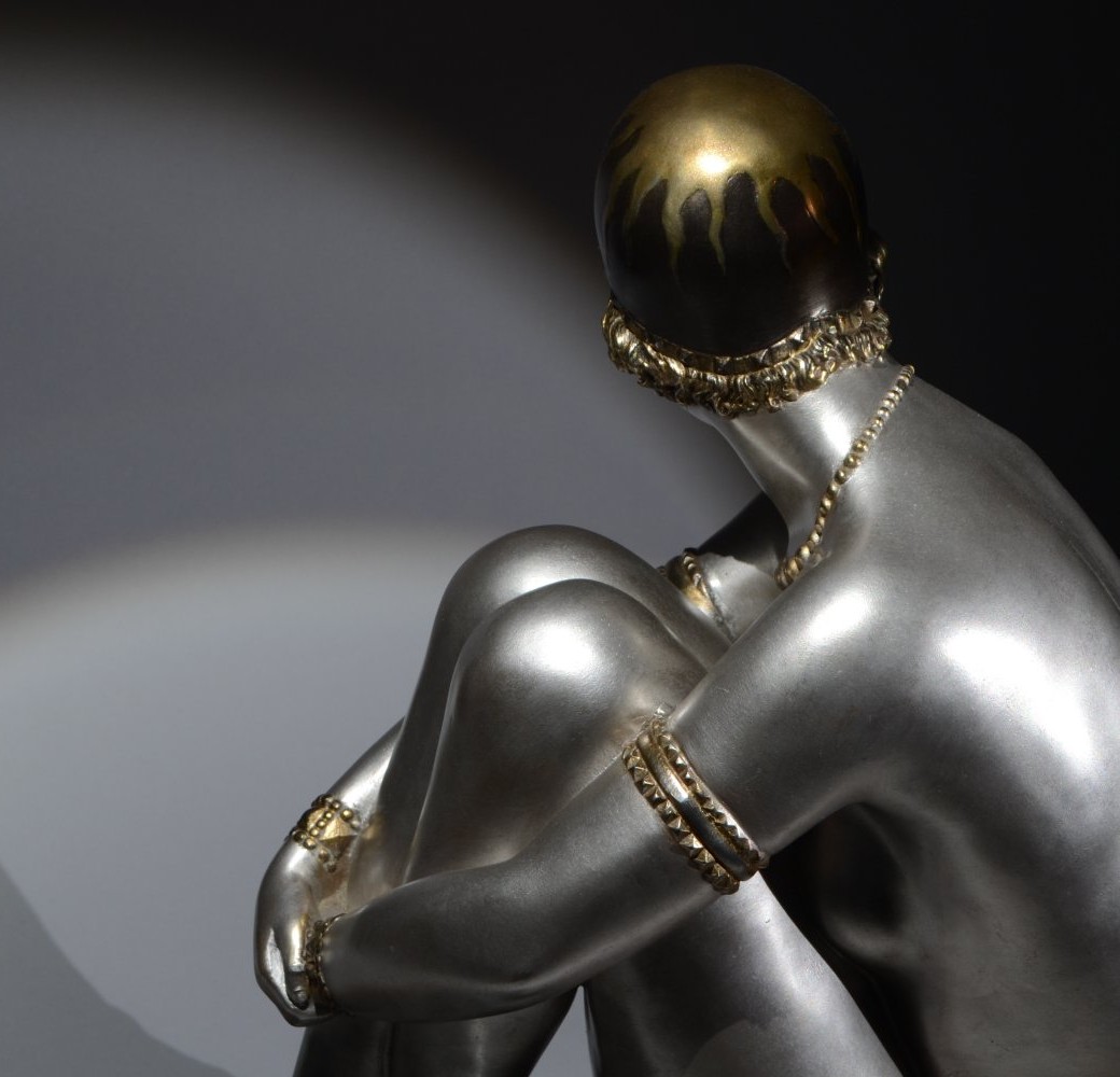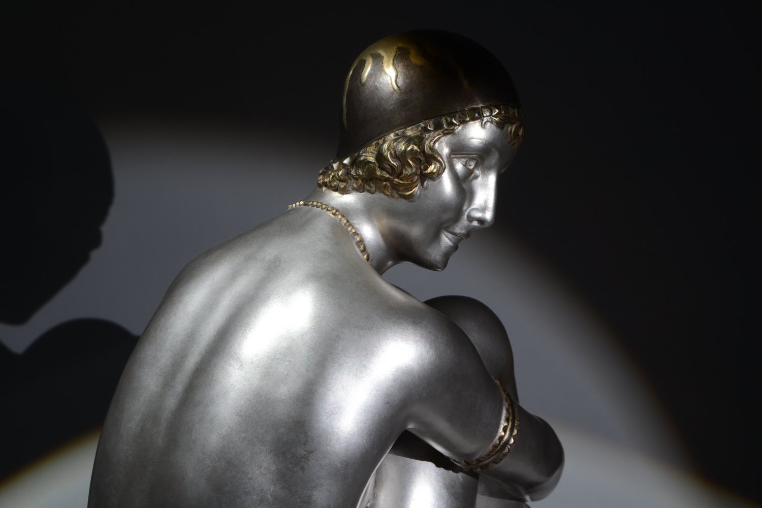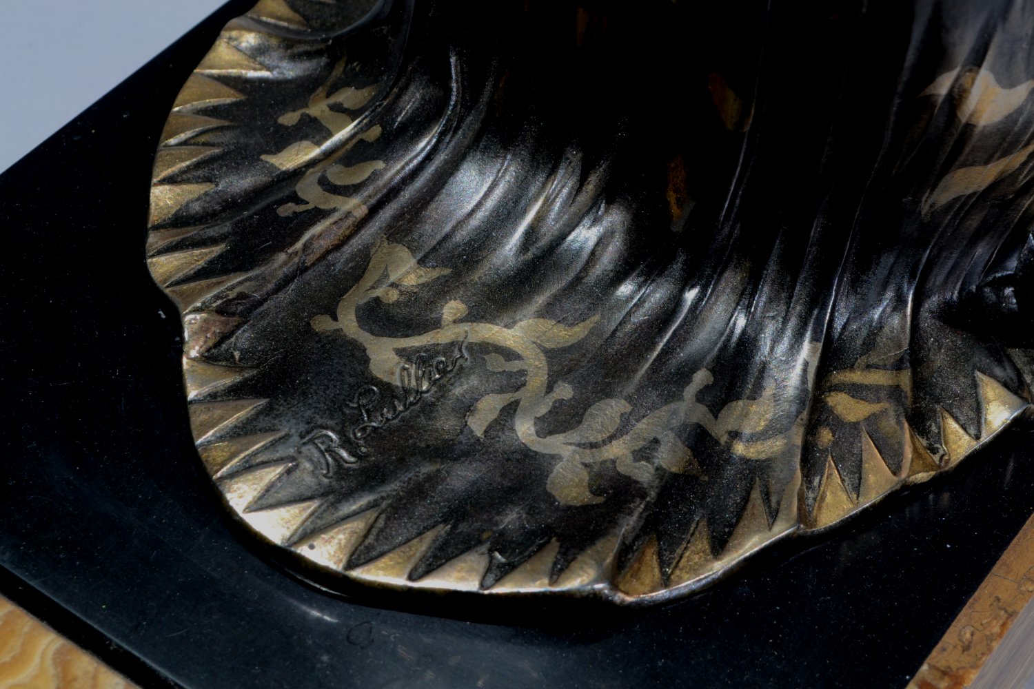 This is an impressive French piece by the famed Art Deco sculpture, Dh. Chiparus (1886-1947). This patinated metal flapper / dancer on marble and onyx base is signed ‘LULLIER’ on the metal. (Chiparus Pseudonym). It is now historically and technically established that the name Lullier (often signed R. Lullier) was one of the primary pseudonyms used by the artist Demetre Chiparus. This choice was personal, as it was the maiden name of his wife, Julienne Lullier. The use of this alias served a specific commercial strategy: it allowed Chiparus to distribute his models through secondary foundries, such as Reveyrolis, while honoring exclusivity contracts held under his own name with prestigious houses like Etling or Les Neveux de J. Lehmann. Please note dimensions – Large size. Excellent condition and patina.