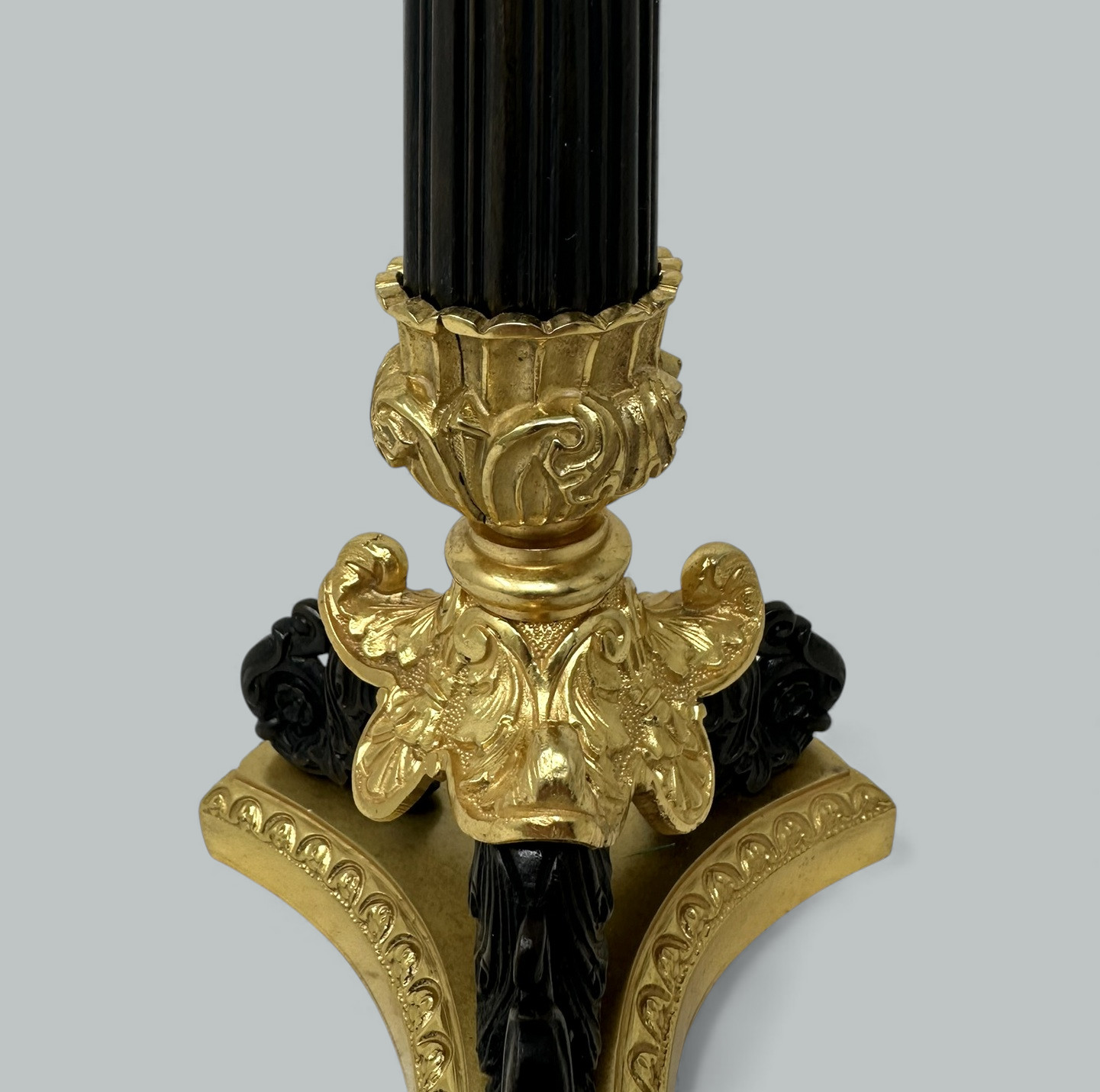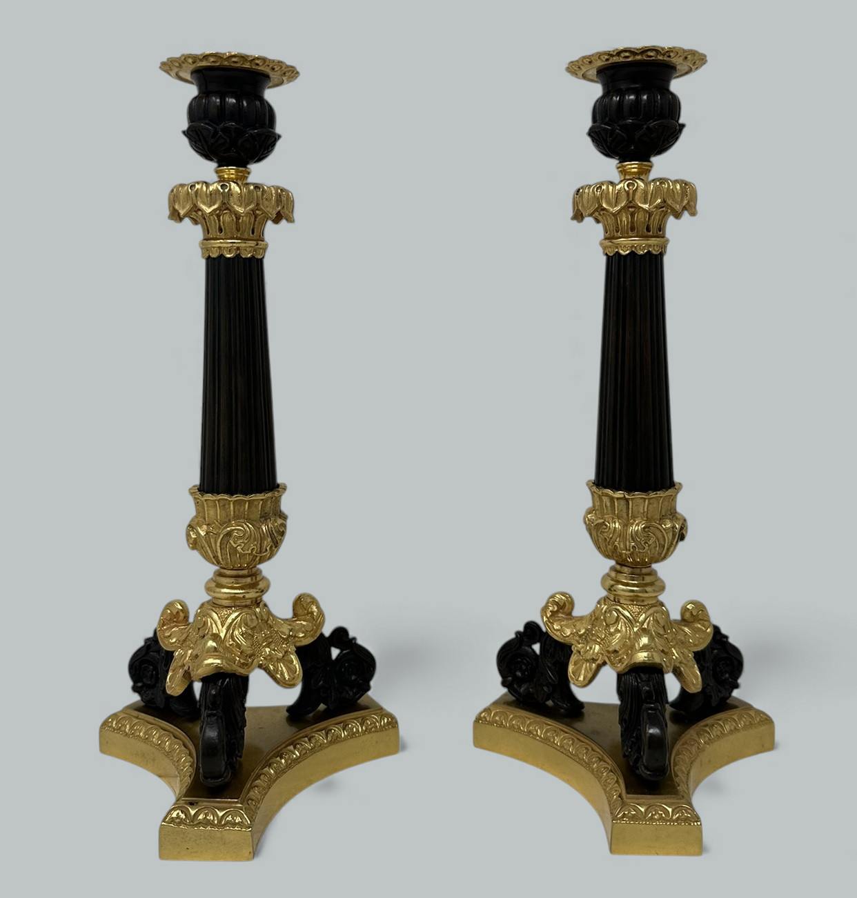 Pair French Heavy Gauge Ormolu Bronze Dore Single Light Mantle or Table Candlesticks of chisel cast quality and of generous tall proportions. Each having a Campana-form leaf cast candle socket with original firm fitting removable foliate edge drip pan. The broadening reeded turned bronze central stem with Acanthus terminal, raised on three elaborately leaf-capped bronze scrolling supports and ending on a plain tri-form inverted base. Third quarter of the Nineteenth Century, possibly Victorian period. Condition: Superb condition possibly never used, these pieces have been professionally re-gold plated and bronze patinated, complete with original firm fitting removable drip pans.