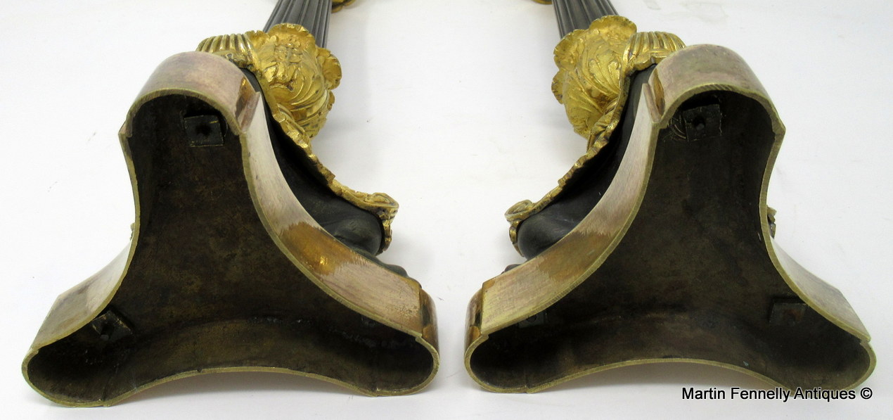 Each having a Campana-form candle socket with original firm fitting removable foliate drip pan. The broadening reeded turned bronze central stem with Acanthus terminal, raised on three elaborately leaf-capped bronze paw supports and ending on a plain tri-form inverted base. First half of the Nineteenth Century, possibly Regency period.