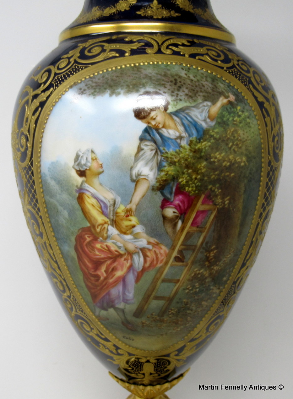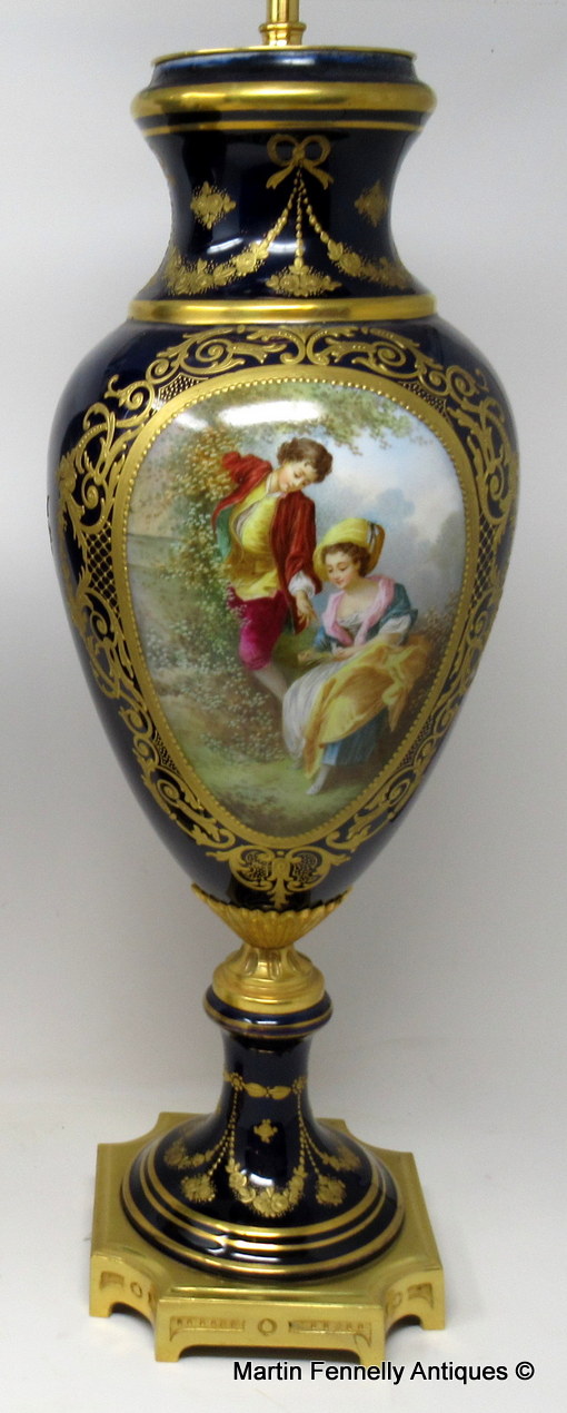 Large Pair French Sevres Soft Paste Porcelain and Ormolu Urns of bulbous form and outstanding quality, now converted to Electric Table Lamps. Raised on ornate ormolu bases with canted corners, each central reserve depicting Courting Couples in Eighteenth Century dress in landscape within a lavish raised gilt surround, back views with unusual raised gilt decoration on a rich cobalt blue ground.