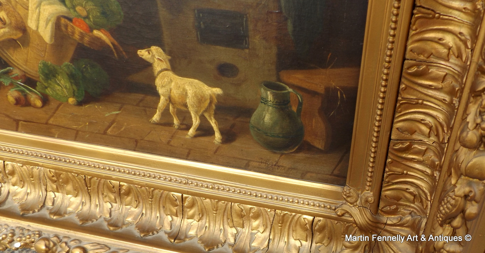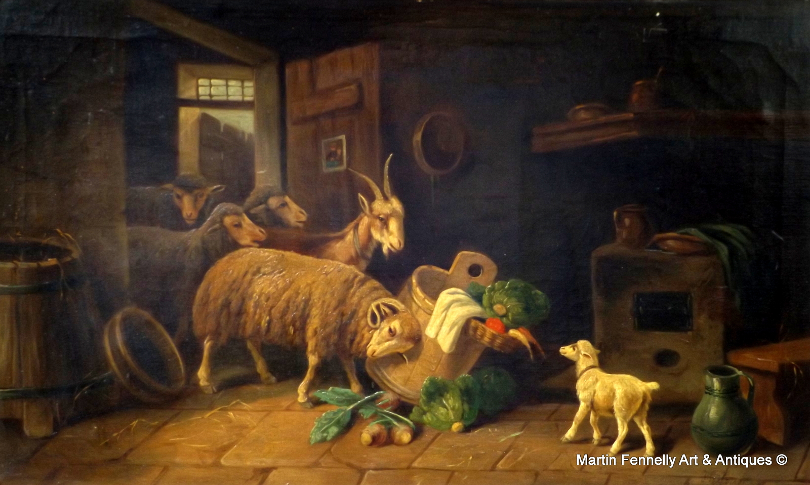 This is a Lovely Farm Scene very much in The Edgar Hunt School of Animal Painting. This painting is signed lower right and has the original Frame. The Farm Scene of Sheep and Goats in the Barn is a very Romantic Victorian Scene and a very appealing theme of the time. The Condition is Fair and the frame is also in Fair condition.