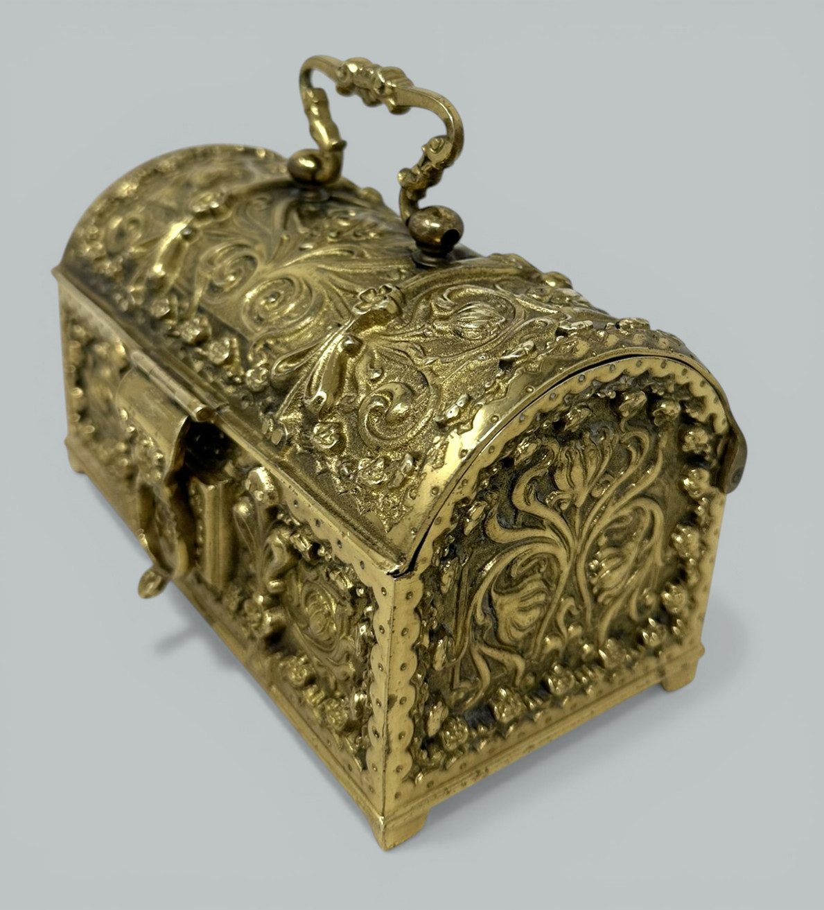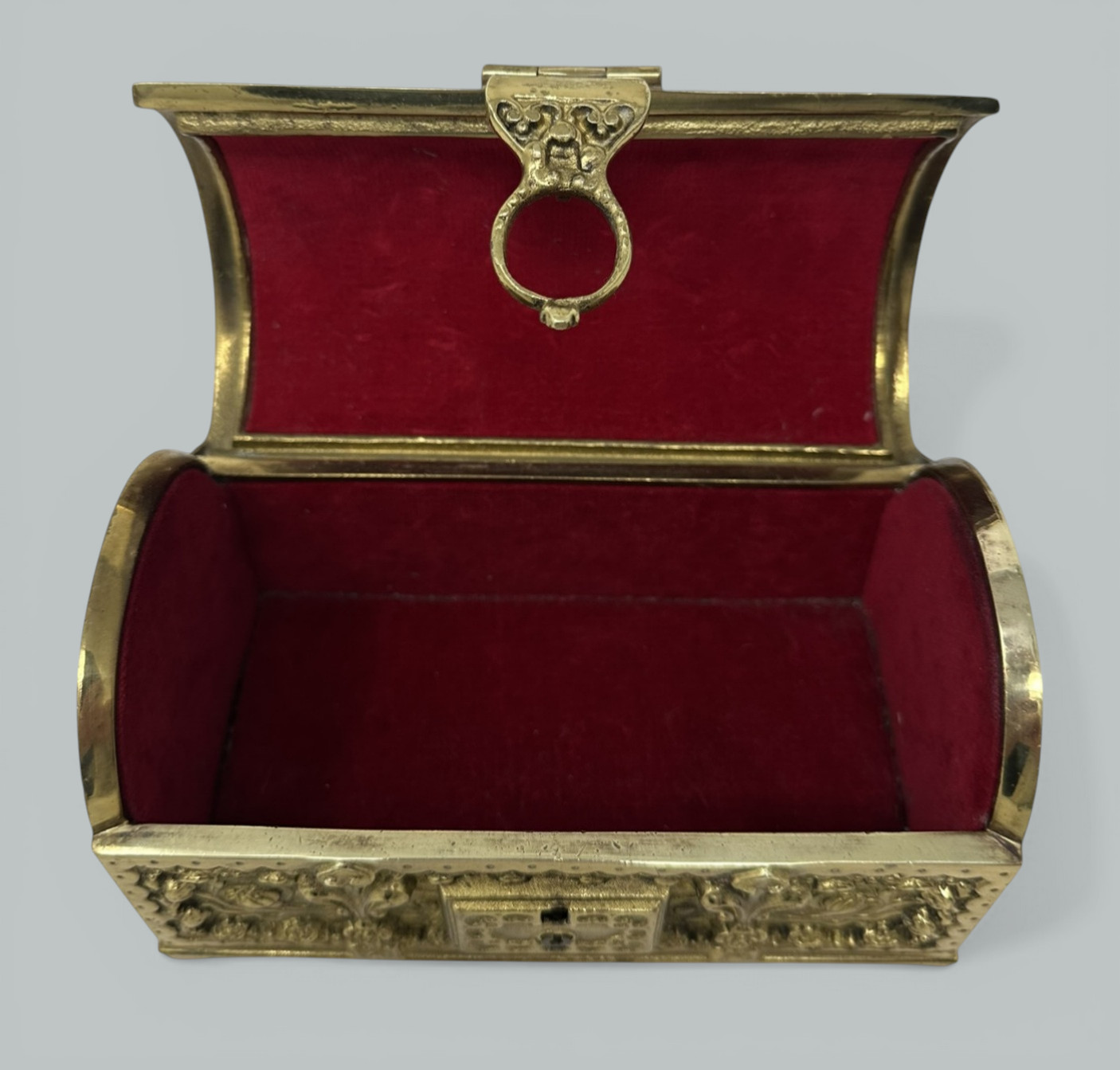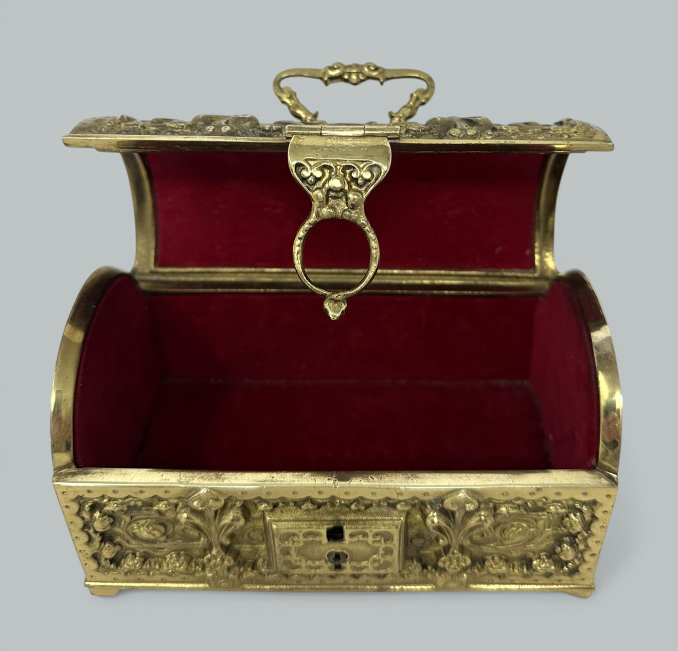 Beautiful quality Art Nouveau Gilt Metal Jewelry Casket, made in Germany in c. 1900, firmly attributed to renowned maker Erhard & Sohne. The highly elaborate gilt metal case is emblazoned with intricate floral designs on all four sides. The casket is heavy and of a larger size than similar examples. The body of the casket is raised on bracket feet. The interior is lined with its original red velvet, perfect as a miniature treasure trove. Condition: Good condition with nice surface patination, lock is present lacking key, nice clean interior condition possibly never used. Back and front views are similar.