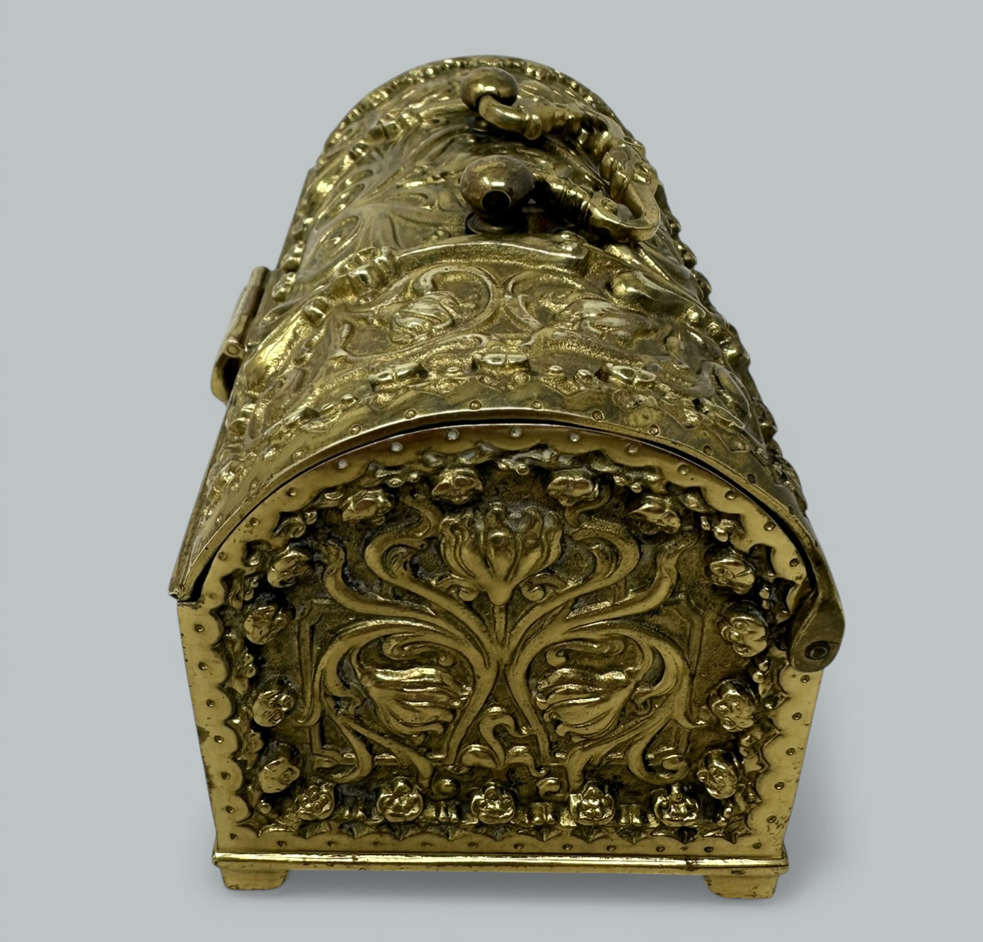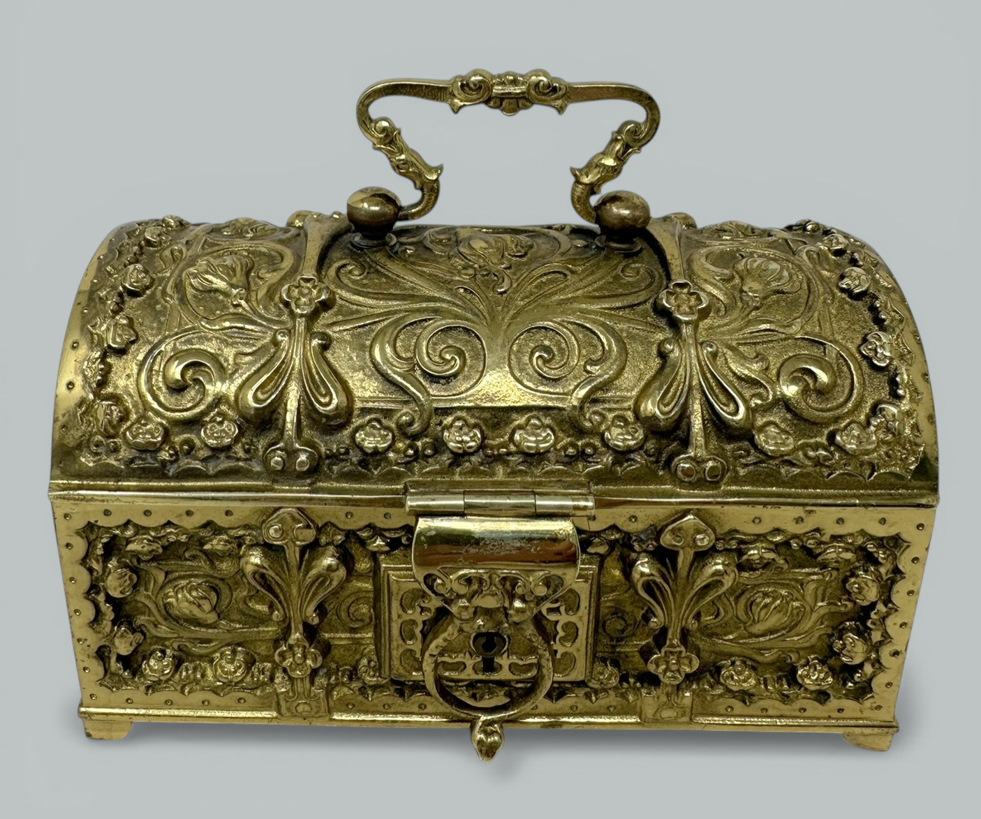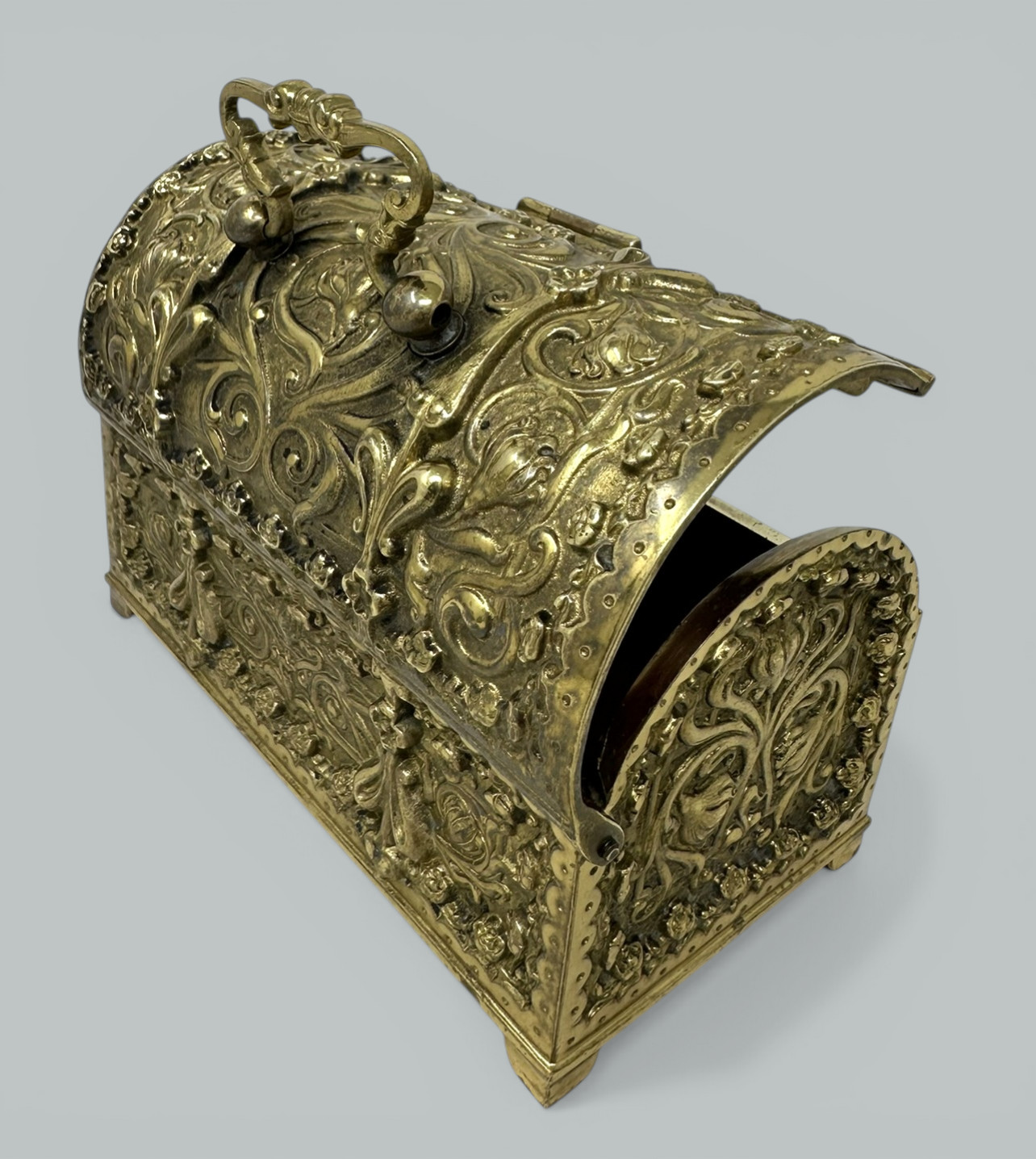 Beautiful quality Art Nouveau Gilt Metal Jewelry Casket, made in Germany in c. 1900, firmly attributed to renowned maker Erhard & Sohne. The highly elaborate gilt metal case is emblazoned with intricate floral designs on all four sides. The casket is heavy and of a larger size than similar examples. The body of the casket is raised on bracket feet. The interior is lined with its original red velvet, perfect as a miniature treasure trove. Condition: Good condition with nice surface patination, lock is present lacking key, nice clean interior condition possibly never used. Back and front views are similar.