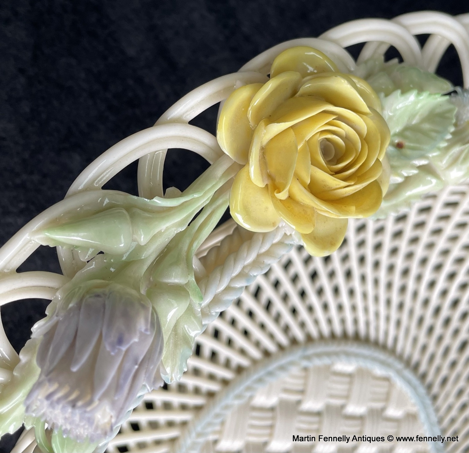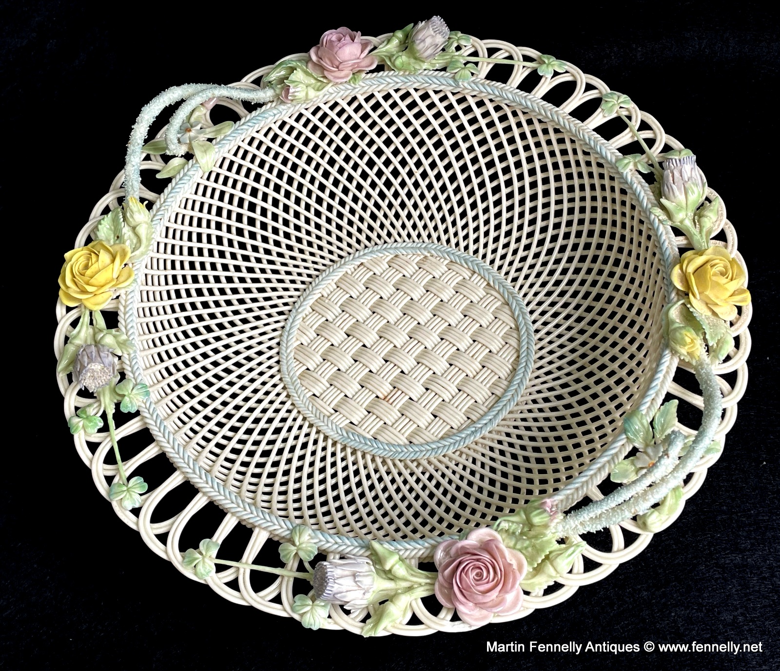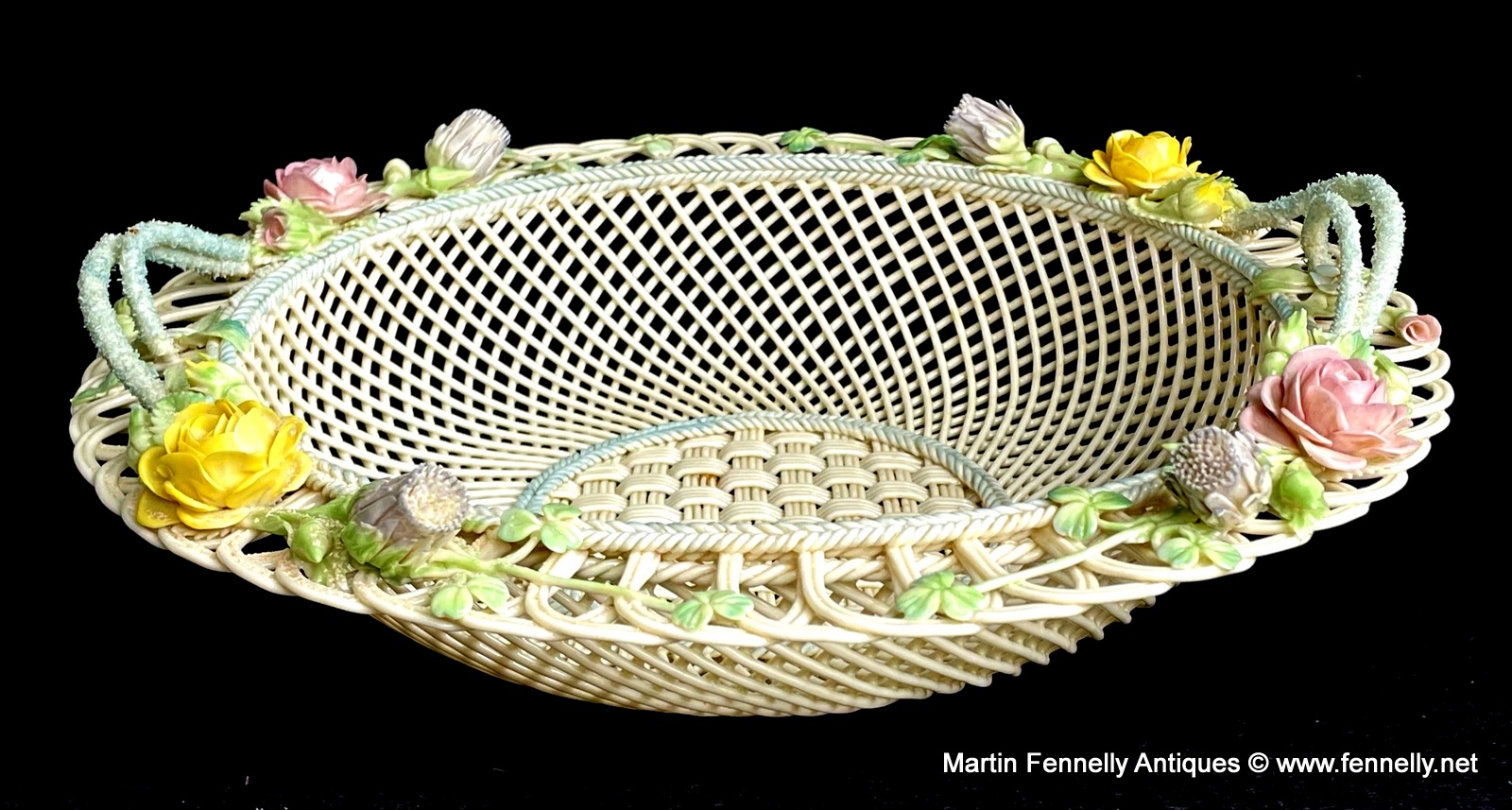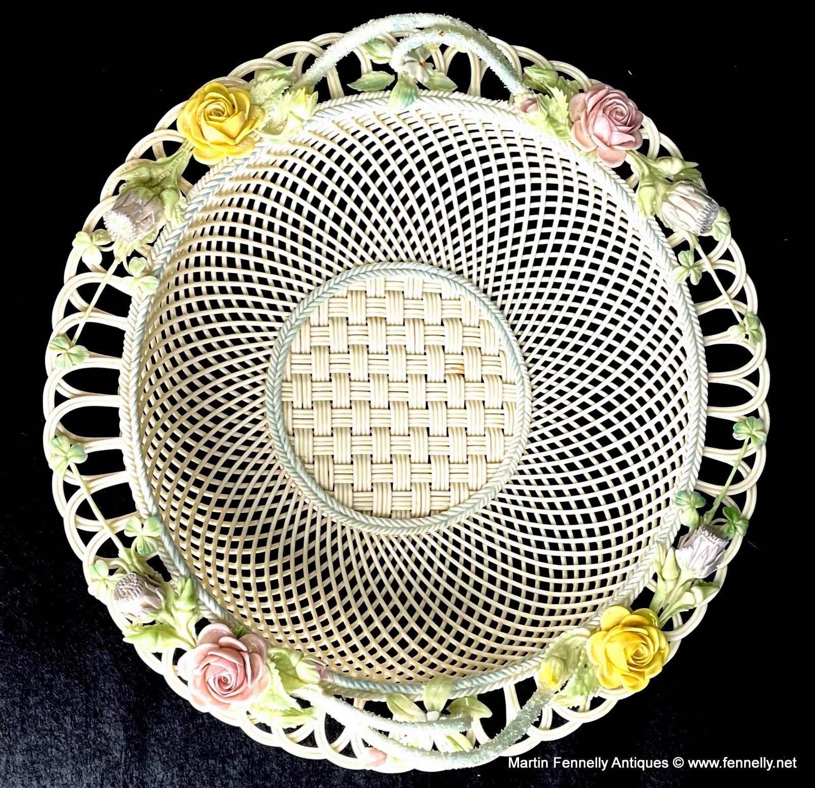 This 4 Weave Belleek Basket is a Superb example and celebration of the craft of creating masterpieces with the wonderful Belleek legacy of a great and varied design styles since the company was founded, over one hundred and sixty years ago, in 1857. This Large Irish Basket is in excellent condition and bears the impressd Mark ‘Belleek, Co. Fermanagh’. It is very much inspired from the Irish Country Garden with Roses and Shamrocks.