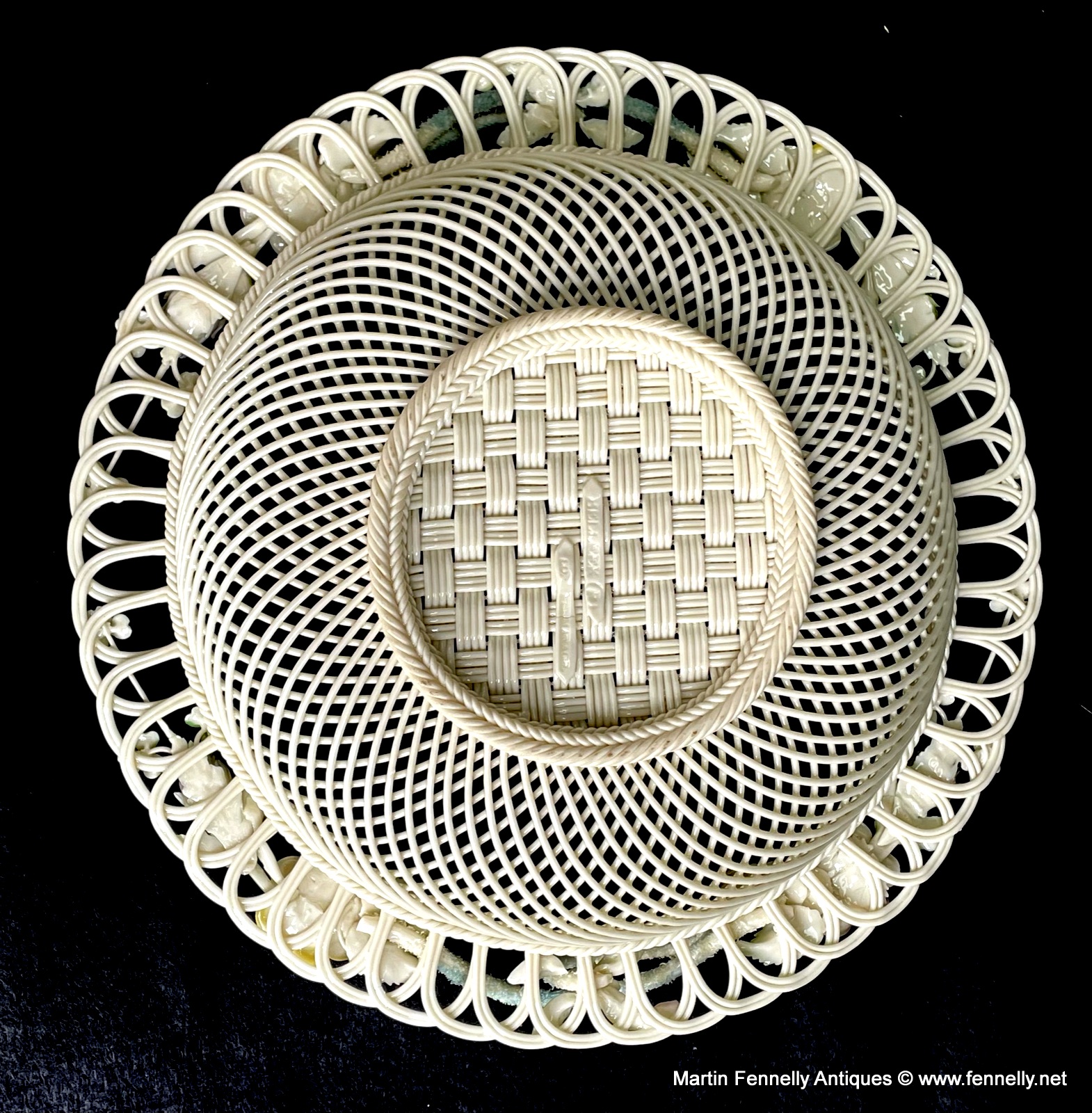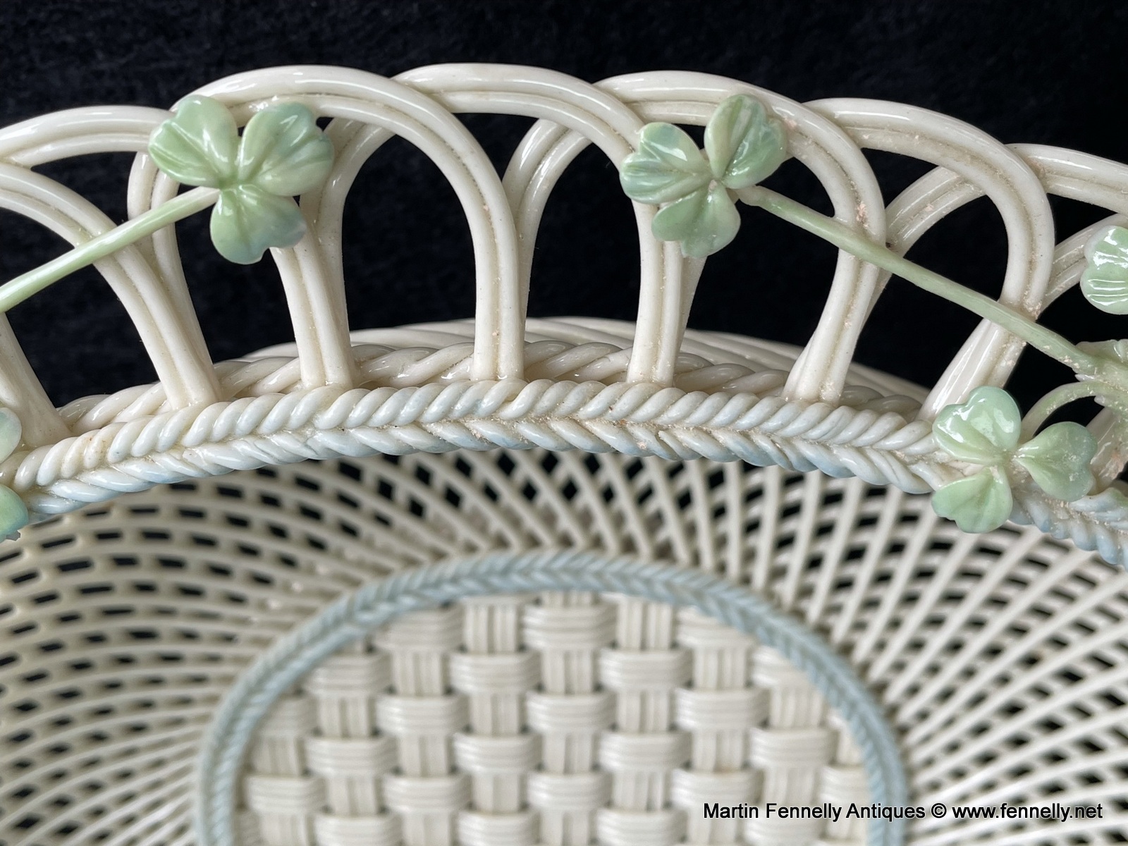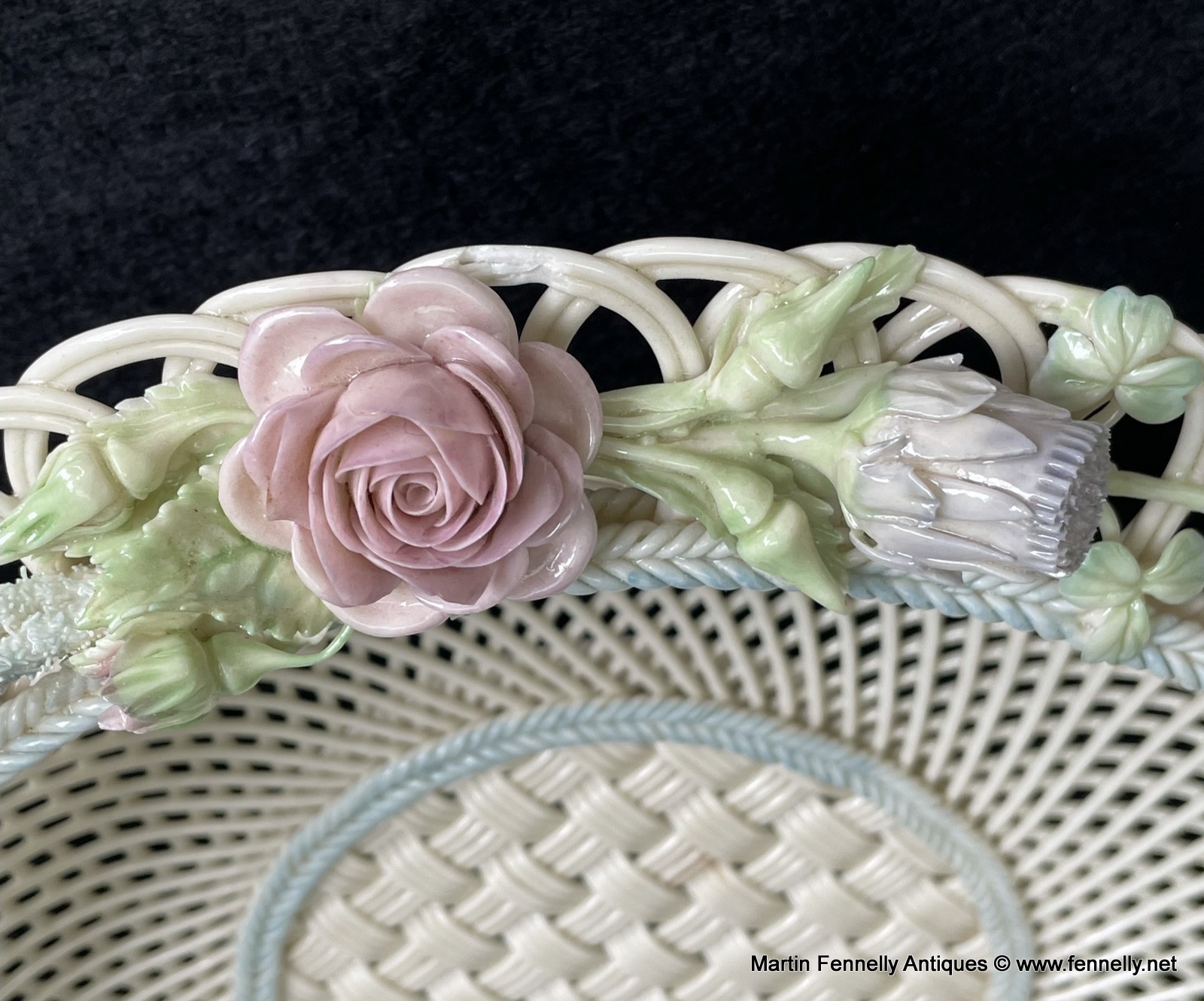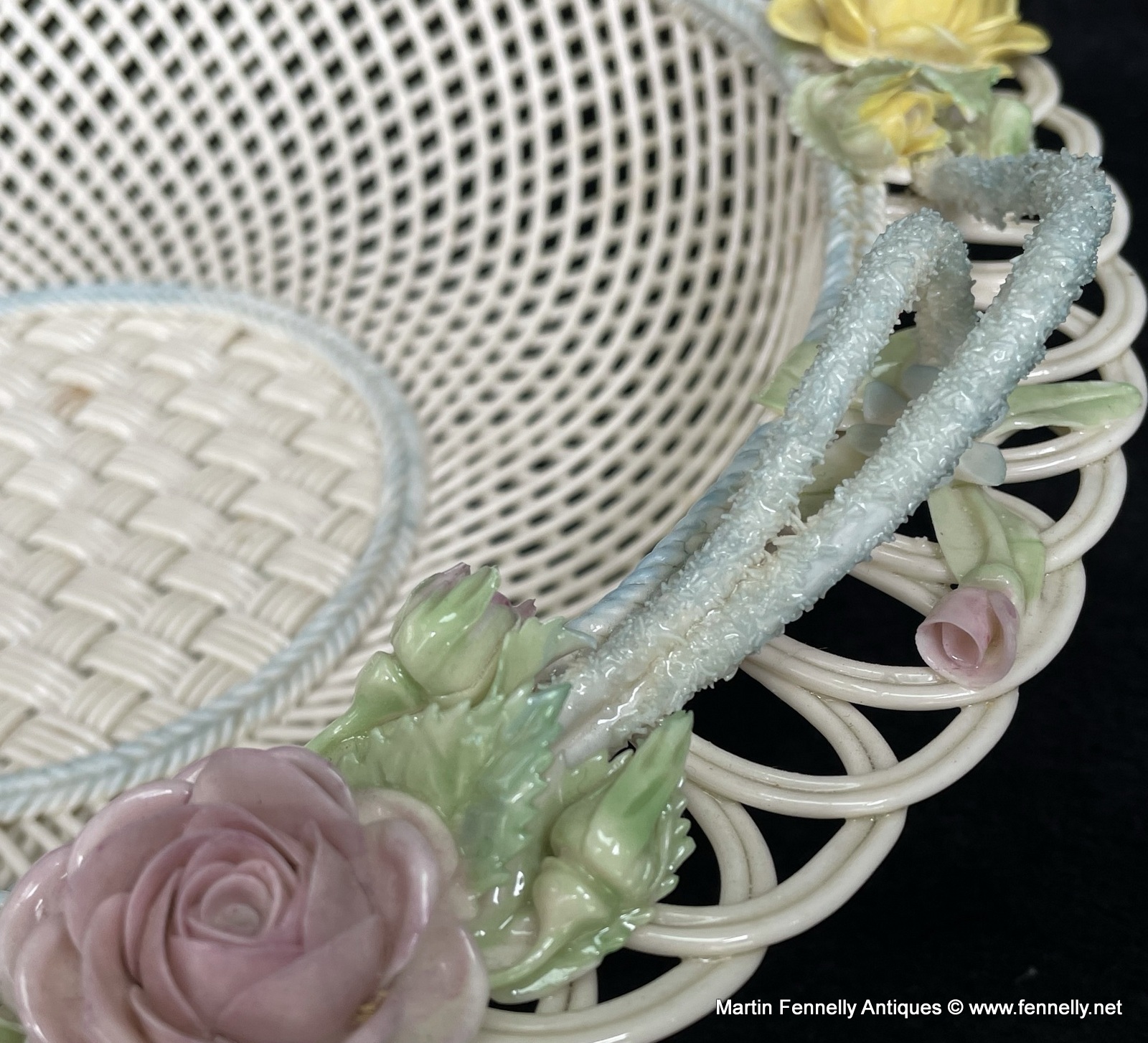 This 4 Weave Belleek Basket is a Superb example and celebration of the craft of creating masterpieces with the wonderful Belleek legacy of a great and varied design styles since the company was founded, over one hundred and sixty years ago, in 1857. This Large Irish Basket is in excellent condition and bears the impressd Mark ‘Belleek, Co. Fermanagh’. It is very much inspired from the Irish Country Garden with Roses and Shamrocks.