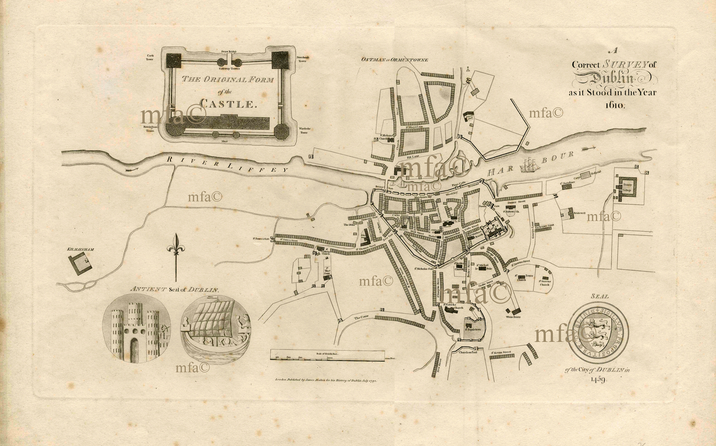 This is a wonderful reproduction (framed) of the map of Dublin from 1610 which was drawn by James Malton in the 1780s or 90s, and based on an earlier survey by John Speed in 1610. Malton (1761–1803) is perhaps best known for his "Views of Dublin", but what Lawrence captured here was a folio Malton created that was included in the book "History of the City of Dublin: From the Earliest Accounts to the Present Time". This Map would make the perfect Christmas Gift and unframed is €70 (shipping available)