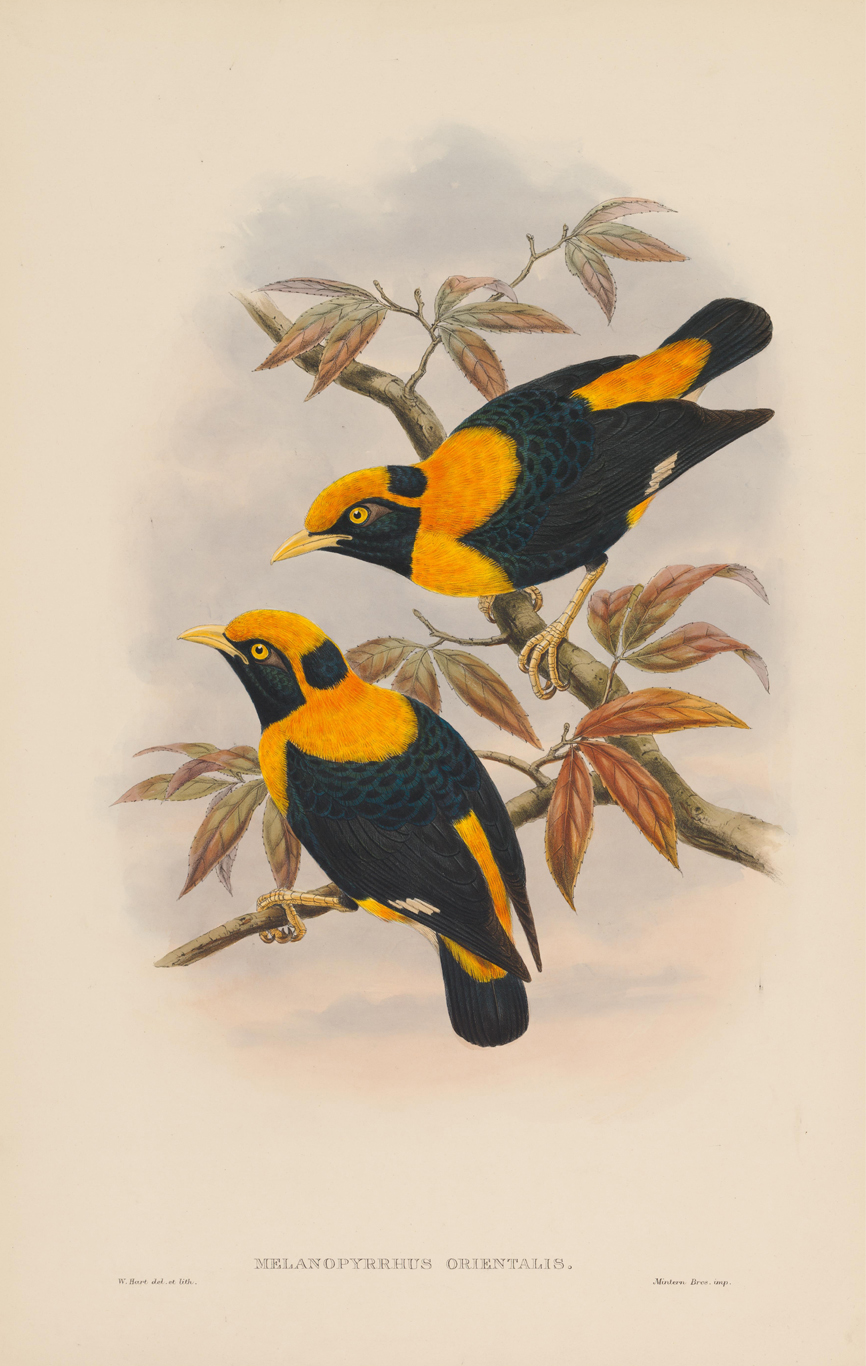 Set of 12 Framed Engravings after the originals from the first edition of Goulds Birds of New Guinea and the adjacent Papuan Islands from 1875-1888 printed by Henry Sotheran and Co. of London and Published by R Bowdler Sharpe (after Gould’s death). This set are all in excellent condition and make for a striking view. 1, Bruijn’s Bird of Paradisa 2, Banded Lory 3, Broad Billed Flycatcher 4, Ramsay’s Thickhead 5, Orange Chested Starling 6, Golden Winged Bird of Paradise 7, Robertson’s Starling 8, Tenimber Parrot 9, Pectoral Lorikeet 10, Blue Thighed Lory 11, PapuanYellow Flycatcher 12, Marquis de Raggi’s Bird of Paradise