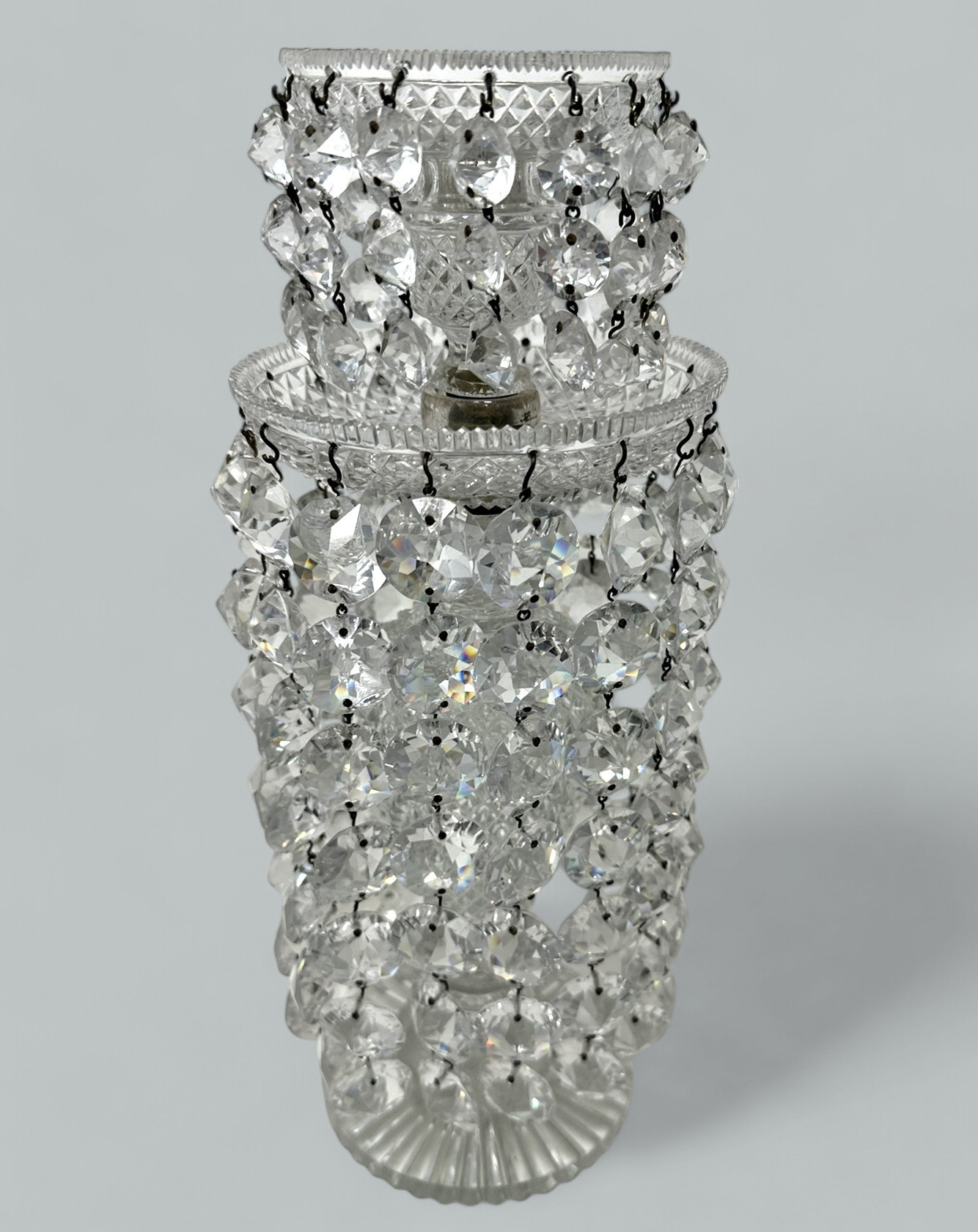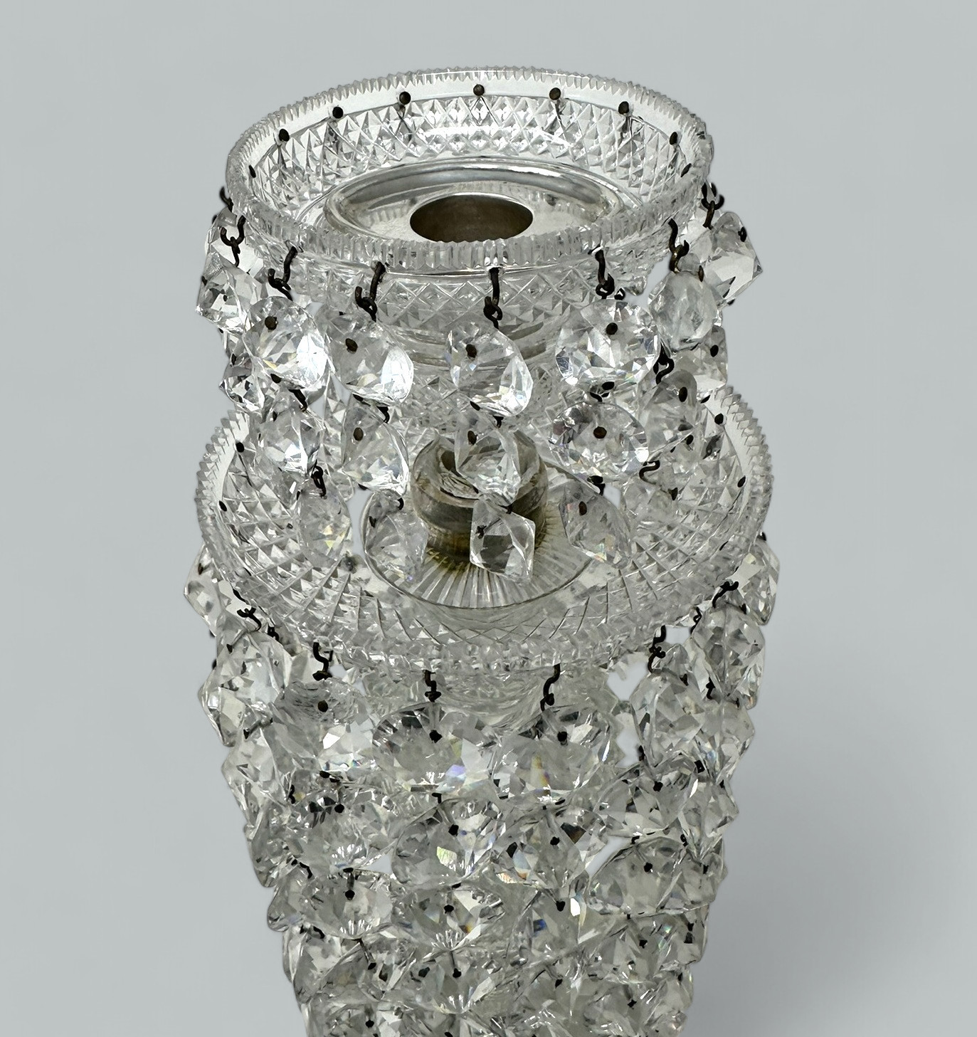 The elegant cut crystal urn formed nozzles above a circular diamond cut crystal tray suspended with an impressive sixteen lengths of crystal decorative buttons.