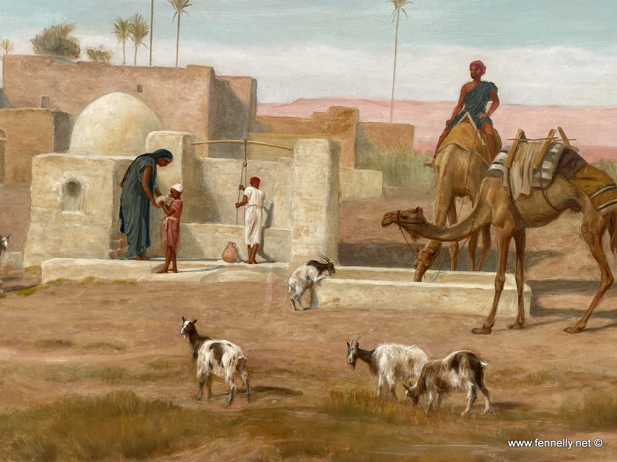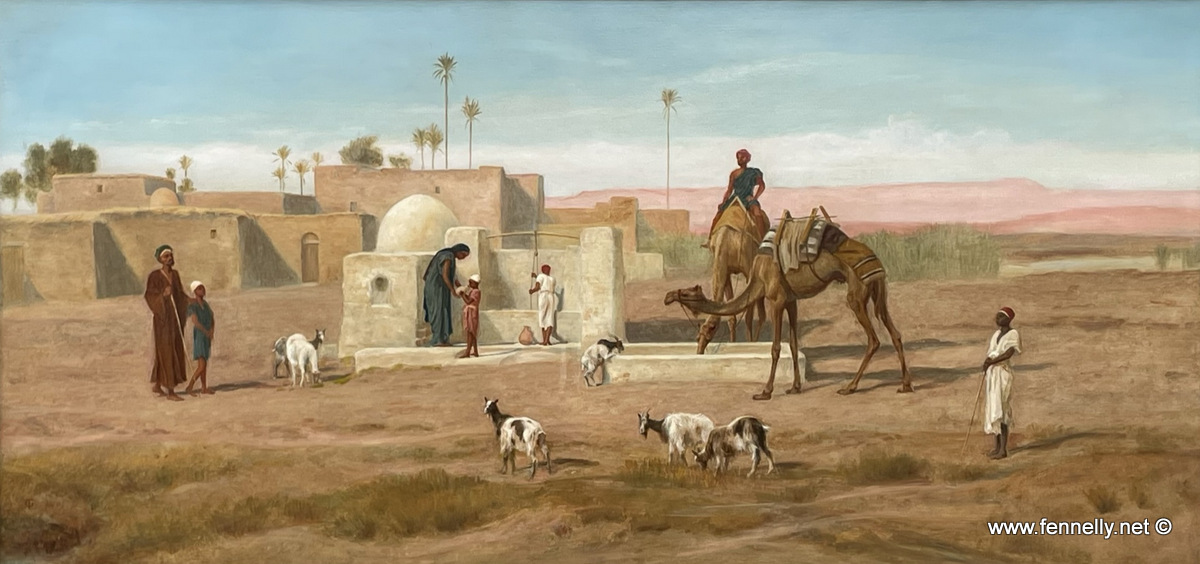 This Large Oil on Canvas ‘Bedouin Oasis’ by Frederick Goodall (UK) 1822-1904 is a stunning painting and in the original gilt frame. Frederick Goodall is an artist of significant fame and his works are exhibited in some of the most important Art Galleries and Museums in the world. Goodall visited Egypt twice; in 1858 and again in 1870, both times travelling and camping with Bedouin tribesmen. On his second visit in 1870, he lived at Saqqara, near the Pyramids with the aim of directly observing Bedouin lifestyles. After his return to England (when this painting was executed in 1877), Goodall painted some beautiful Egyptian themed paintings and this is one. The Egyptian theme was prominent in his work, with 170 paintings being exhibited at the Royal Academy over 46 years.