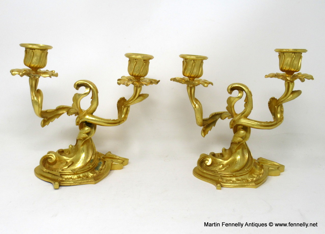Each with central rococo style finial and two scrolling leafy out swept arms above a central naturalistic stem ending on an ornate shaped base.