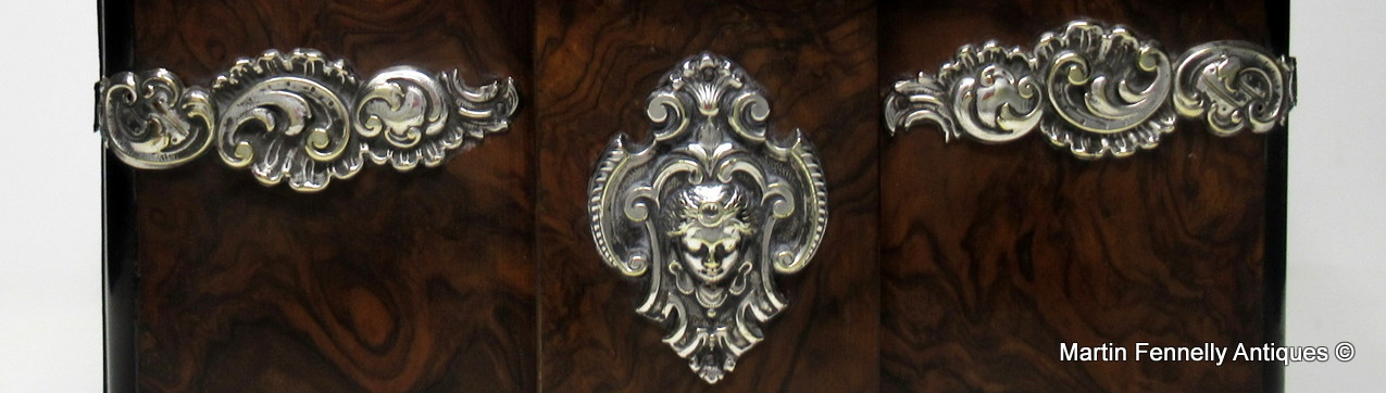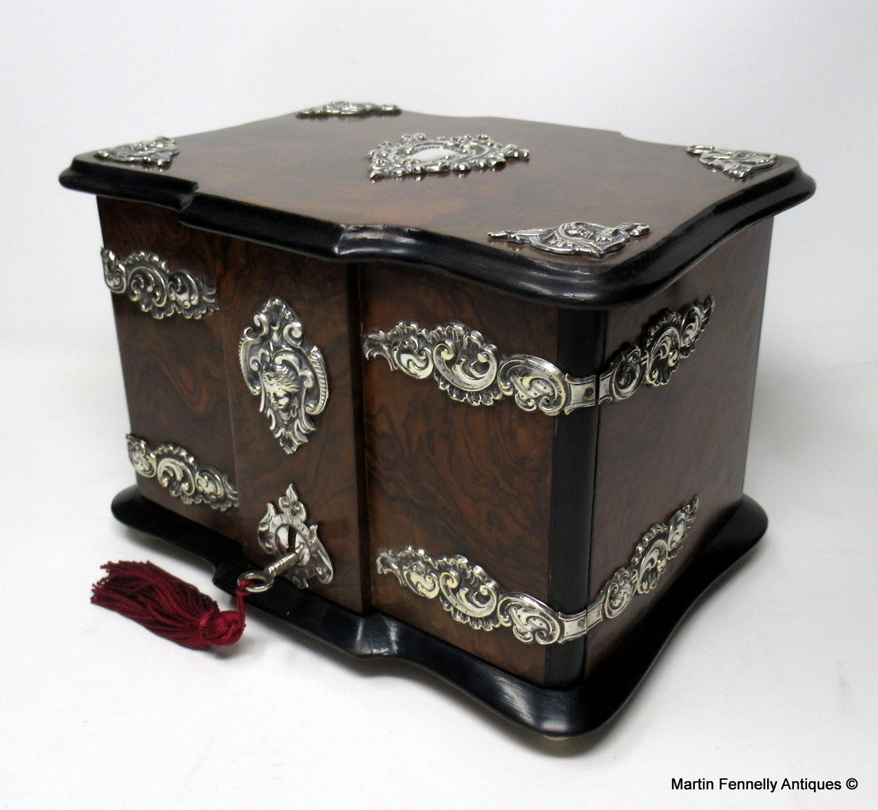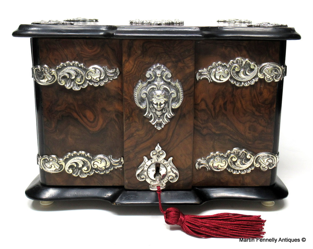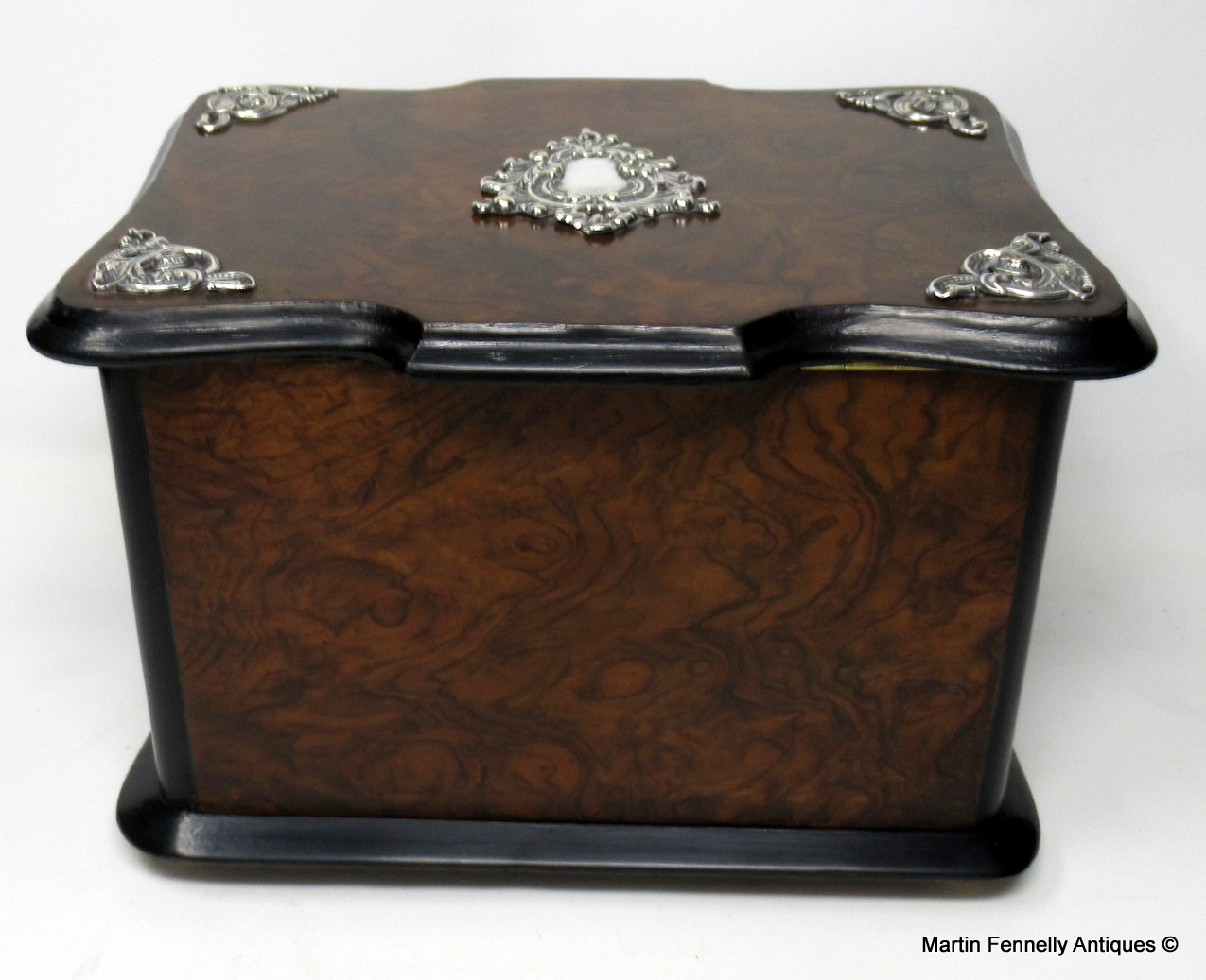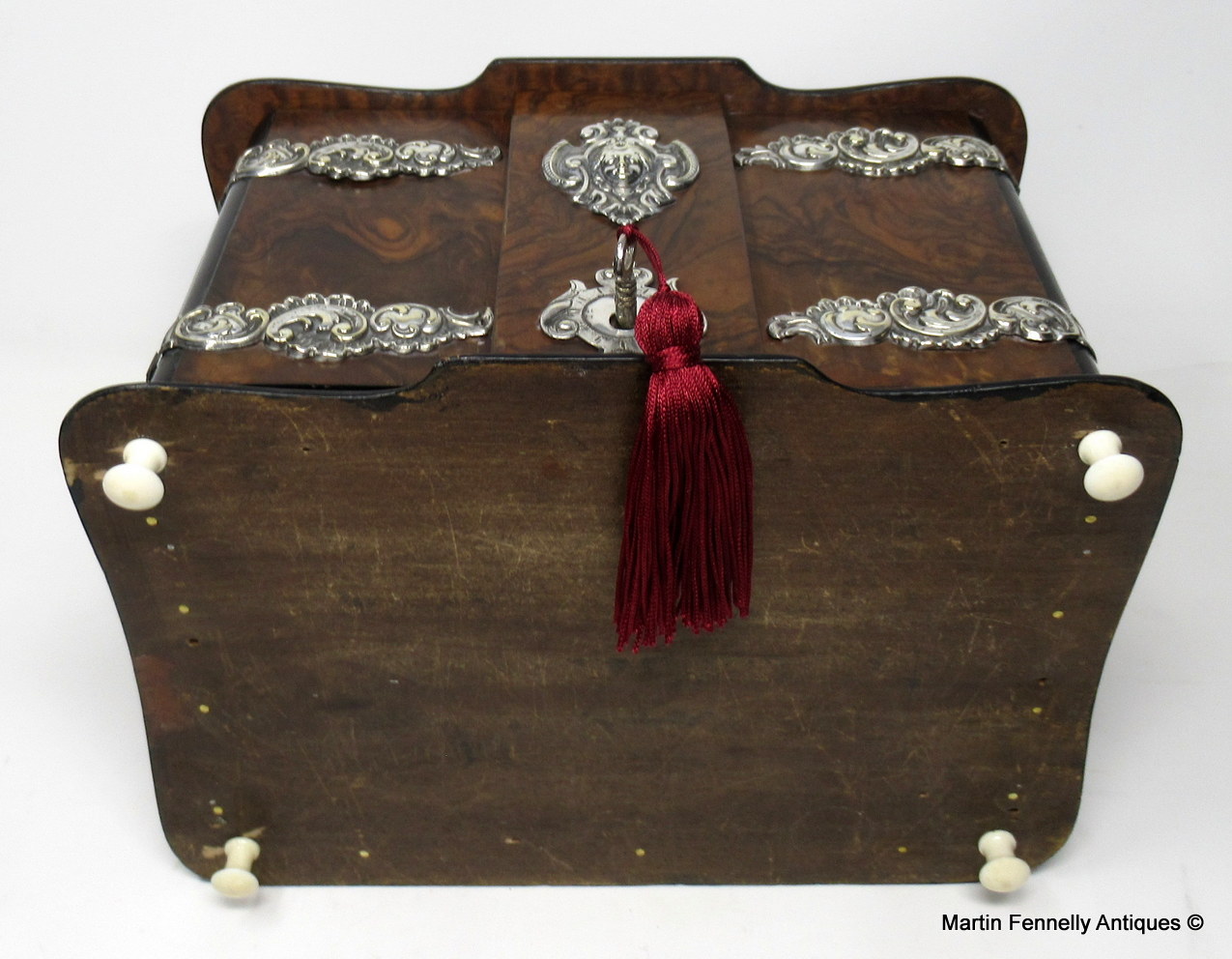 The outer case decorated with silver-plated lavish cast decorative mounts. The hinged lid opening to reveal its original shelves. The Box rests on four Tagua Nut (vegetable Ivory) feet.
